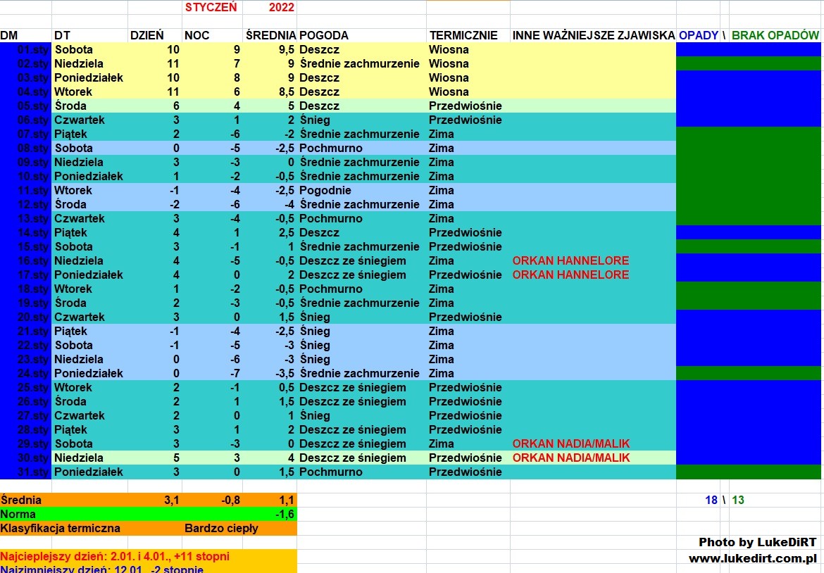 Zauważyłem, że w kwestiach klasyfikacji pór roku patrzysz w przyszłość: tzn. początek stycznia oceniłeś jako termiczną wiosnę, chociaż, jeśli chodzi o aspekt zarówno astronomiczny jak i meteorologiczny, to jest to bez wątpienia jeszcze pierwsza połowa sezonu. W kwestii temp. i pogody myślę, że 1 poł. miesiąca u mnie podobnie wyglądała, zaś 2 była chłodniejsza. Największym zaskoczeniem dla mnie było, że ten orkan Hannelore paradoksalnie jedynie na chwilę przyniósł widoczną pokrywę śnieżną, większych efektów tutaj doczekałem się trochę później, w okolicach Dnia Babci i Dziadka.