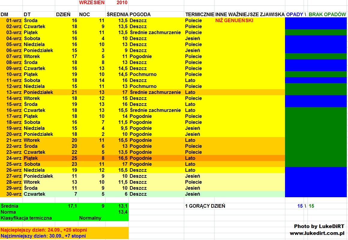 Otarciem łez był tylko okres od 20 do 25 września. Wtedy, po niemal miesiącu, wróciło Słońce. Pierwsza część tego okresu była niestety chłodna, głównie nocami zbliżającymi się do przymrozku, jednak dni 23-25 września, to już super czas. Ostatni z tych dni (sobota) miał dodatkowo bardzo ciepłą, prawdziwie letnią noc z TMin 15,8. Poranek był słoneczny i mniej więcej do 14-tej trwała sielanka, jednak kiedy się zachmurzyło, to znając prognozy i wiedząc że znowu wróci zimnica i deszcz, zrobiło mi się tak serio smutno. Powody ku temu były, bo końcówka września przywróciła całkowity loch i niskie temperatury spadające w deszczu do wartości niewiele powyżej 10 stopni. 30 września 2010 to dzień patologiczny, który pamiętam za sprawą tego, że wydawało mi się, że za chwilę spadnie śnieg, tak strasznie zimno było. Maksymalnie 8,8 stopnia w ciągu dnia i lodowata mżawka były dobiciem dla tego paskudnego miesiąca, który na 3,5 miesiąca przed końcem roku przypieczętował jego rekordową sumę opadów, przy okazji samemu bijąc rekord wynikiem 152,9 mm. Ze średnią temperaturą równą 12,5 stopnia był trzecim najzimniejszym w XXI wieku, a ze średnią temperaturą maksymalną 17,1 był jeszcze "lepszy" zajmując trzecie miejsce w całym okresie post-lodowcowym (po 1980 roku). Jego absolutna temperatura maksymalna wyniosła 23 stopnie, a to również jeden z najwybitniejszych osiągów - niższy miał tylko wrzesień 1696! Usłonecznienie - siąść i płakać. 87 godzin, z czego 49 w sześć dni od 20 do 25 września. Czwarte miejsce od końca, ale do podium brakło niewiele.