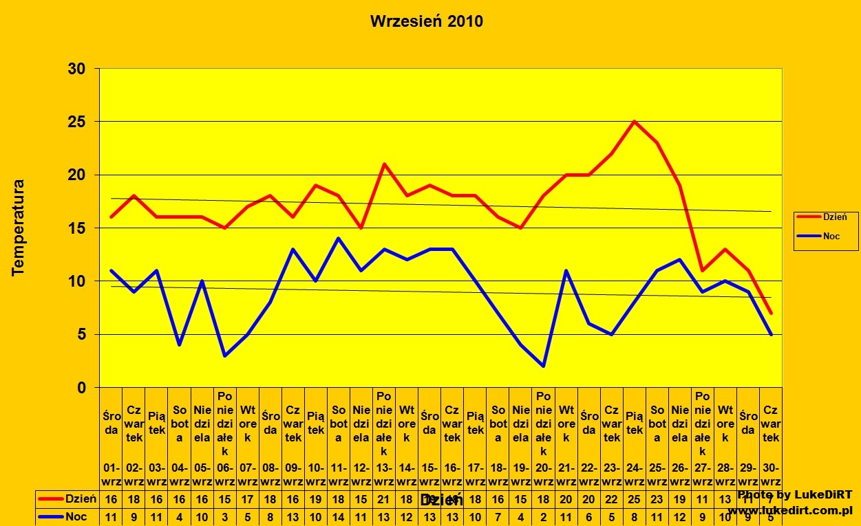 Wrzesień ten zapamiętałem jako przeciętny z powodu dużej ilości deszczowych dni oraz niskich temperatur. Jednak, gdy teraz patrzę na te moje wykresy, to mimo wszystko nie przez cały miesiąc było tak tragicznie - okres od 17 do 25 dnia miesiąca był udany. Później pogoda znowu się pogorszyła, a ostatniego dnia miesiąca aura była wręcz listopadowa.
