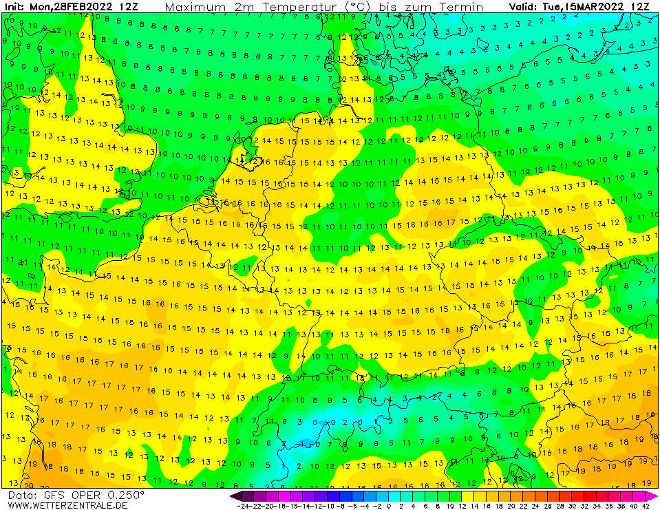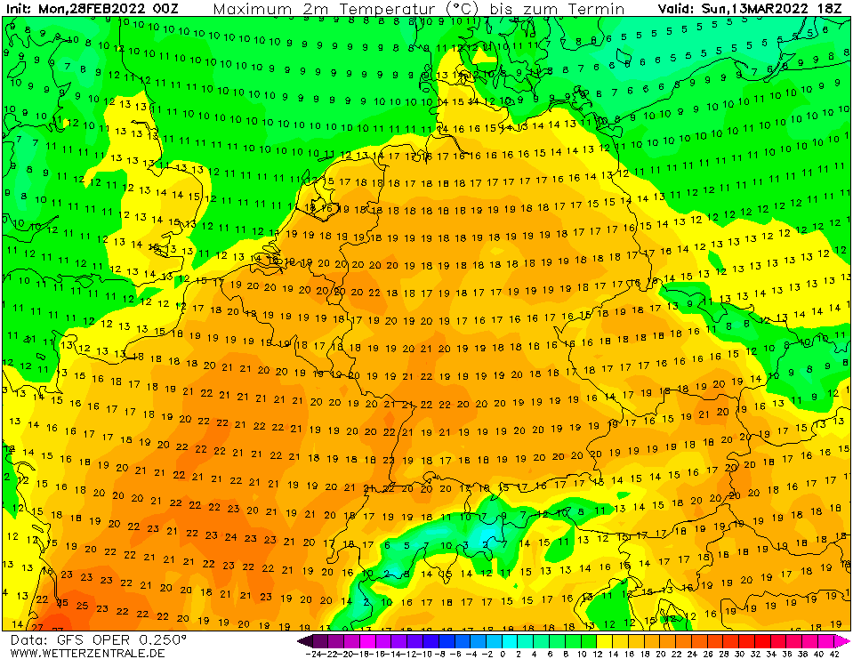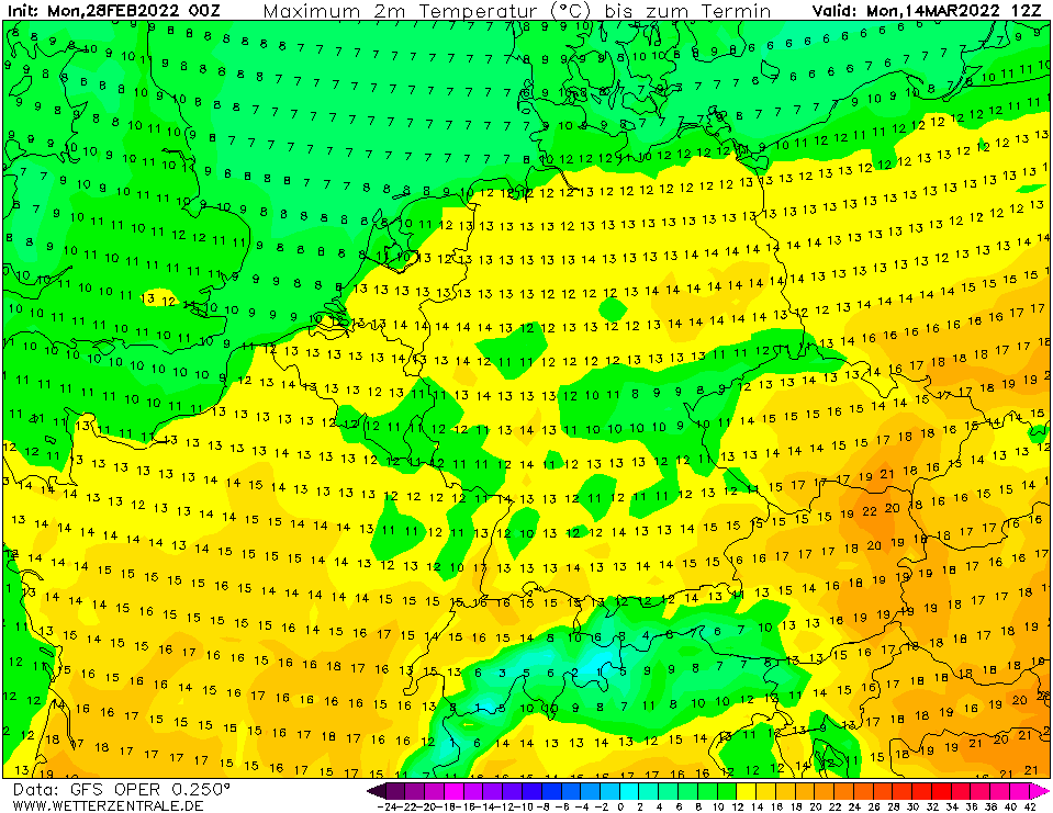To jest moim zdaniem klasyczny scenariusz, jeśli pogoda ma pozostać w obrębie Polski "wyżowa": południe i zachód mają wyższe temp. dzienne od północy i wschodu. ;-) W dodatku można powiedzieć, że temp. są wszędzie w miarę "marcowe" (może na południowym-zachodzie PL, wzdłuż linii rzeki Odra na odcinku: Racibórz-Opole-Wrocław jest trochę bliżej kwietnia). ;-)