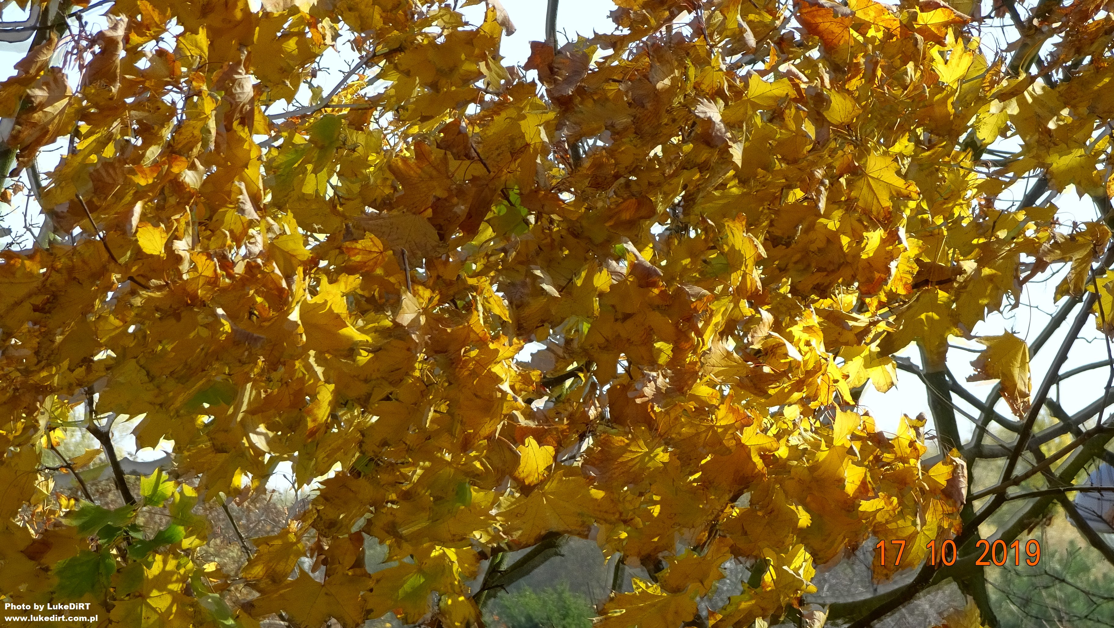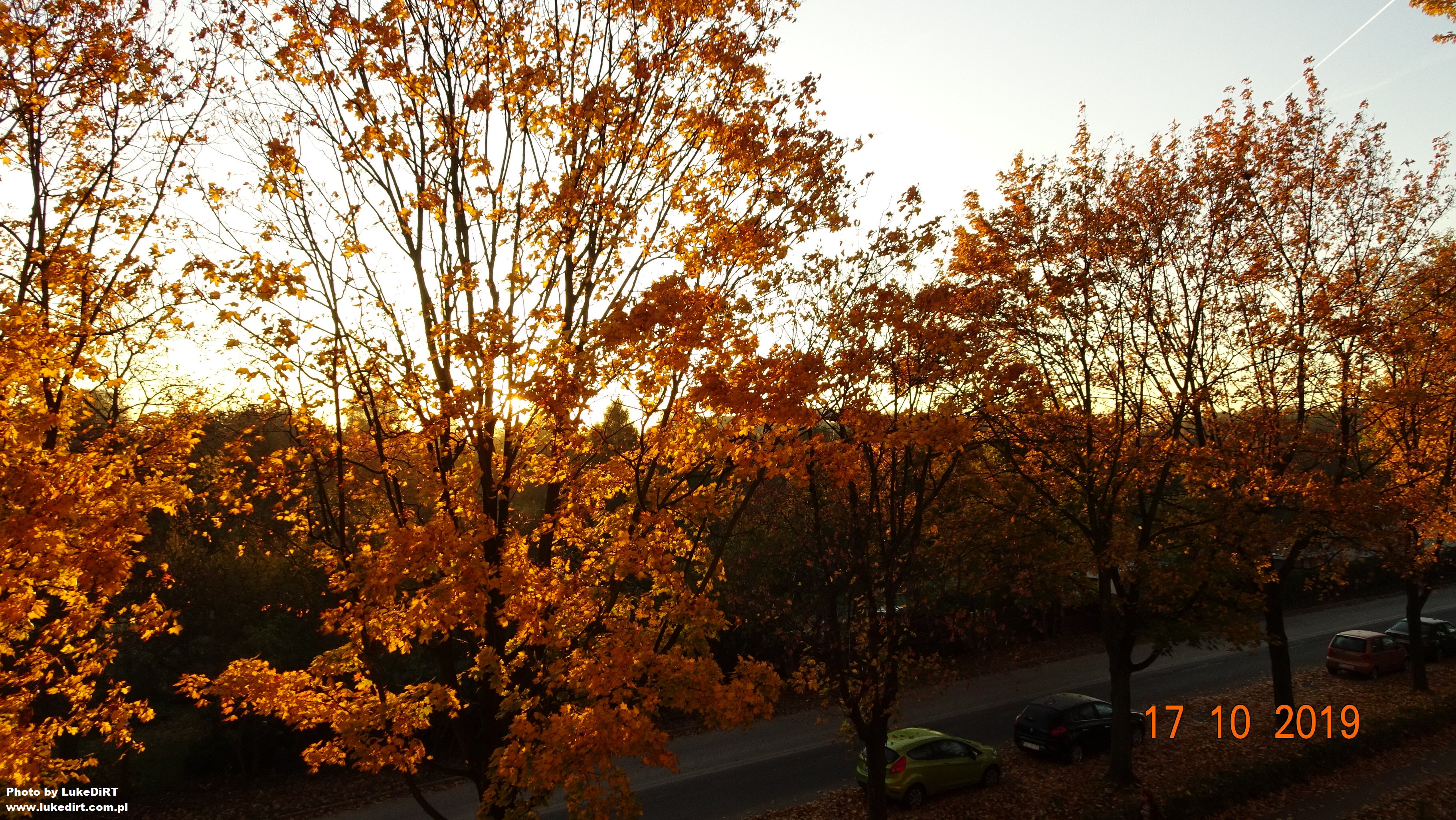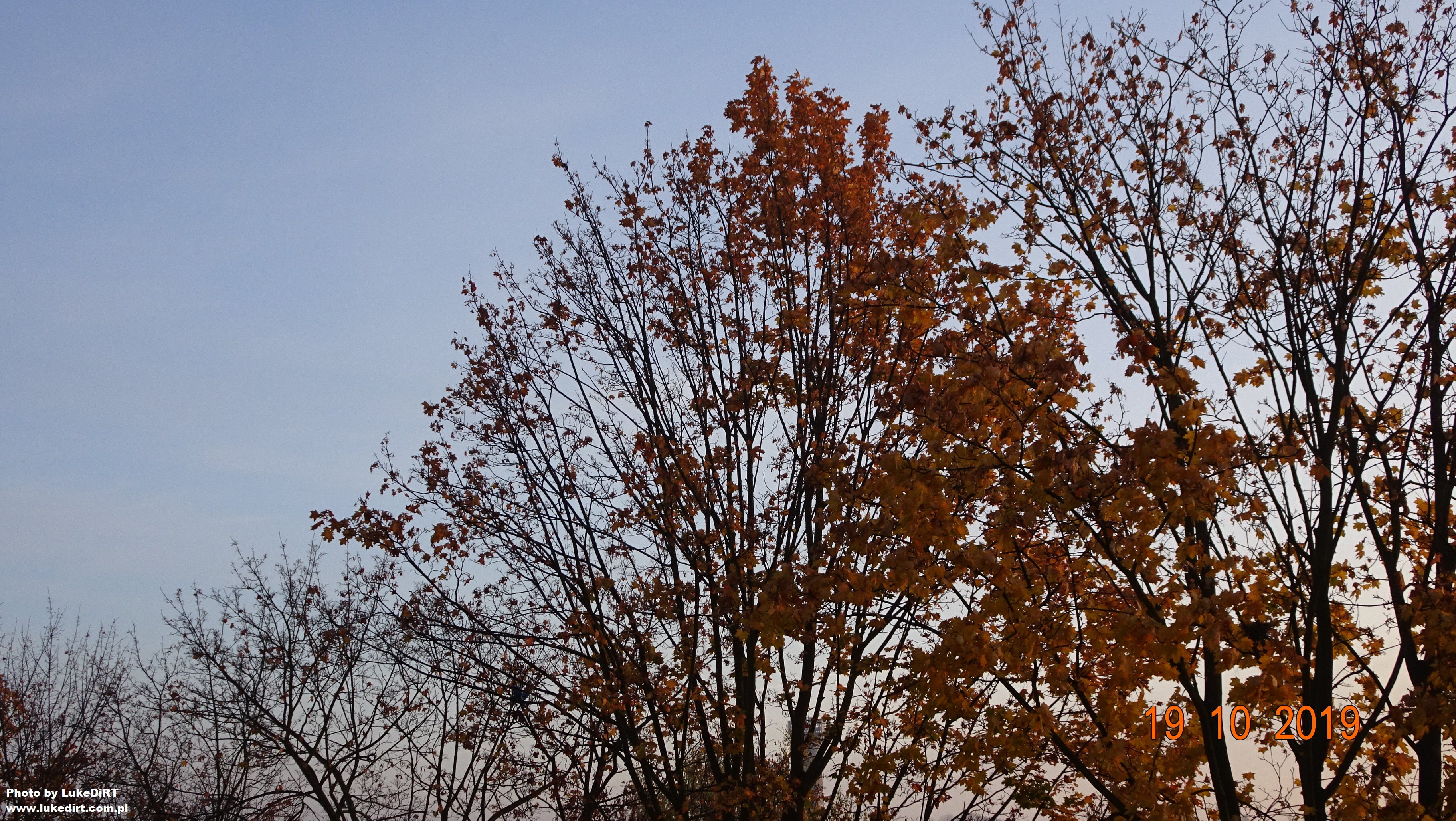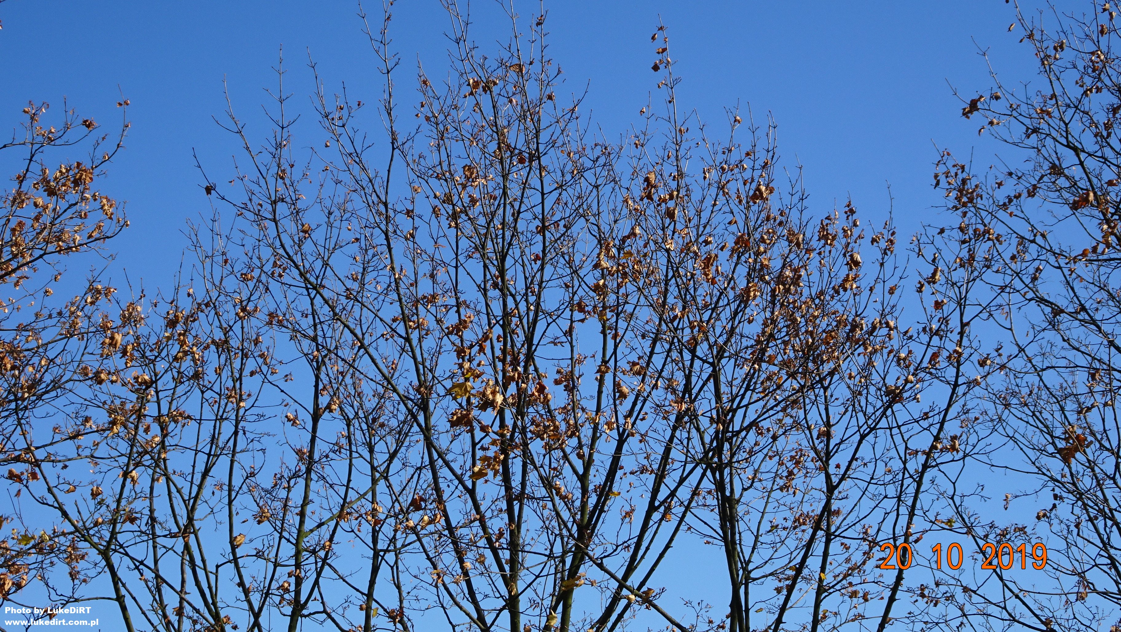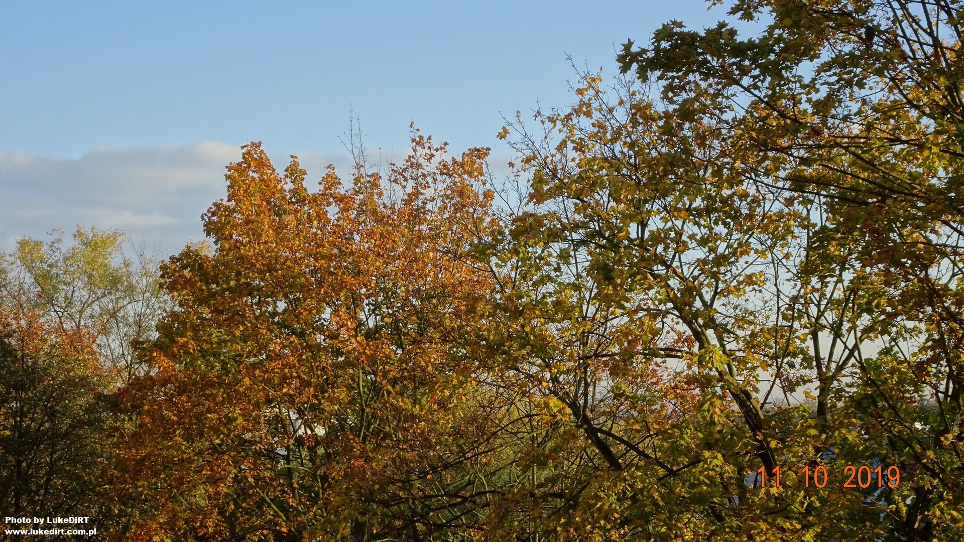 Druga część postępów jesieni w mojej okolicy, zdjęcia sprzed chwili 11 października 2019. Jak widać, chłód ostatniego tygodnia, a nawet znaczny mróz w nocy z wtorku na środę nie poruszył zbytnio dębowych liści. Orzech jest już natomiast niemal zupełnie ogołocony, także czereśnia została znacznie przerzedzona.