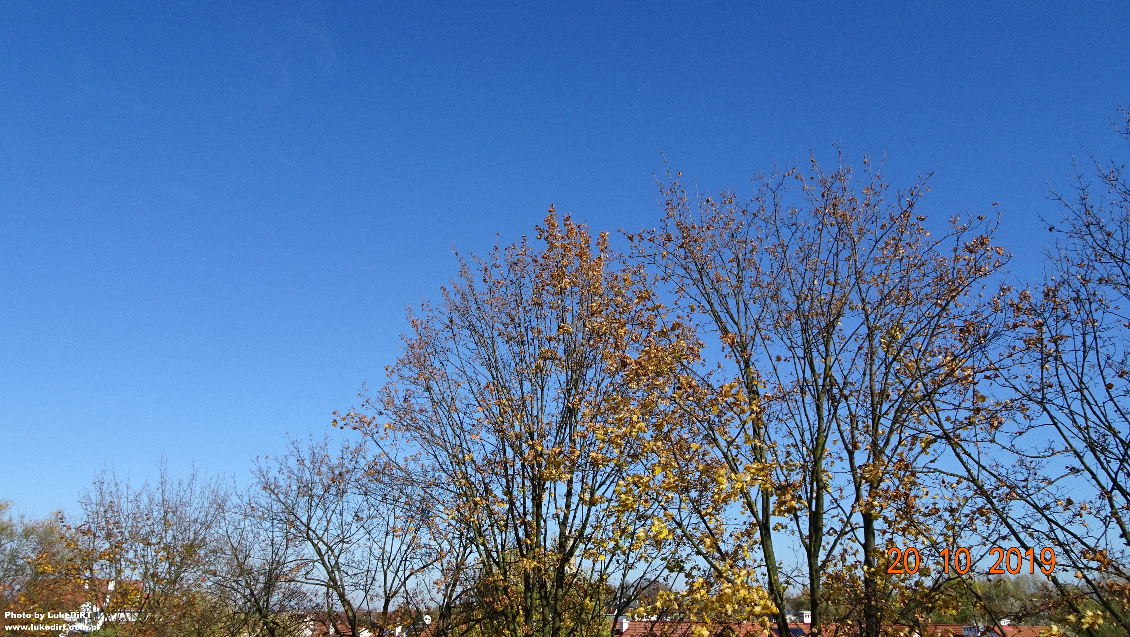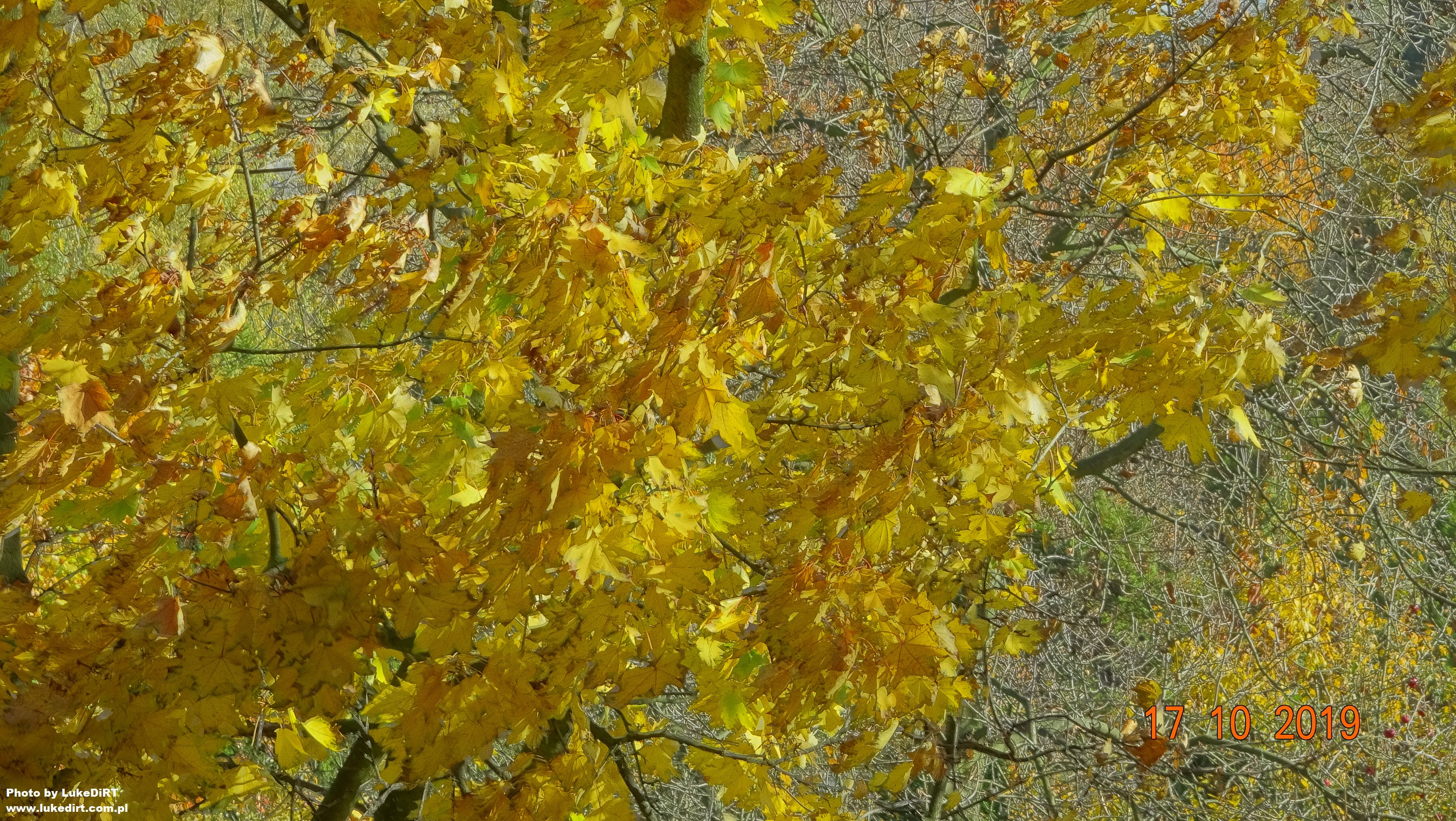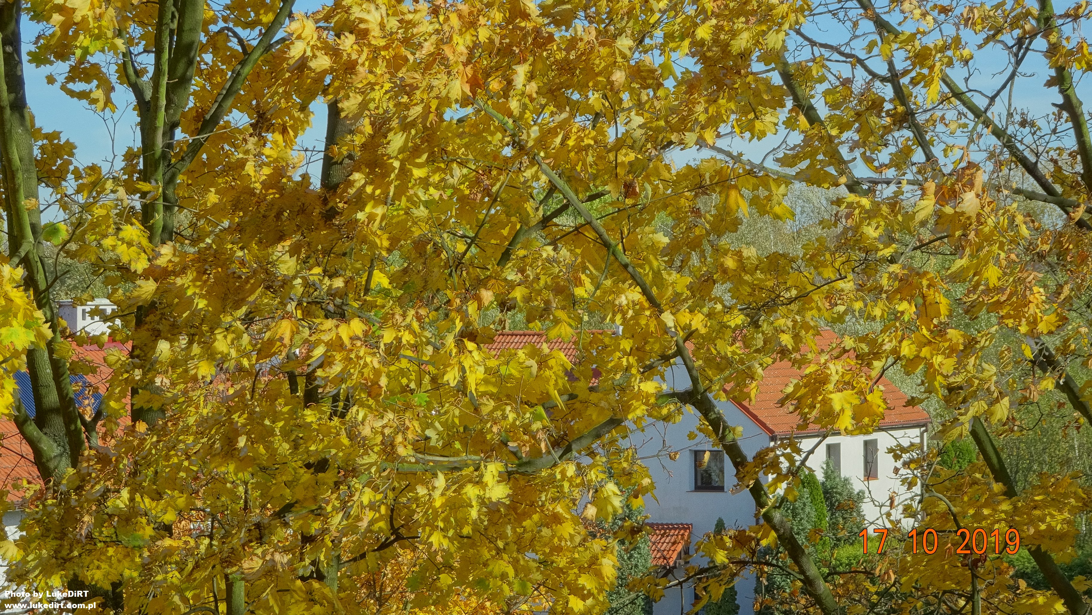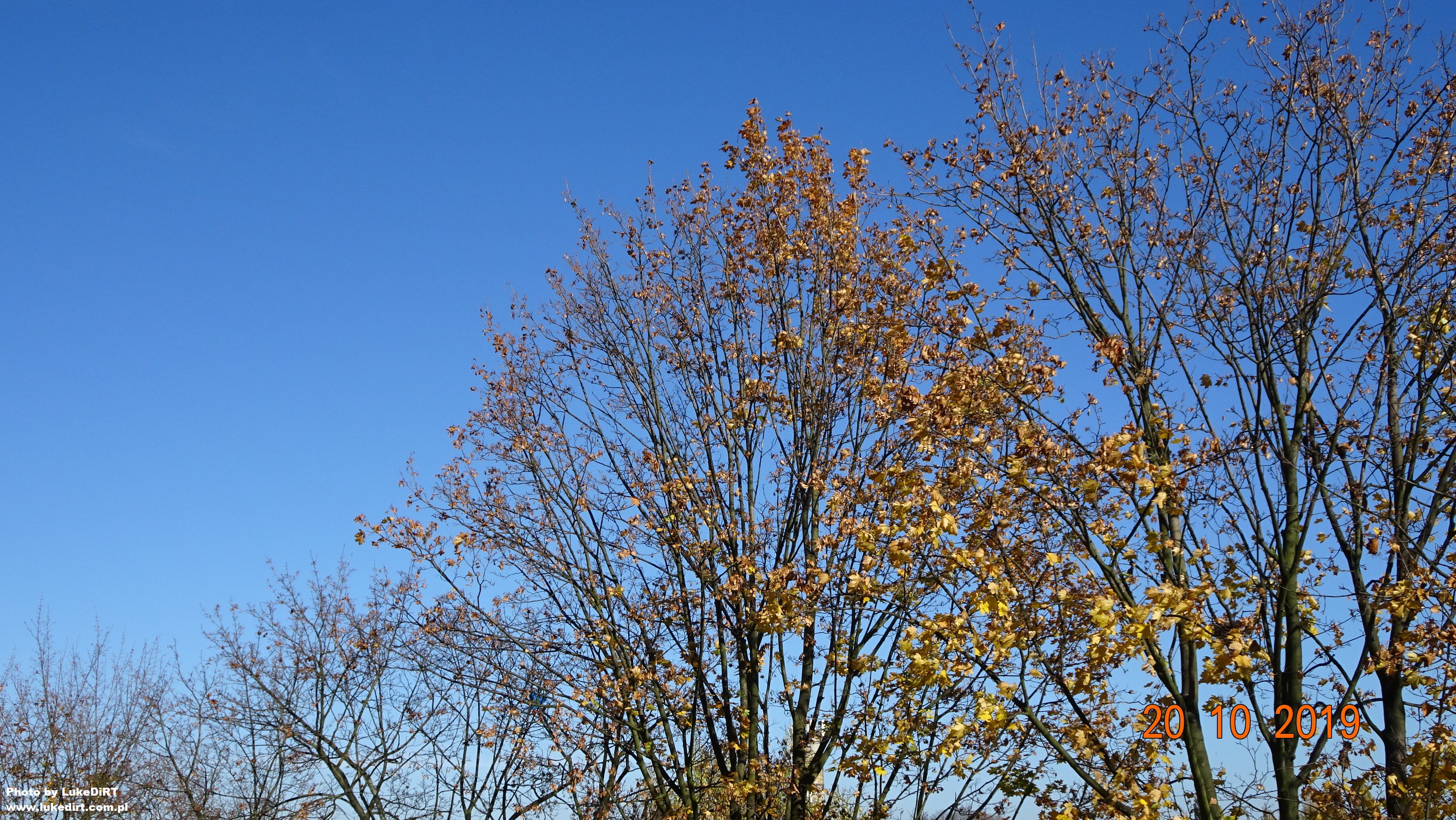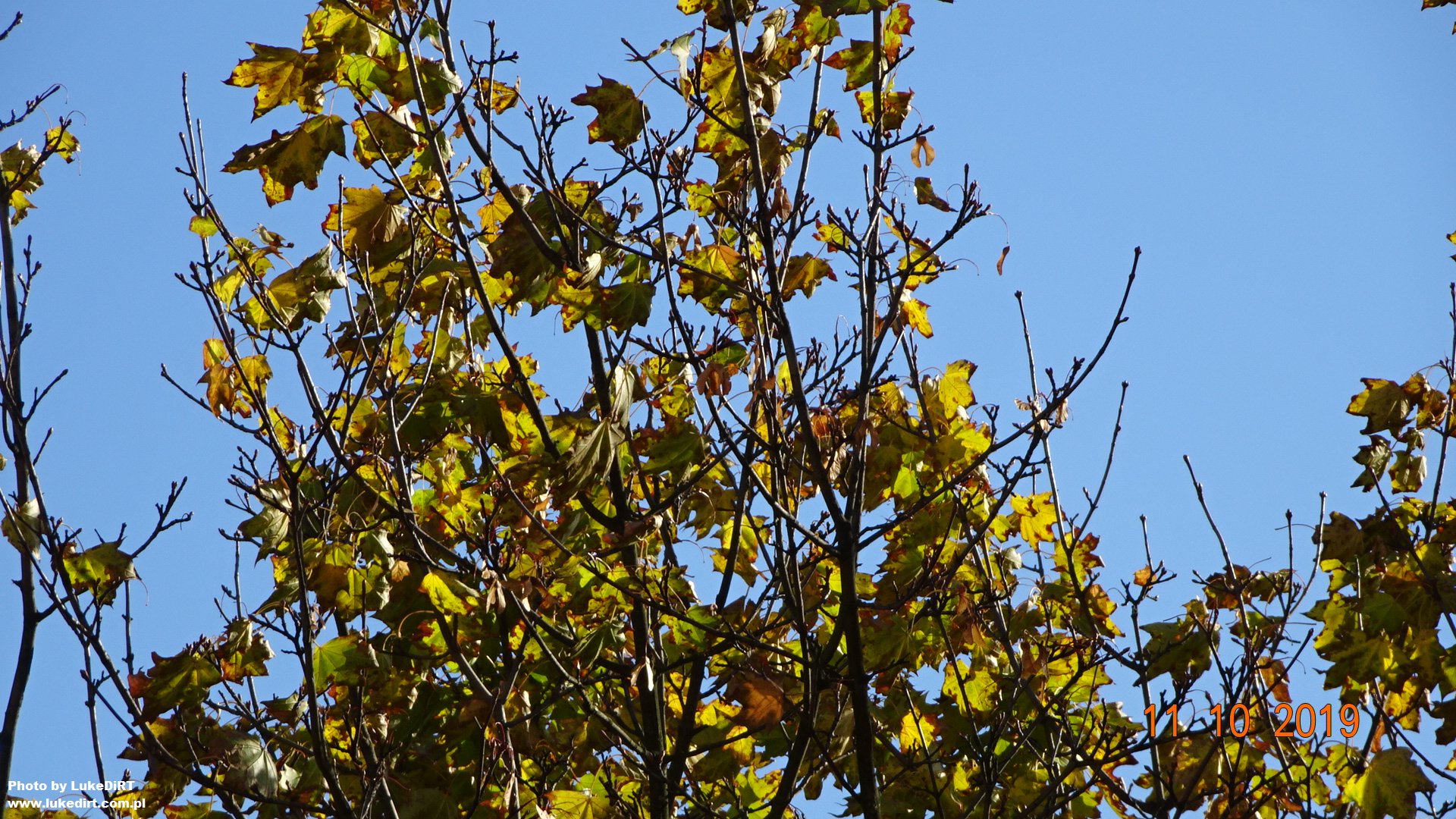 Druga część postępów jesieni w mojej okolicy, zdjęcia sprzed chwili 11 października 2019. Jak widać, chłód ostatniego tygodnia, a nawet znaczny mróz w nocy z wtorku na środę nie poruszył zbytnio dębowych liści. Orzech jest już natomiast niemal zupełnie ogołocony, także czereśnia została znacznie przerzedzona.