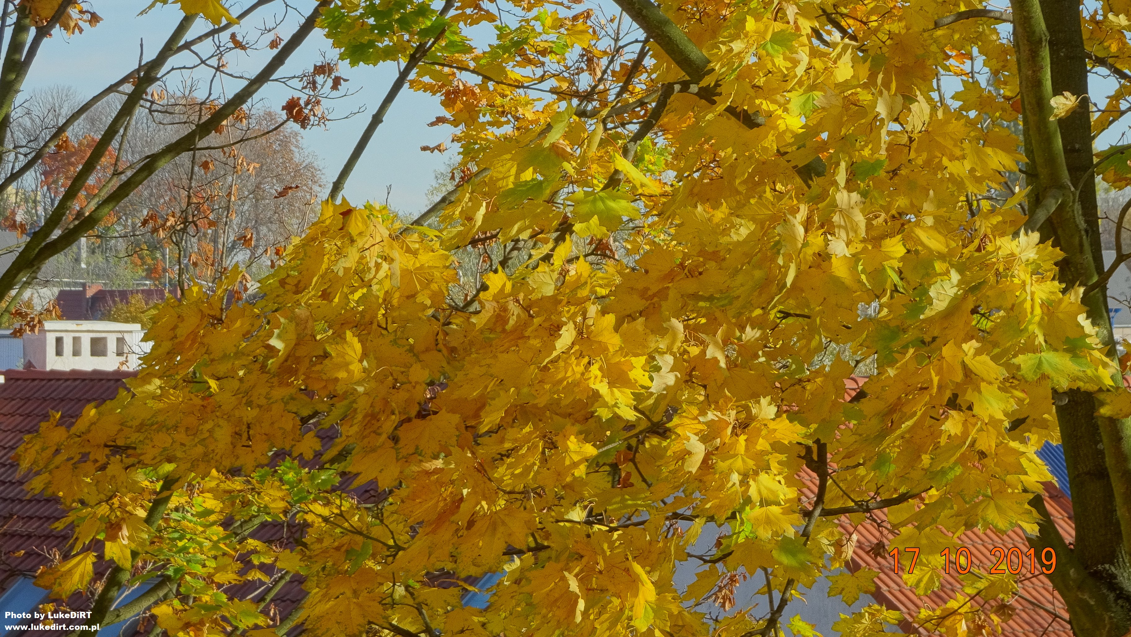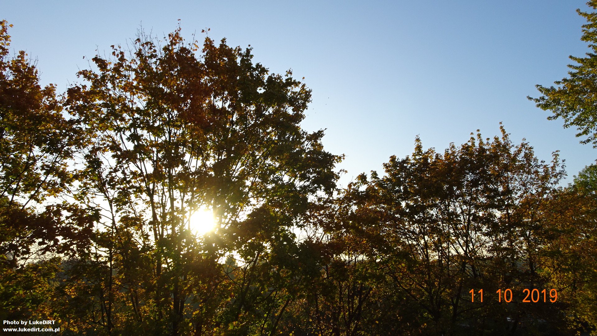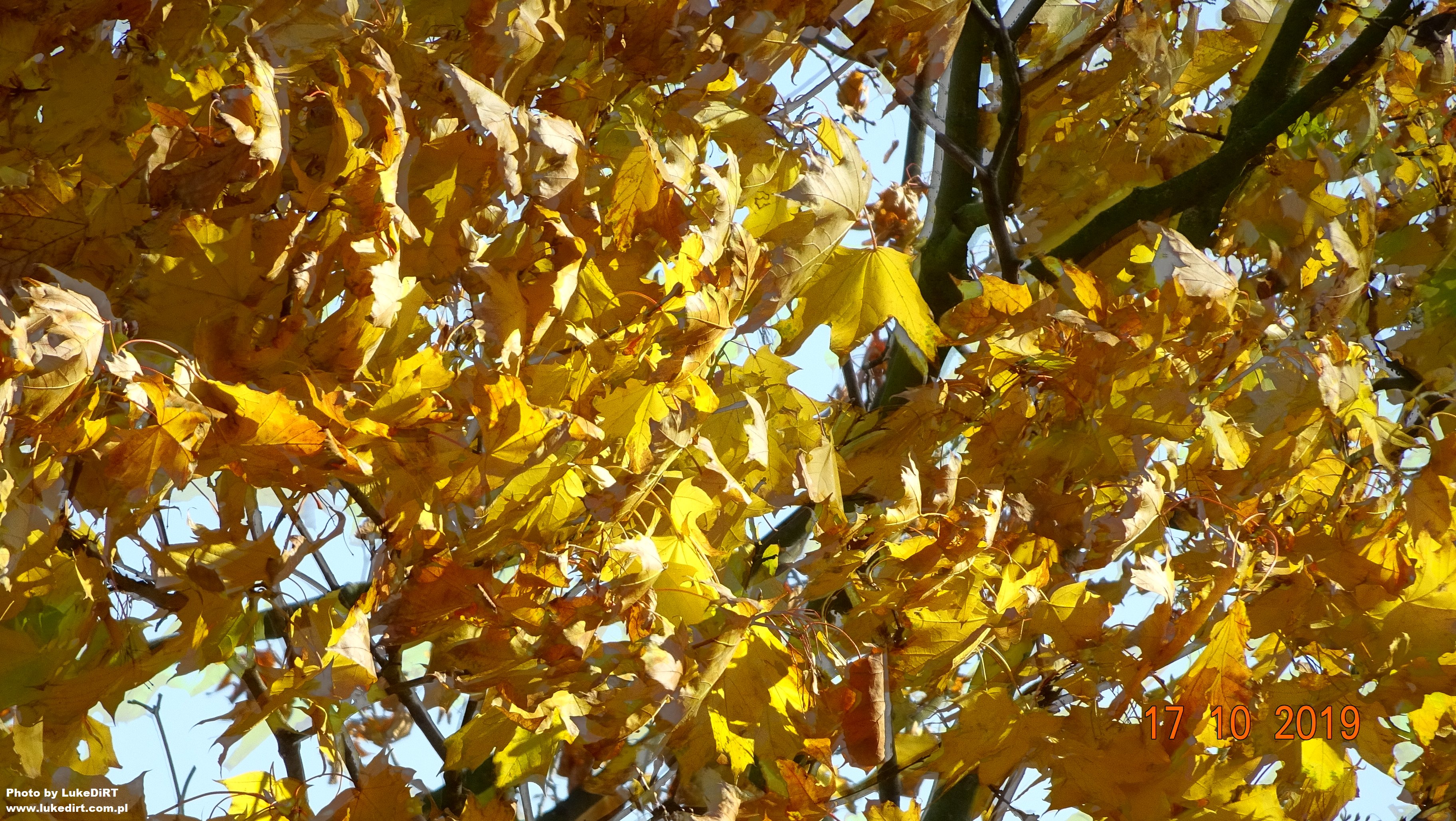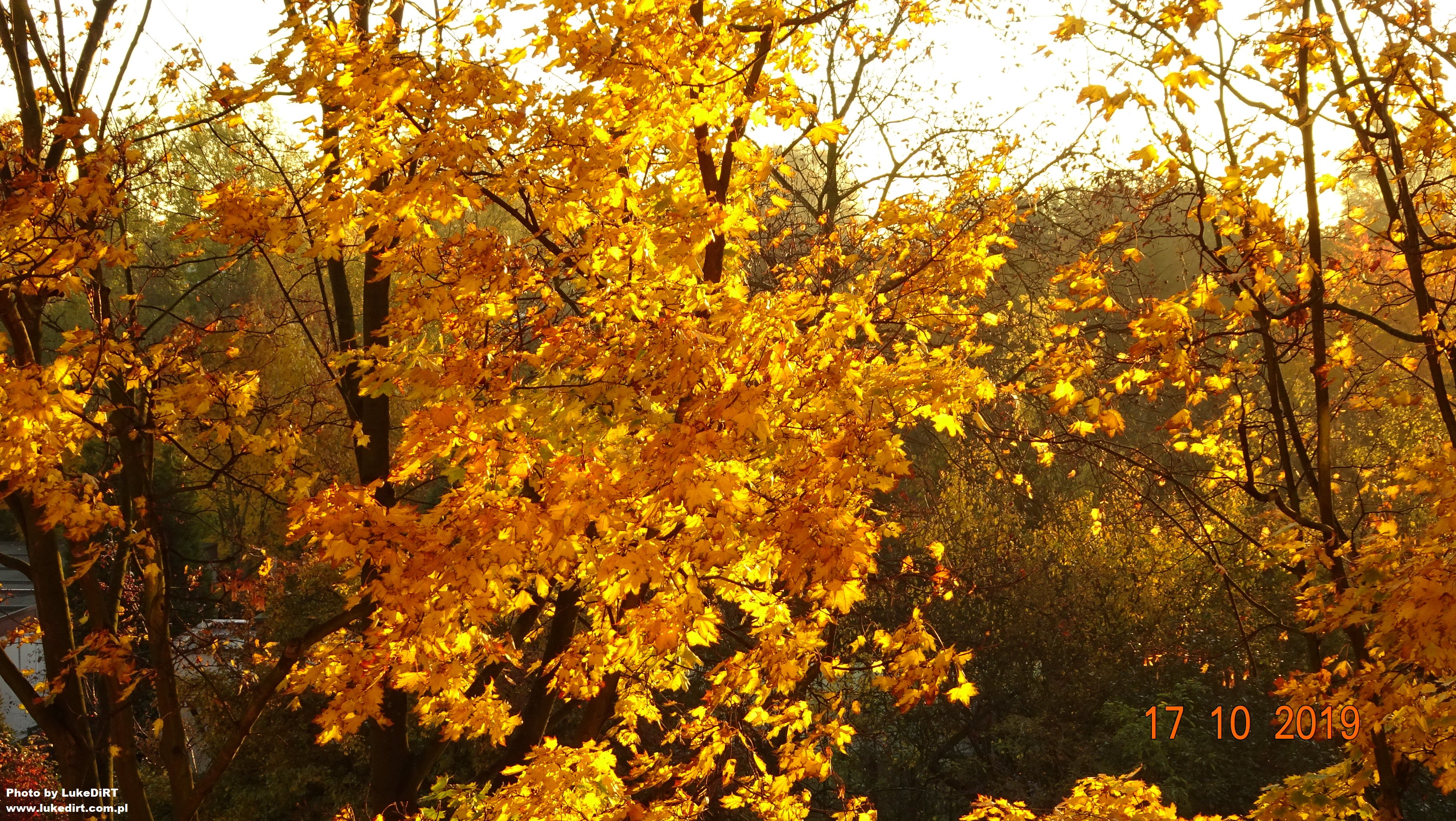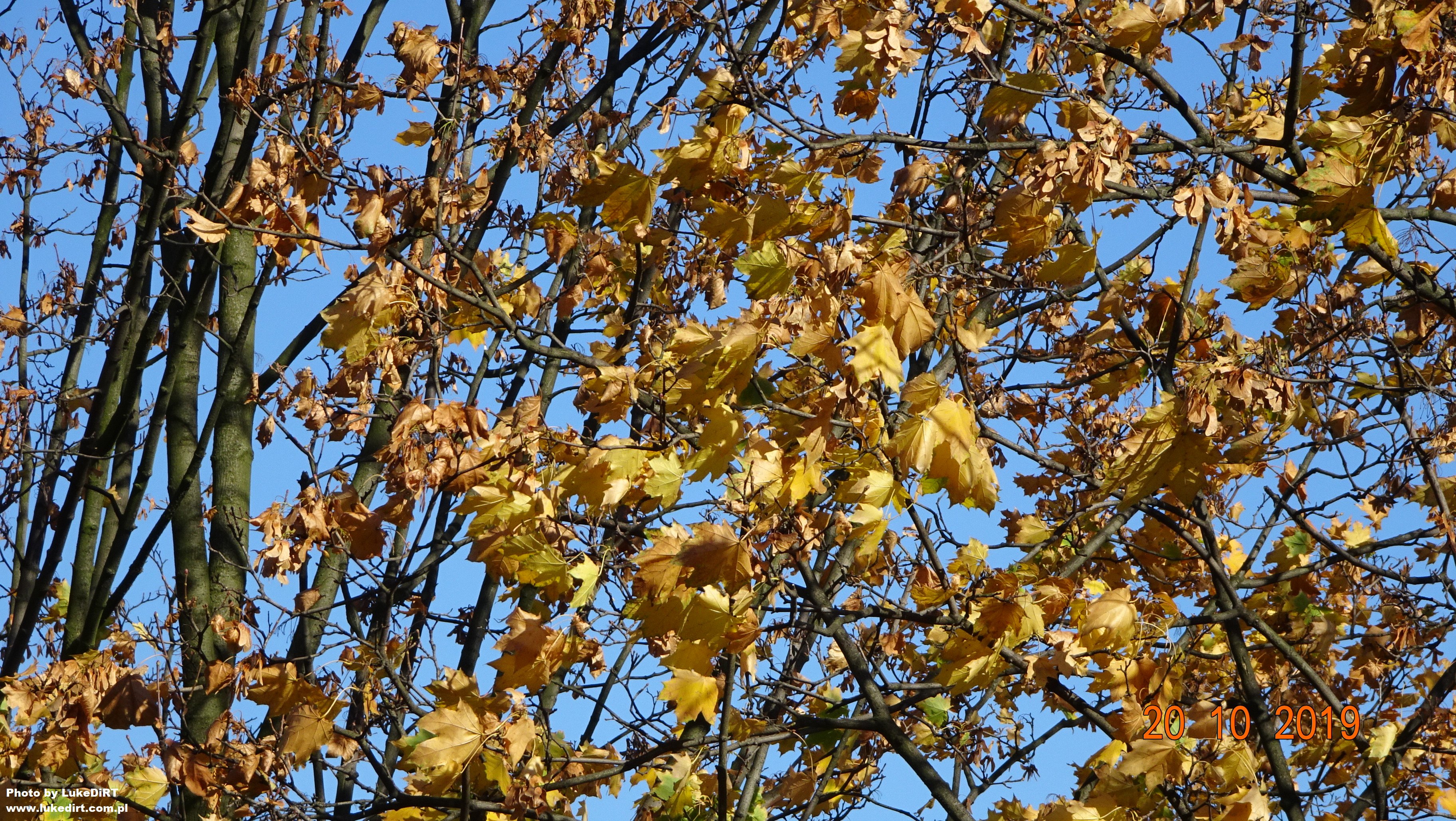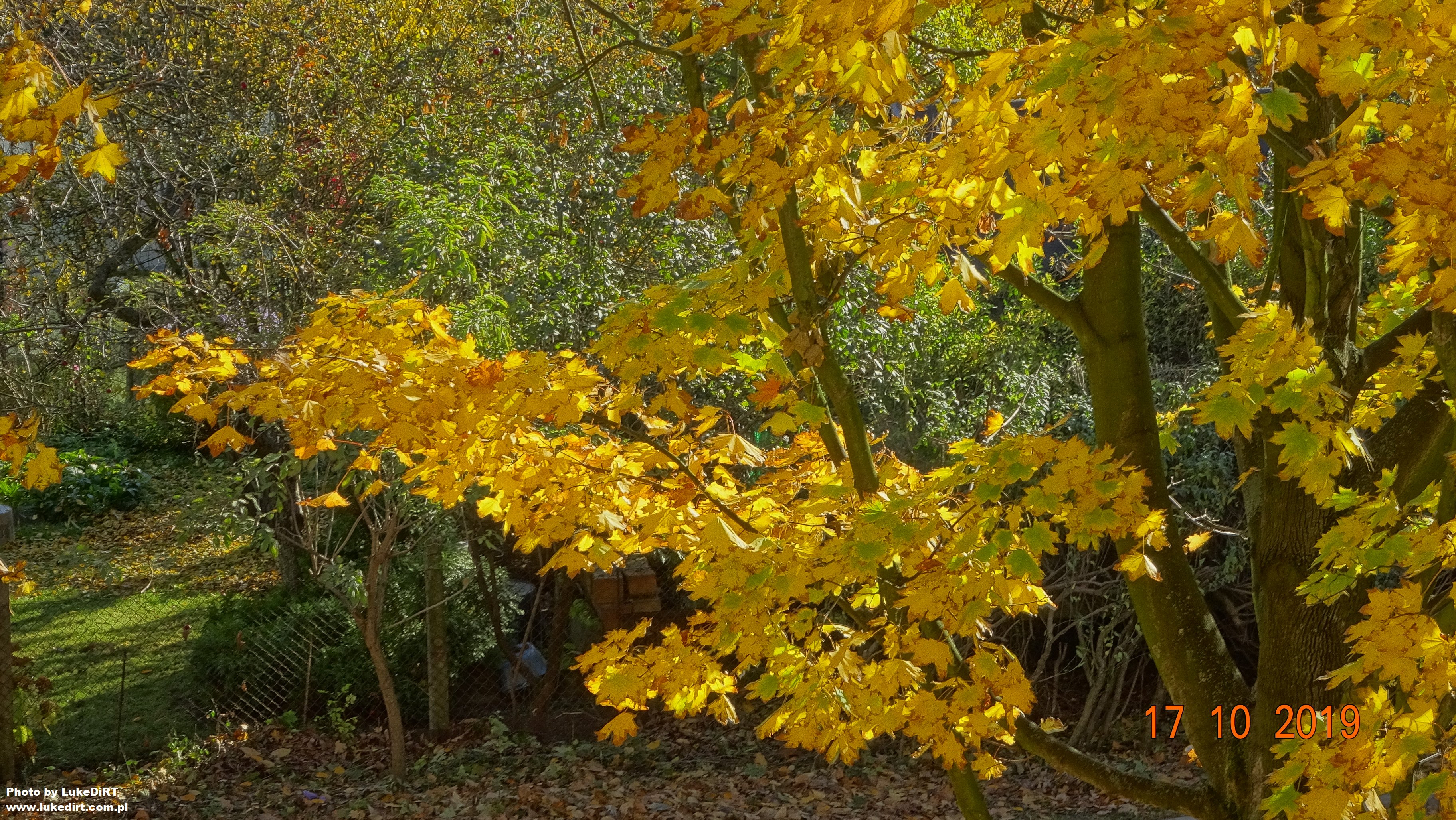 Druga część postępów jesieni w mojej okolicy, zdjęcia sprzed chwili 11 października 2019. Jak widać, chłód ostatniego tygodnia, a nawet znaczny mróz w nocy z wtorku na środę nie poruszył zbytnio dębowych liści. Orzech jest już natomiast niemal zupełnie ogołocony, także czereśnia została znacznie przerzedzona.