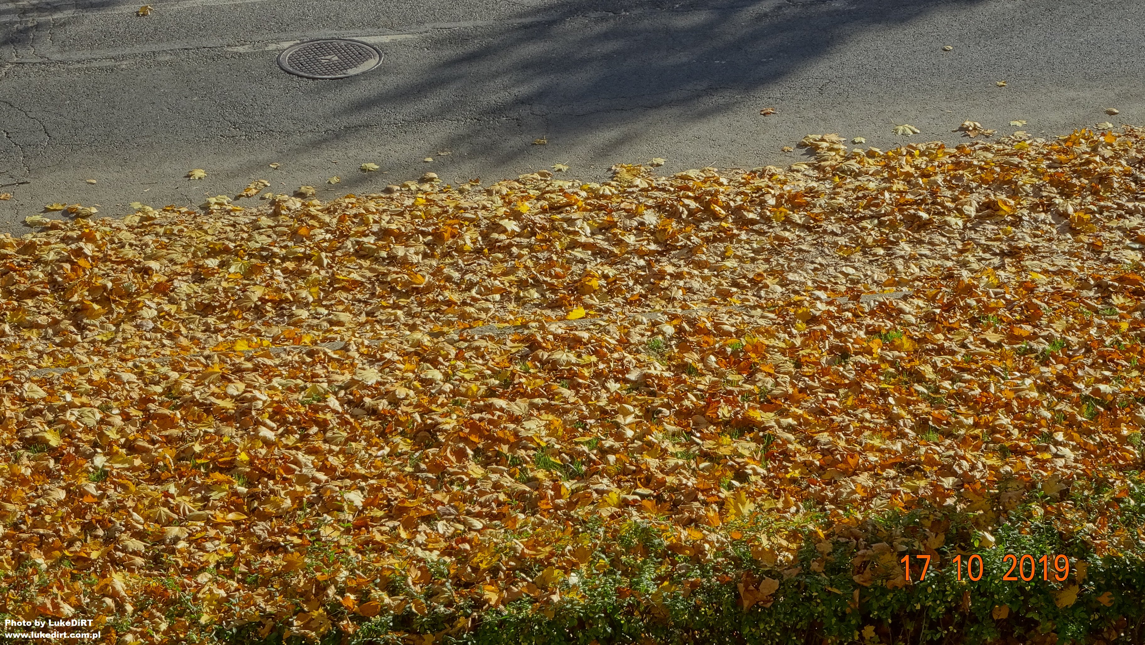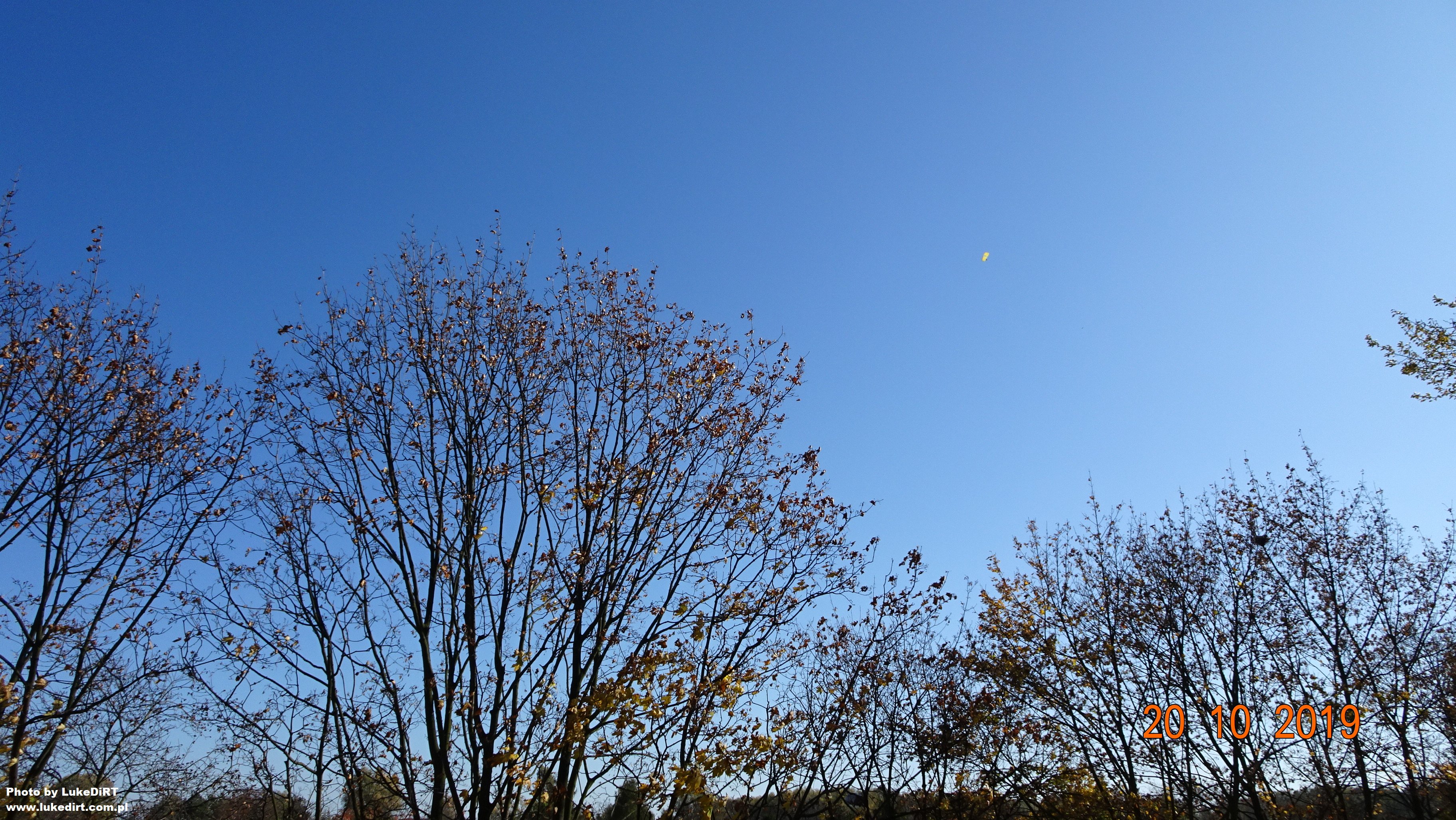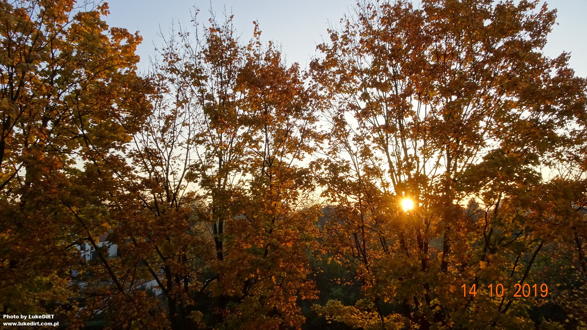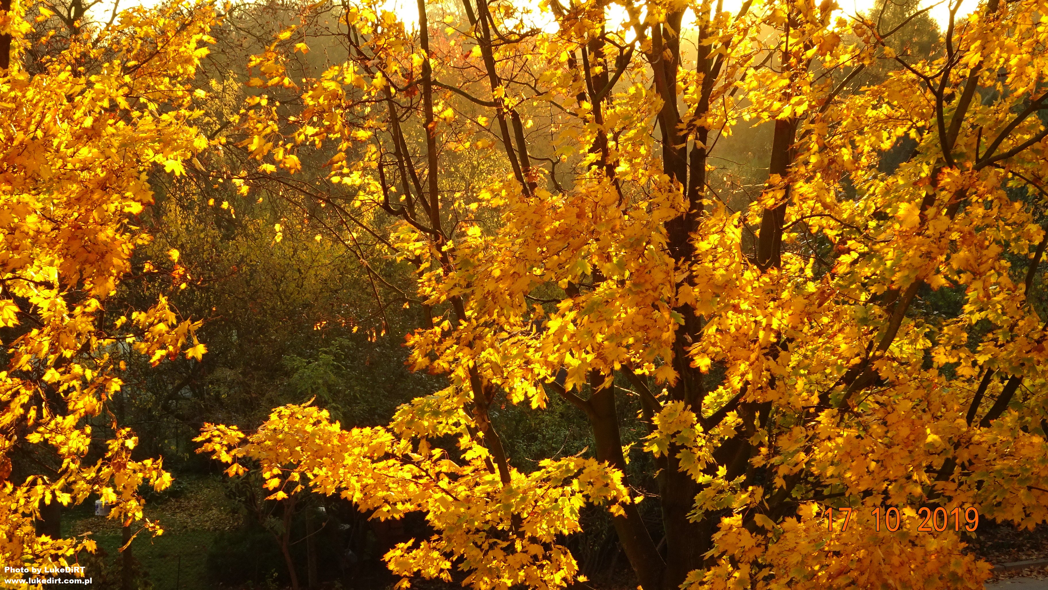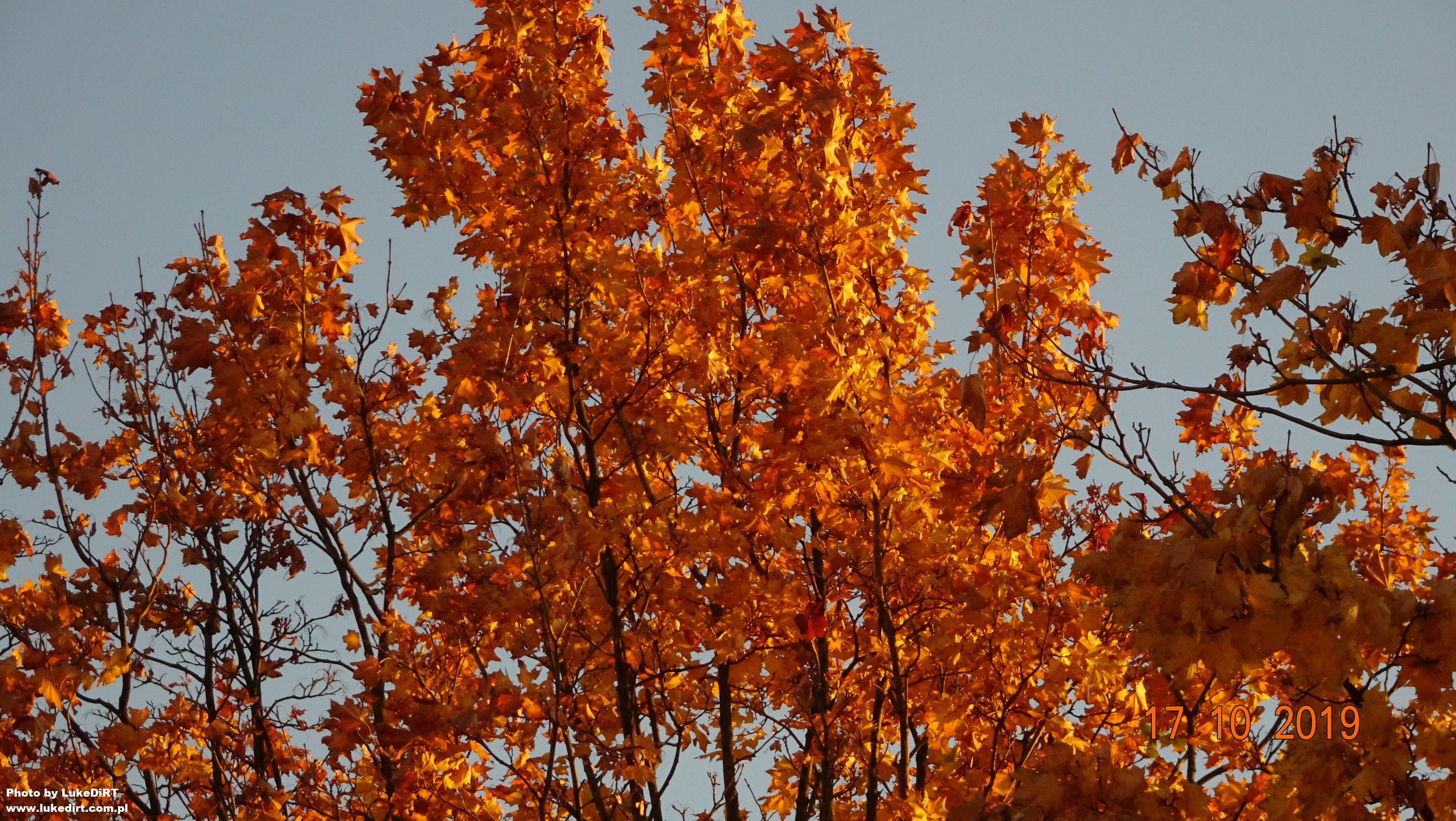 Druga część postępów jesieni w mojej okolicy, zdjęcia sprzed chwili 11 października 2019. Jak widać, chłód ostatniego tygodnia, a nawet znaczny mróz w nocy z wtorku na środę nie poruszył zbytnio dębowych liści. Orzech jest już natomiast niemal zupełnie ogołocony, także czereśnia została znacznie przerzedzona.
