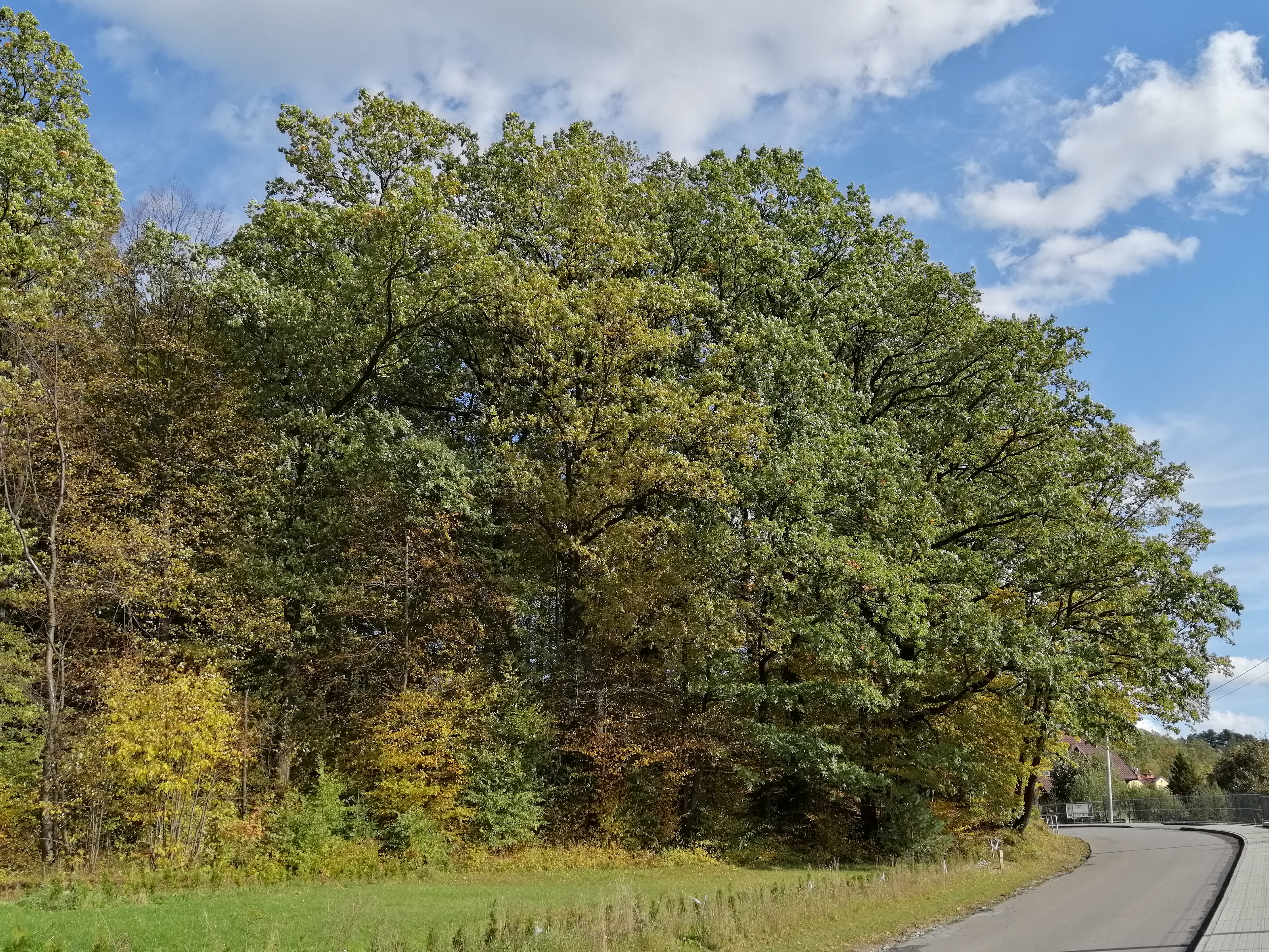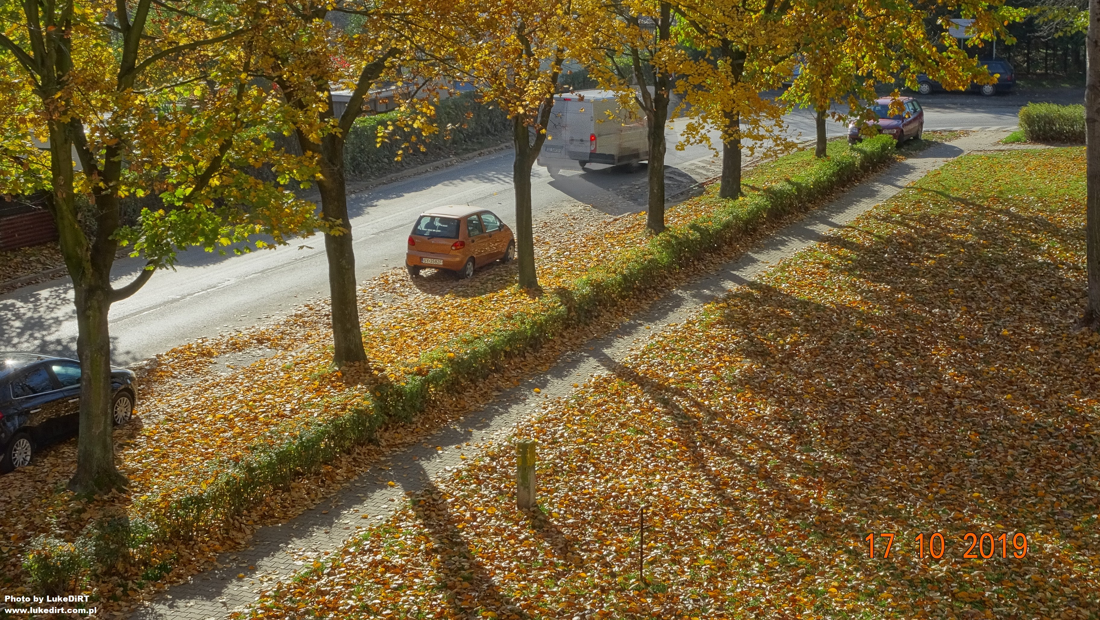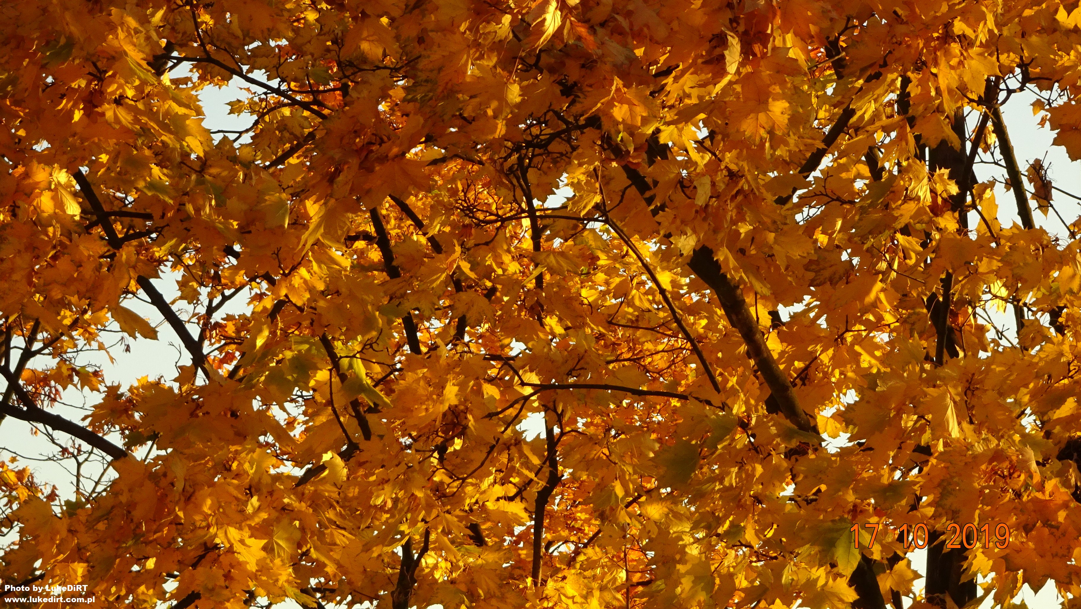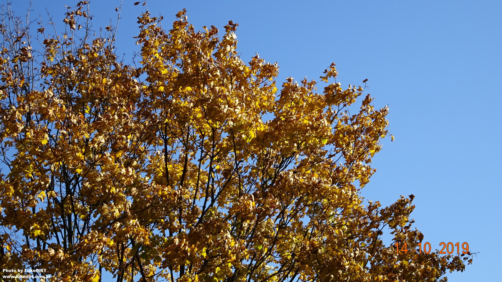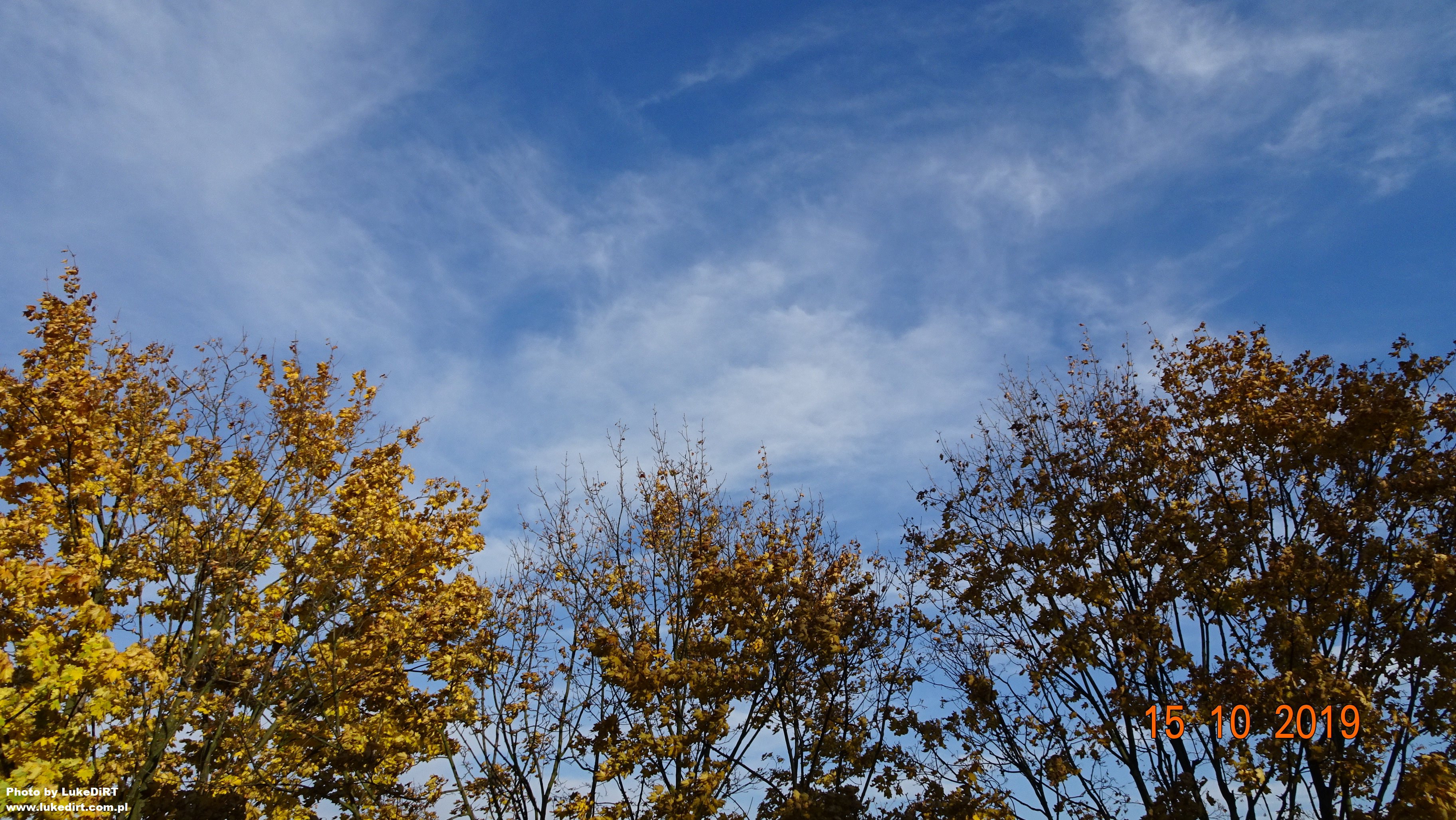 Druga część postępów jesieni w mojej okolicy, zdjęcia sprzed chwili 11 października 2019. Jak widać, chłód ostatniego tygodnia, a nawet znaczny mróz w nocy z wtorku na środę nie poruszył zbytnio dębowych liści. Orzech jest już natomiast niemal zupełnie ogołocony, także czereśnia została znacznie przerzedzona.