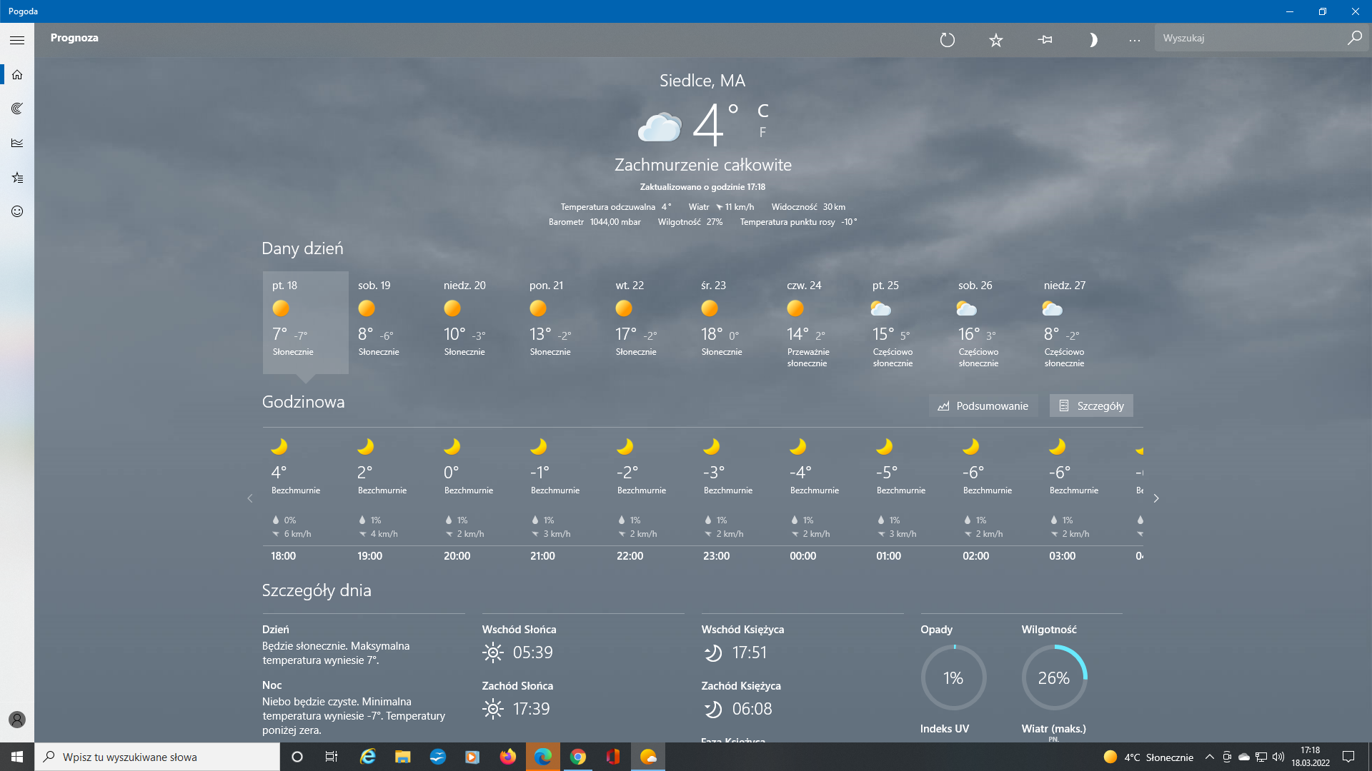 Jak widać na screenie widgetu pogodowego Windowsa obecnie ciśnienie u nas wynosi 1044 milibary (lub jak kto woli hektopaskale). Tyle tylko, że widget pokazuje, że u nas pogoda jest pochmurna, a tak naprawdę na niebie nie ma ani jednej chmurki.