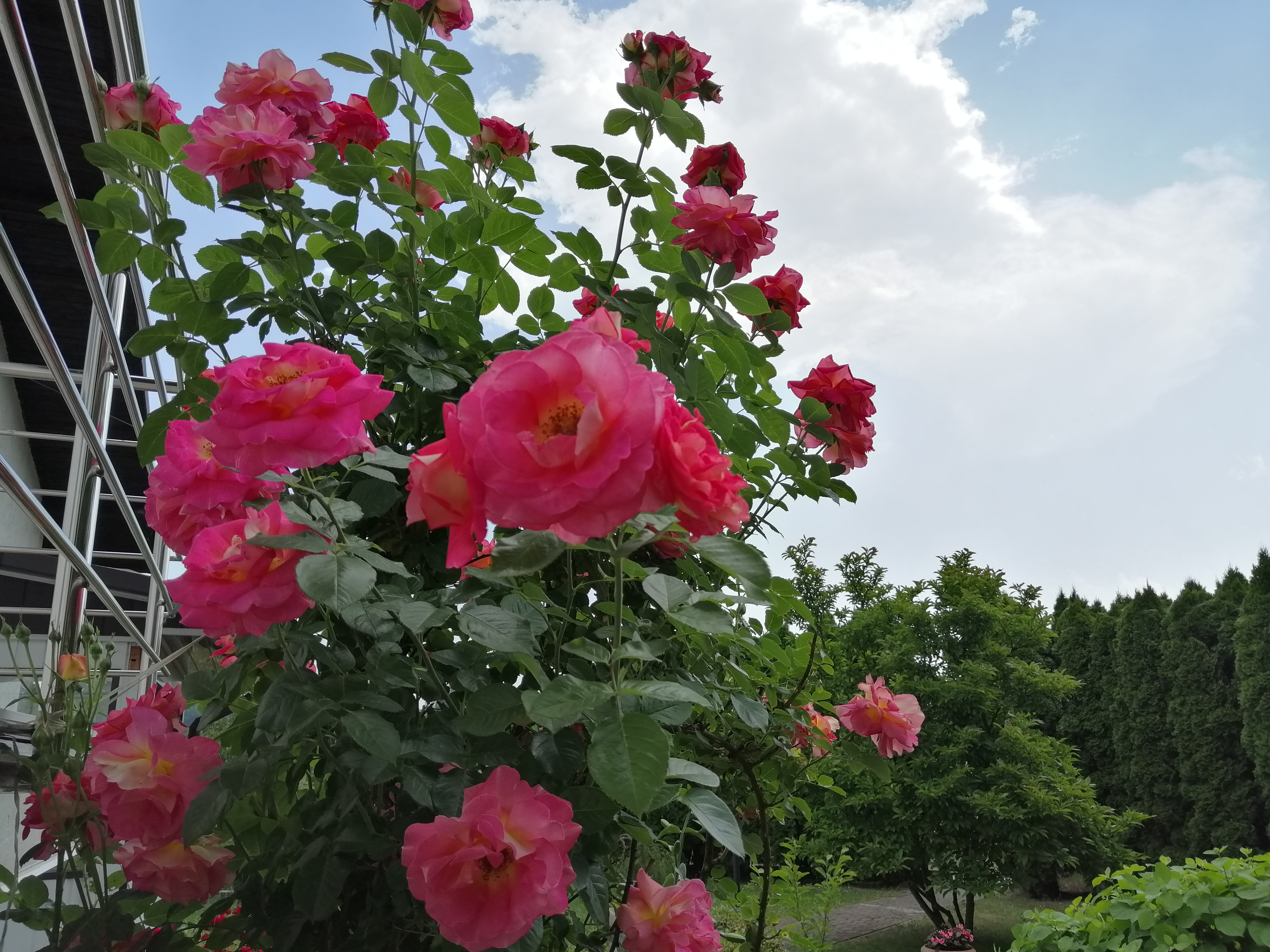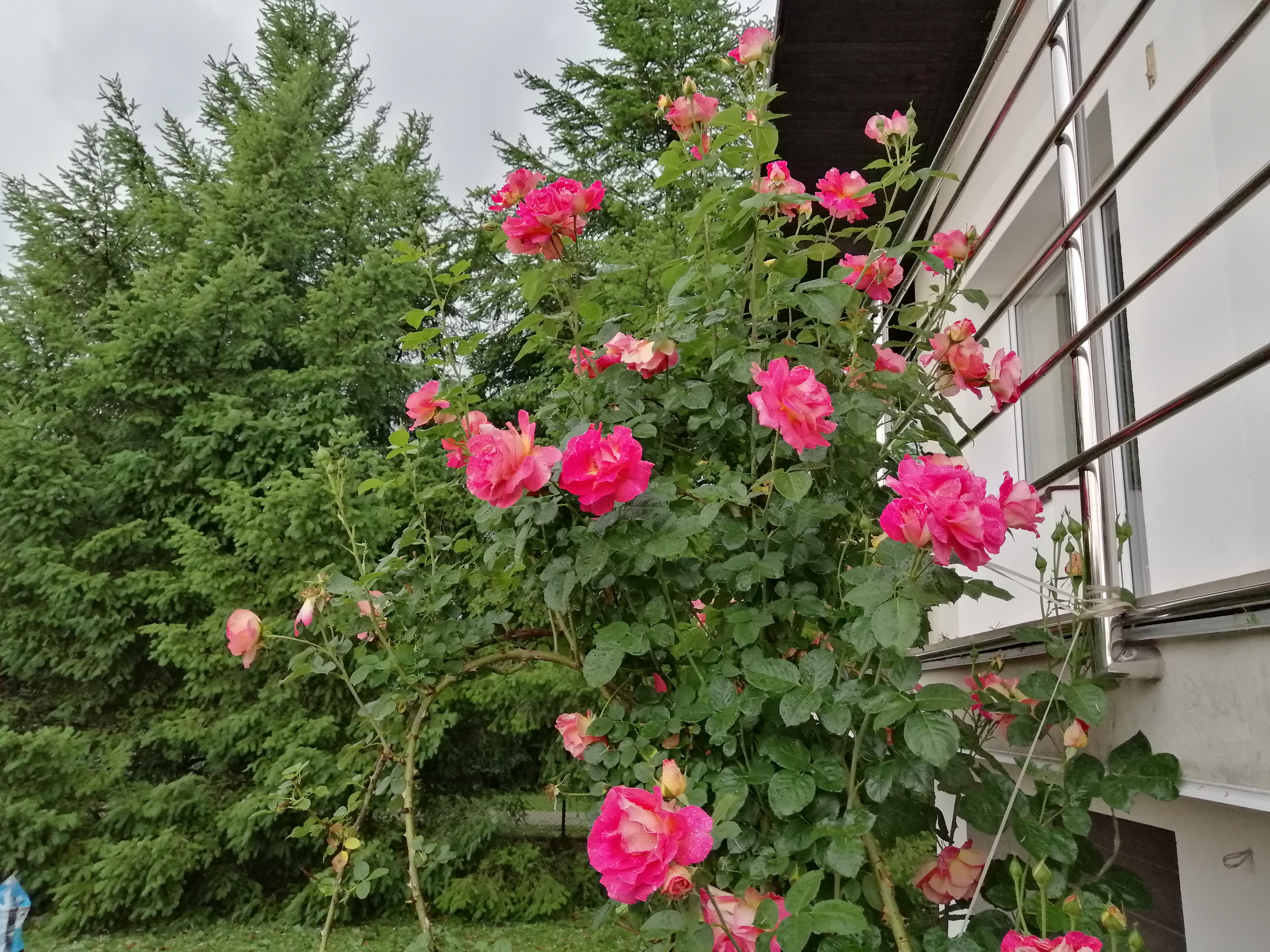 Przez drugie okno obserwowałem jak na tle jaśniejszego nieba przesuwają się smugi deszczu - silnego deszczu. Do pokoju ochoczo zaglądała aktualna królowa ogrodu - piękna, bardzo wysoka róża, która dodawała mi animuszu podczas nauki, wychylając się przez barierki balkonu, o który się oparła. Mama powiedziała, żebym zrobił jej jeszcze zdjęcie, bo to pewnie jej ostatnie chwile. Tak też uczyniłem. Jest 16:55.