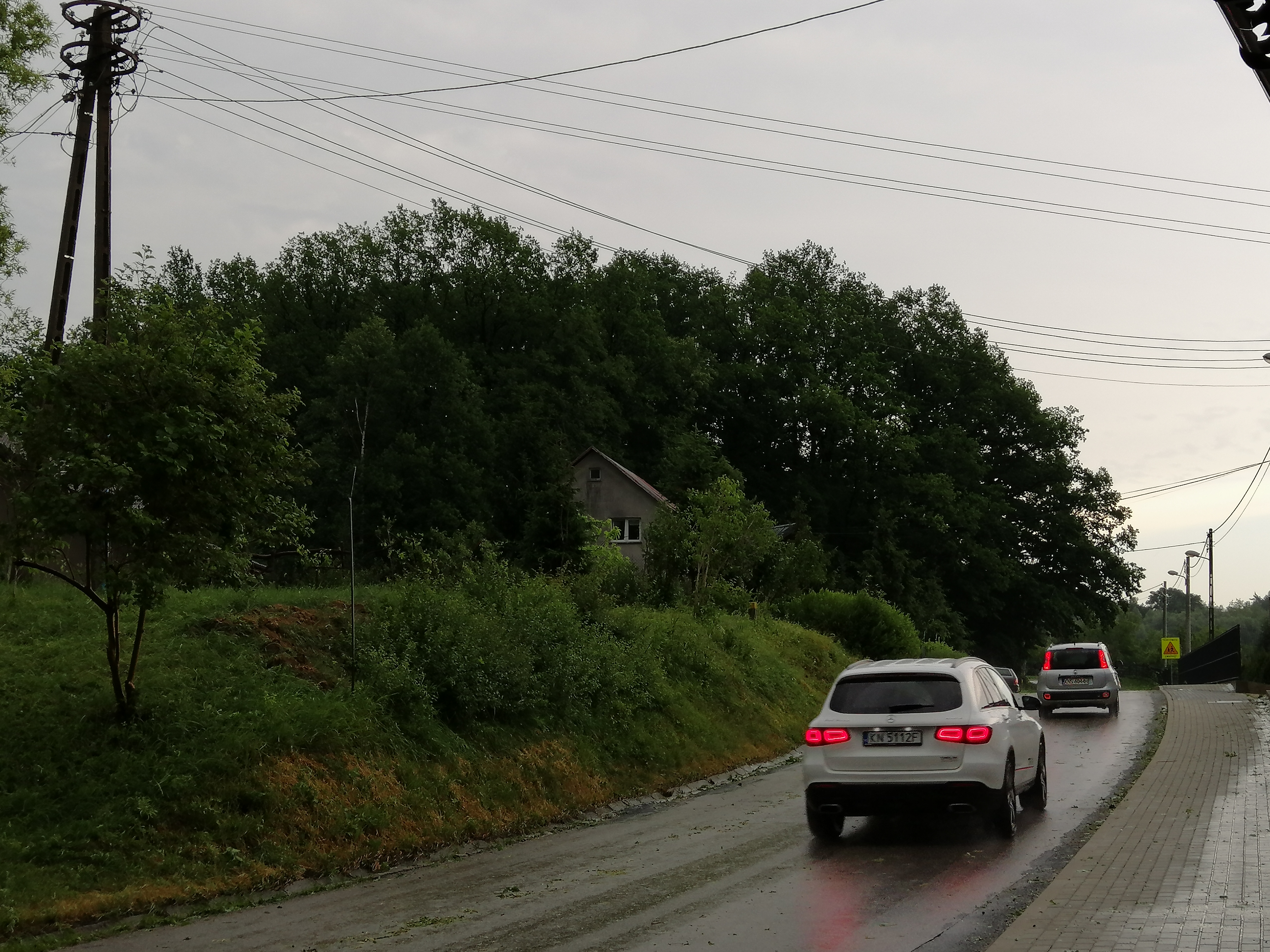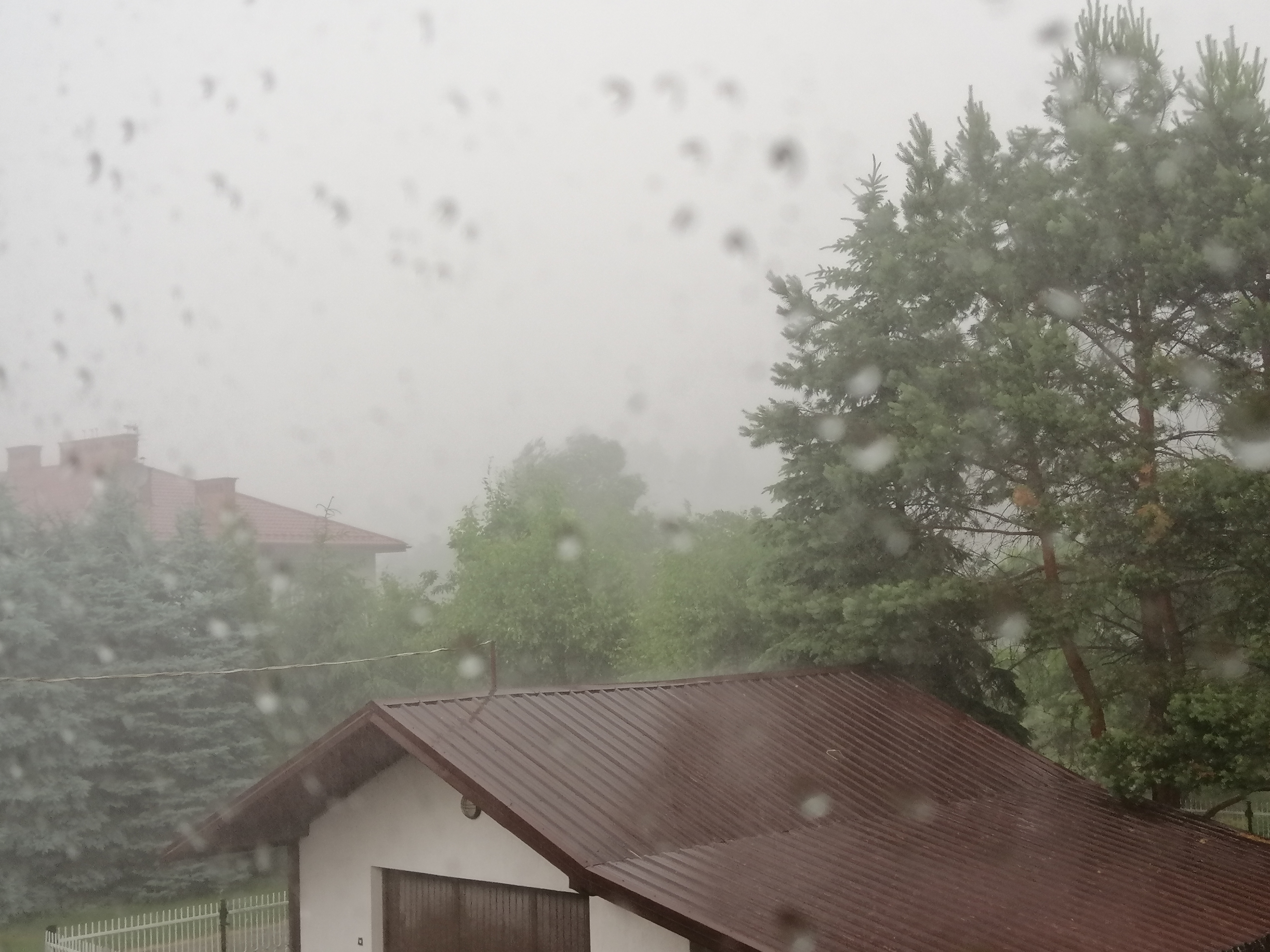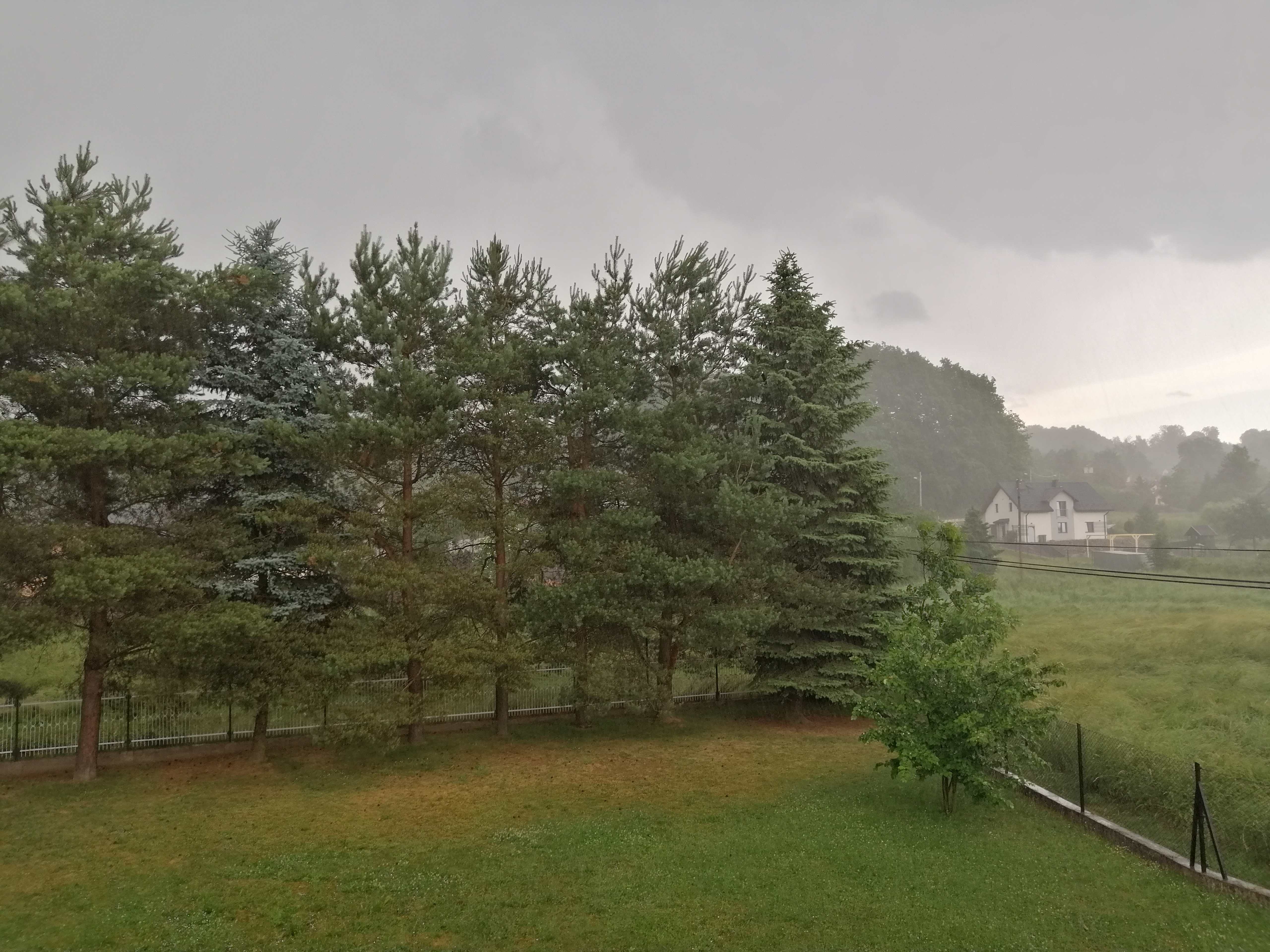 Tymczasem zaczęło mocniej padać i grzmieć. Przez smugi opadowe widziałem jednak tylko rozbłyski, bez kształtów wyładowań. Mój przyjaciel, do którego napisałem o trąbie powietrznej, napisał mi o tym, że dowiedział się o zniszczeniach w Librantowej, że w centrum Nowego Sącza pada grad. Tutaj też się zaczynało.