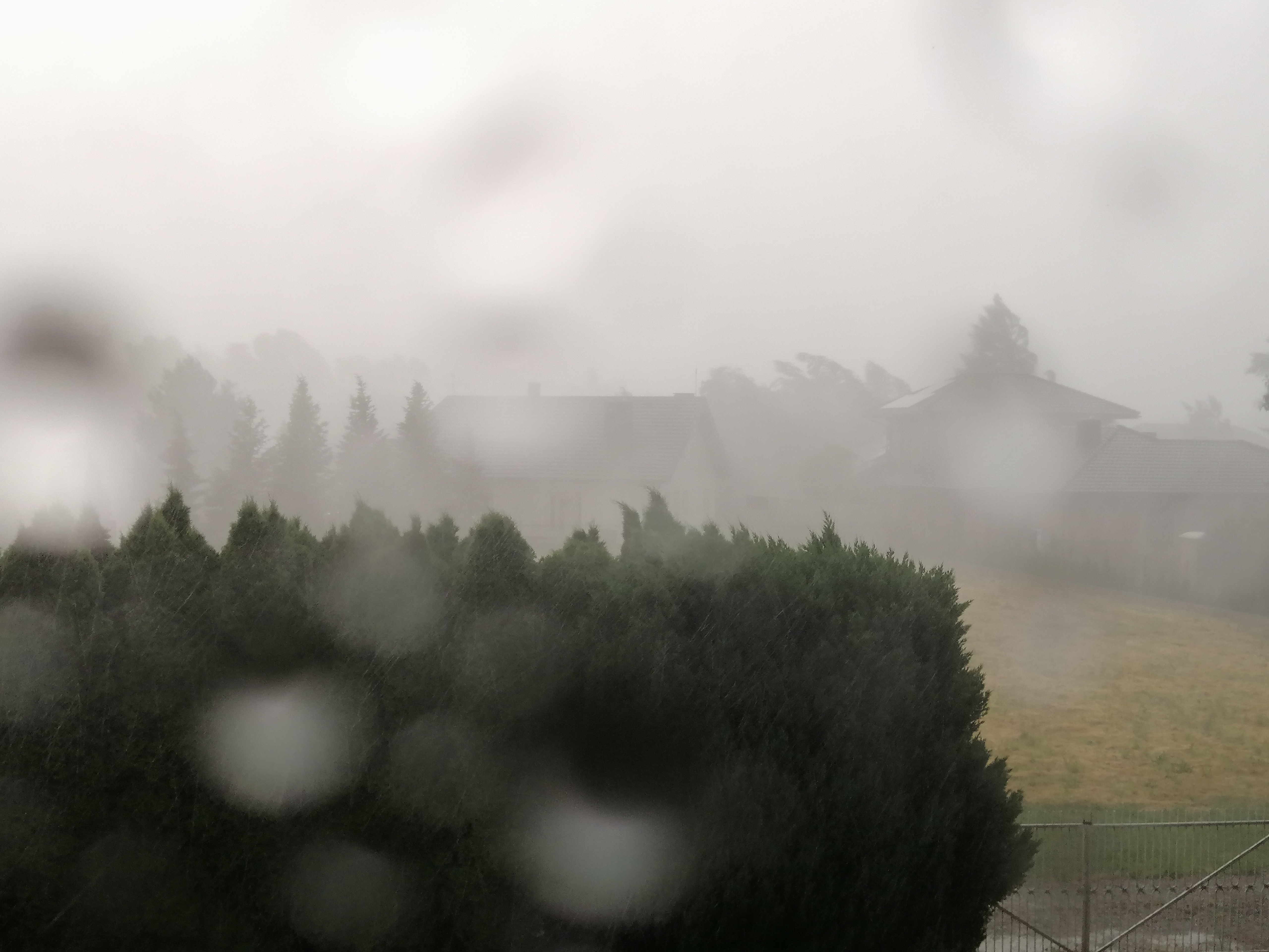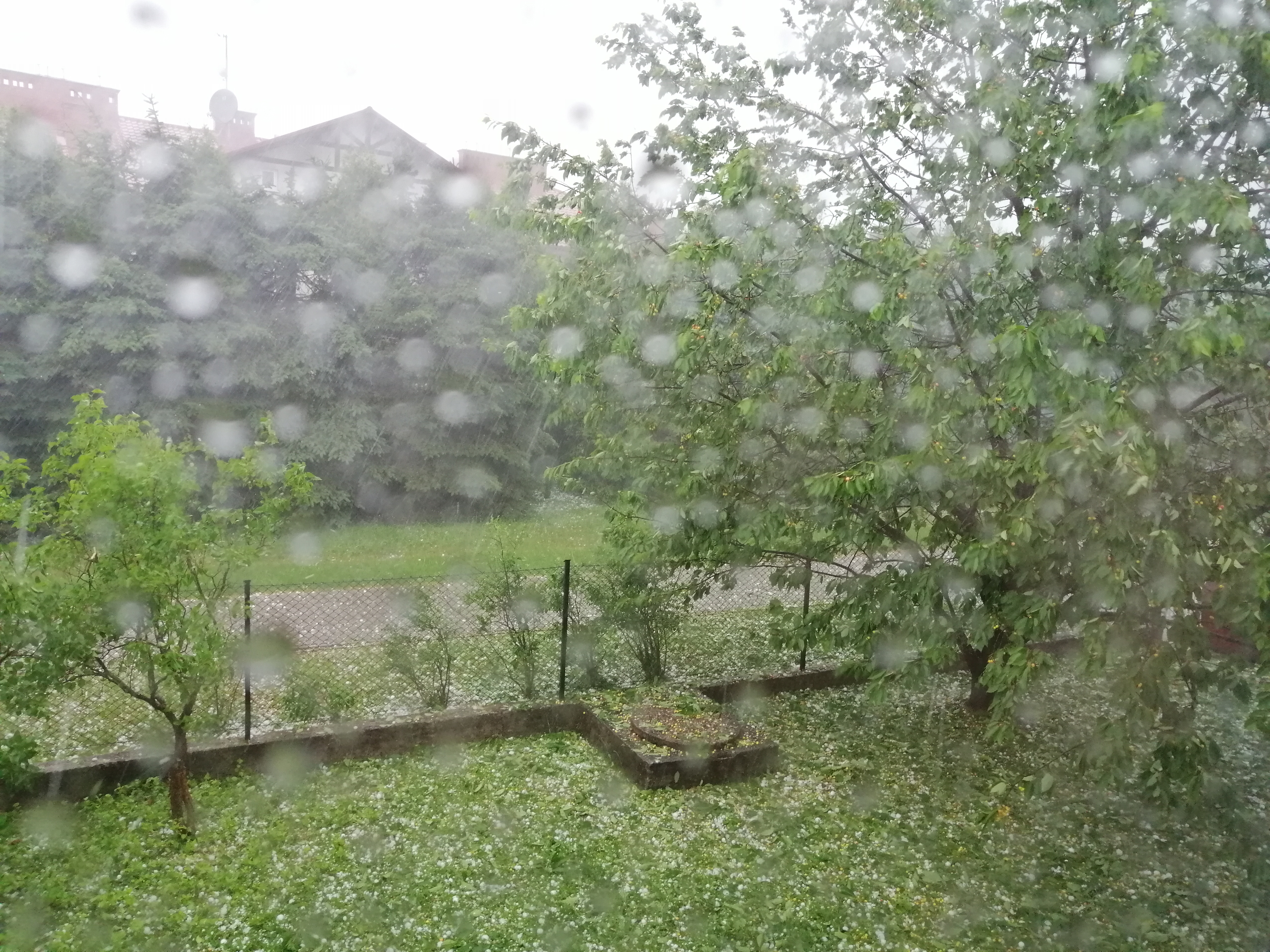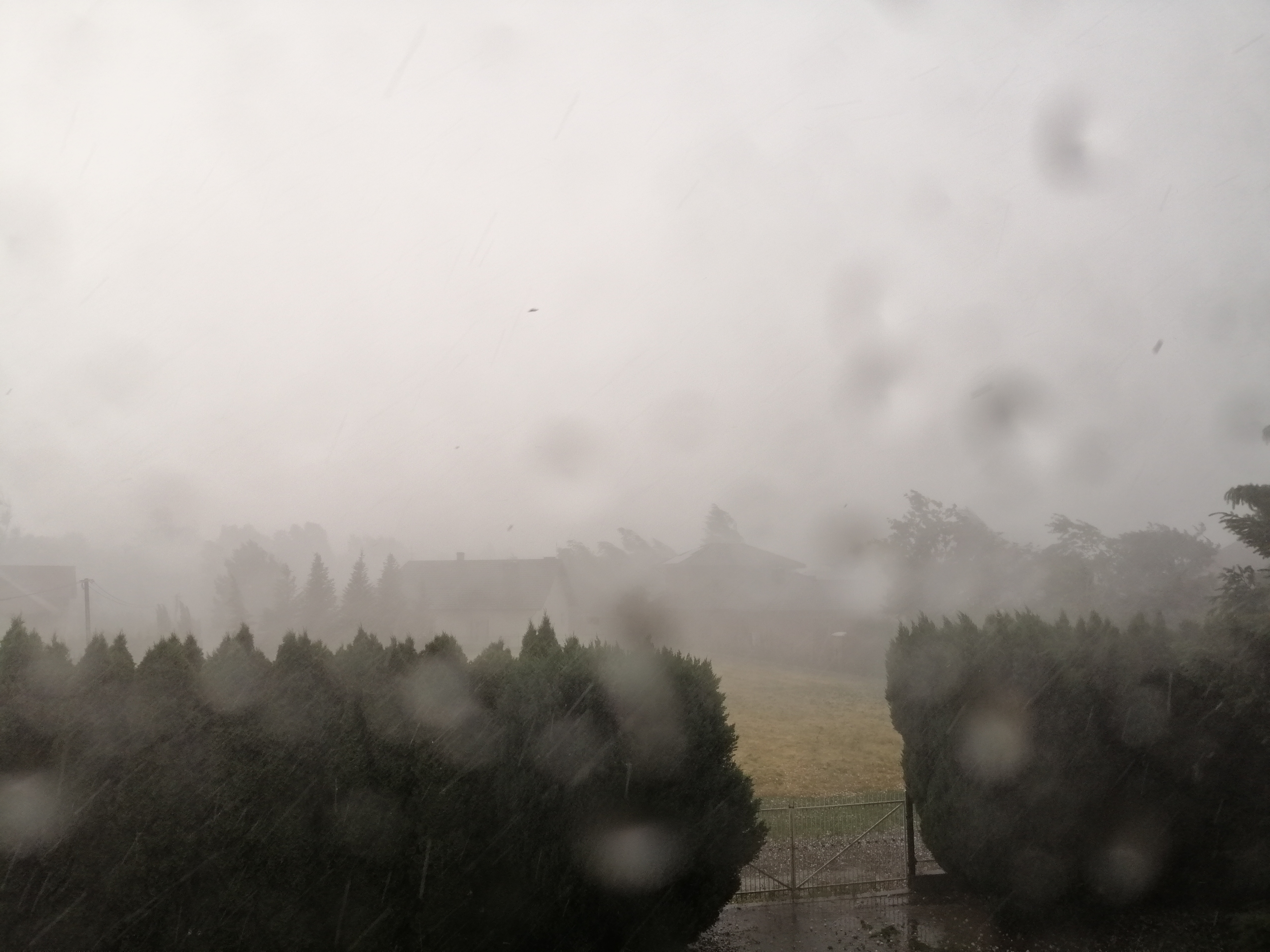 O 17:14 deszcz uspokoił się na tyle, że wyszedłem na zewnątrz. Wysoka trawa na polu obok została jakby skoszona. Słychać było tylko alarmy pobitych samochodów.