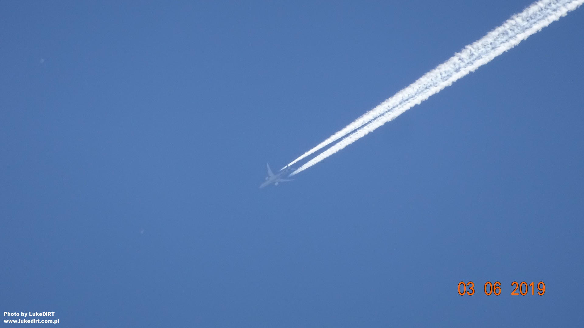 Ten samolot wygląda mi na Boeinga 787-9, czyli Dreamlinera w powiększonej wersji (te skrzydła są jedyne w swoim rodzaju) I podejrzewam że linia lotnicza to Etihad Airways, która często śmiga tym modelem samolotu nad Śląskiem i Małopolską z Abu Zabi do USA. Zdjęcie wygląda na zrobione w godzinach południowych, więc jest na to duża szansa, bo przeważnie latają o takiej porze