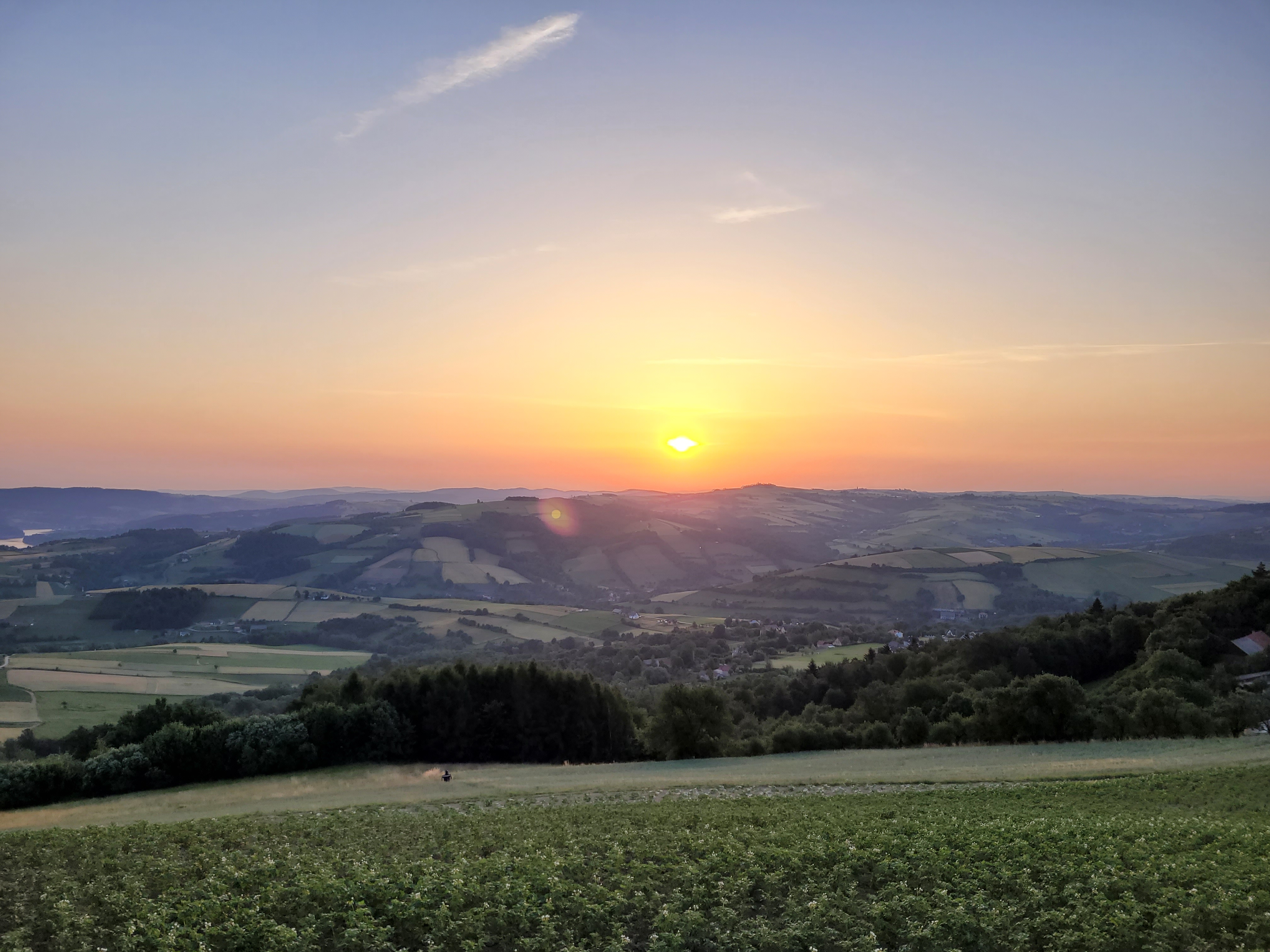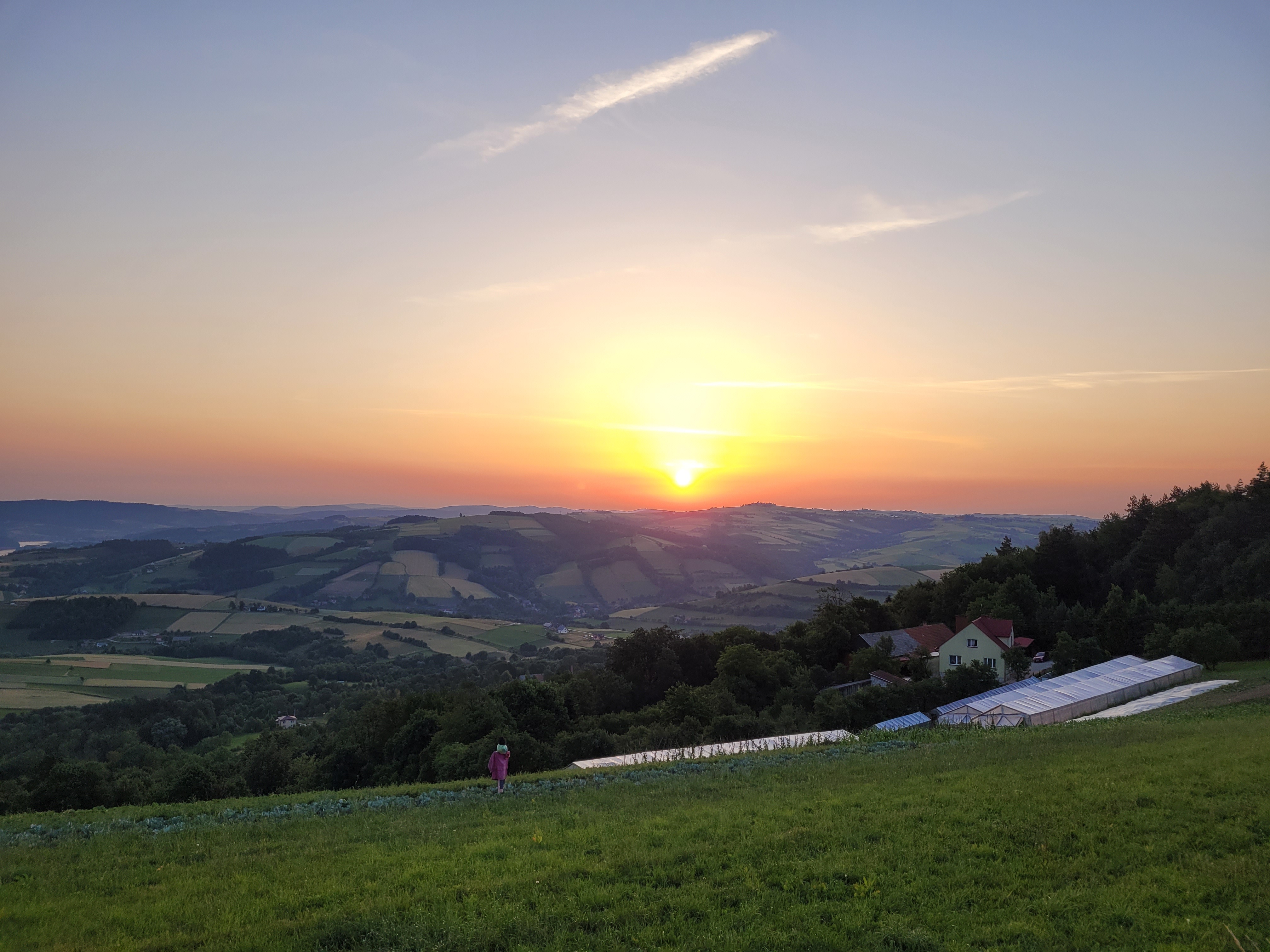 zameldowałem się na Górze Kurowskiej należącej do Pogórza Rożnowskiego. Tam powitało mnie słoneczko, które dopiero podniosło się znad wzgórz. Była godzina 4:49 (większość zdjęć zrobiłem w godzinach 4:50-5:10, zaś sam wschód Słońca nastąpił o 4:33 (z racji ukształtowania terenu nie był jednak widoczny od razu).