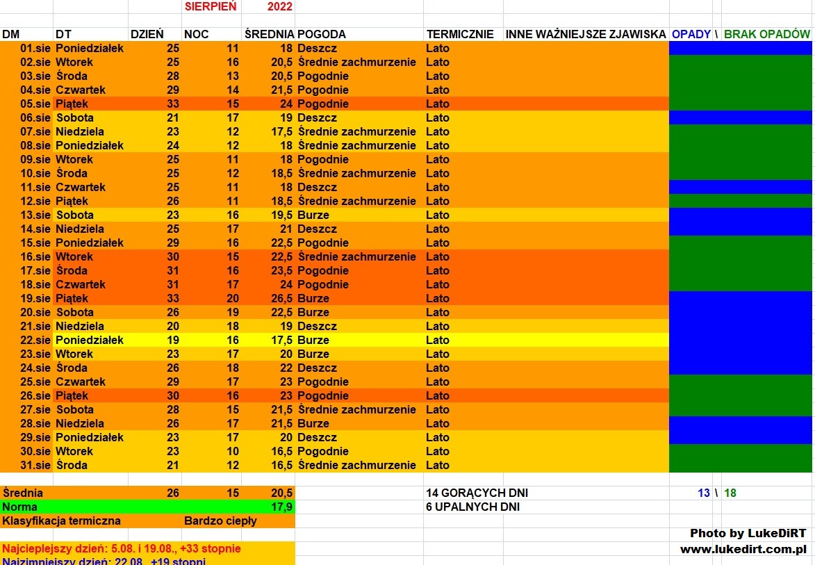 Opad 85,3 mm, identyczna suma jak za sierpnie 2020 i 2021 (wszystkie łączy klaunowanie w końcówce), usłonecznienie 252,4 h identyczne jak sierpień 2019