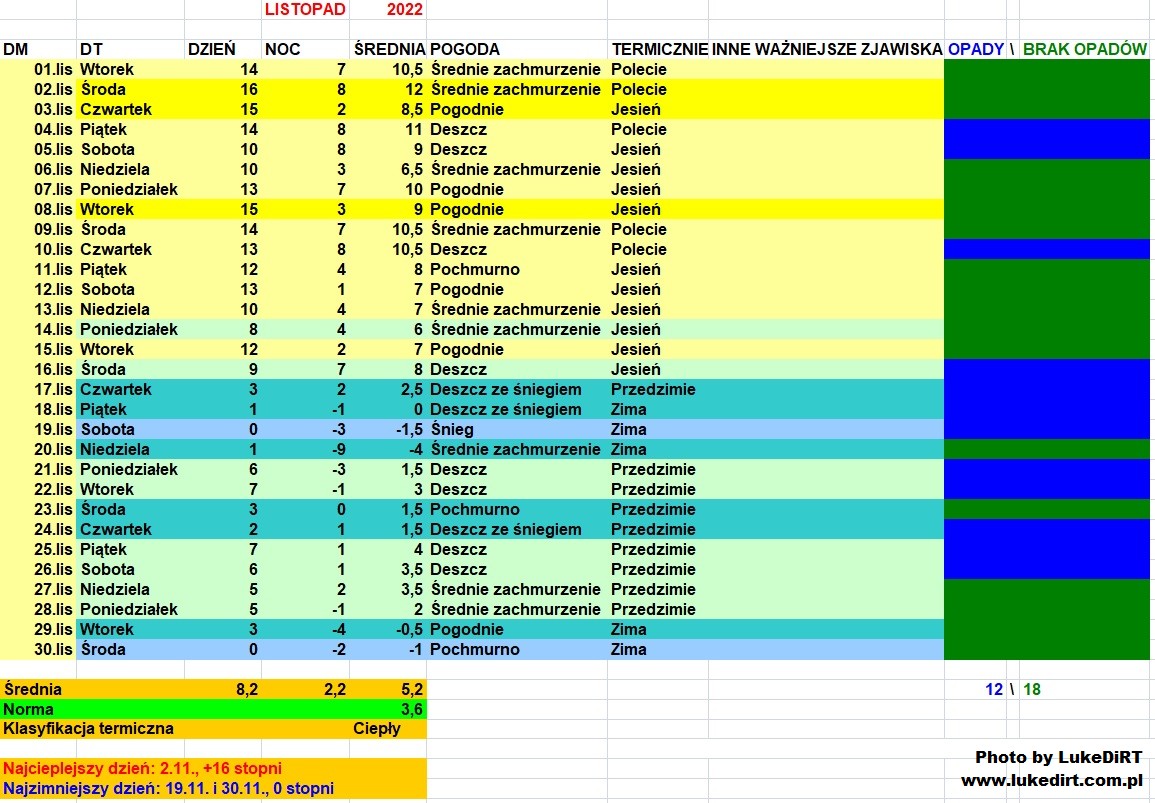 Nie wiem tak dokładnie w jaki sposób ustalana jest klasyfikacja konkretnych miesięcy w przypadku temperatury blisko normy. Listopad 2022 powyżej (odrobinę, ale jednak) normy 1981-2010 jest lekko chłodny, zaś sierpień 2016 poniżej normy jest lekko ciepły. Trochę zamieszanie robi się w tych tabelkach.