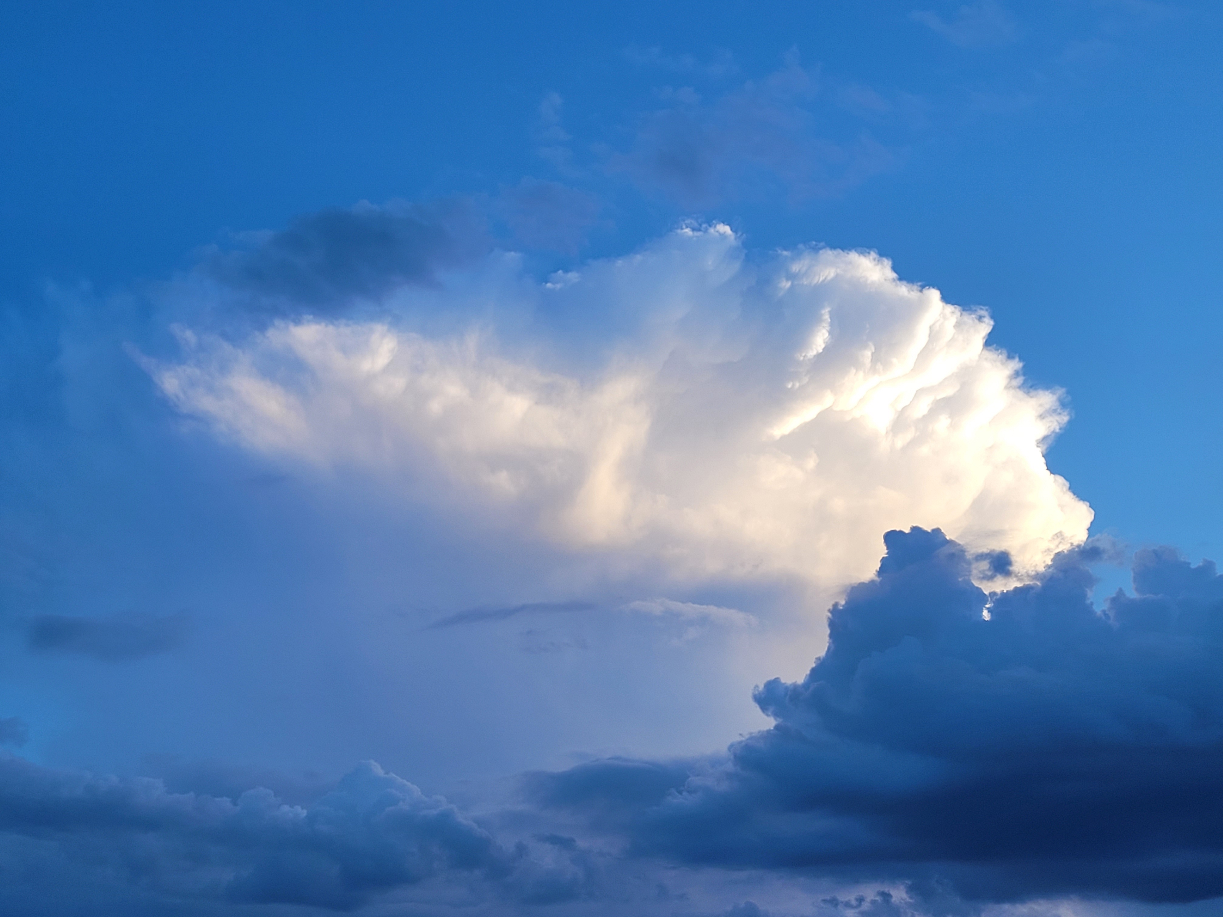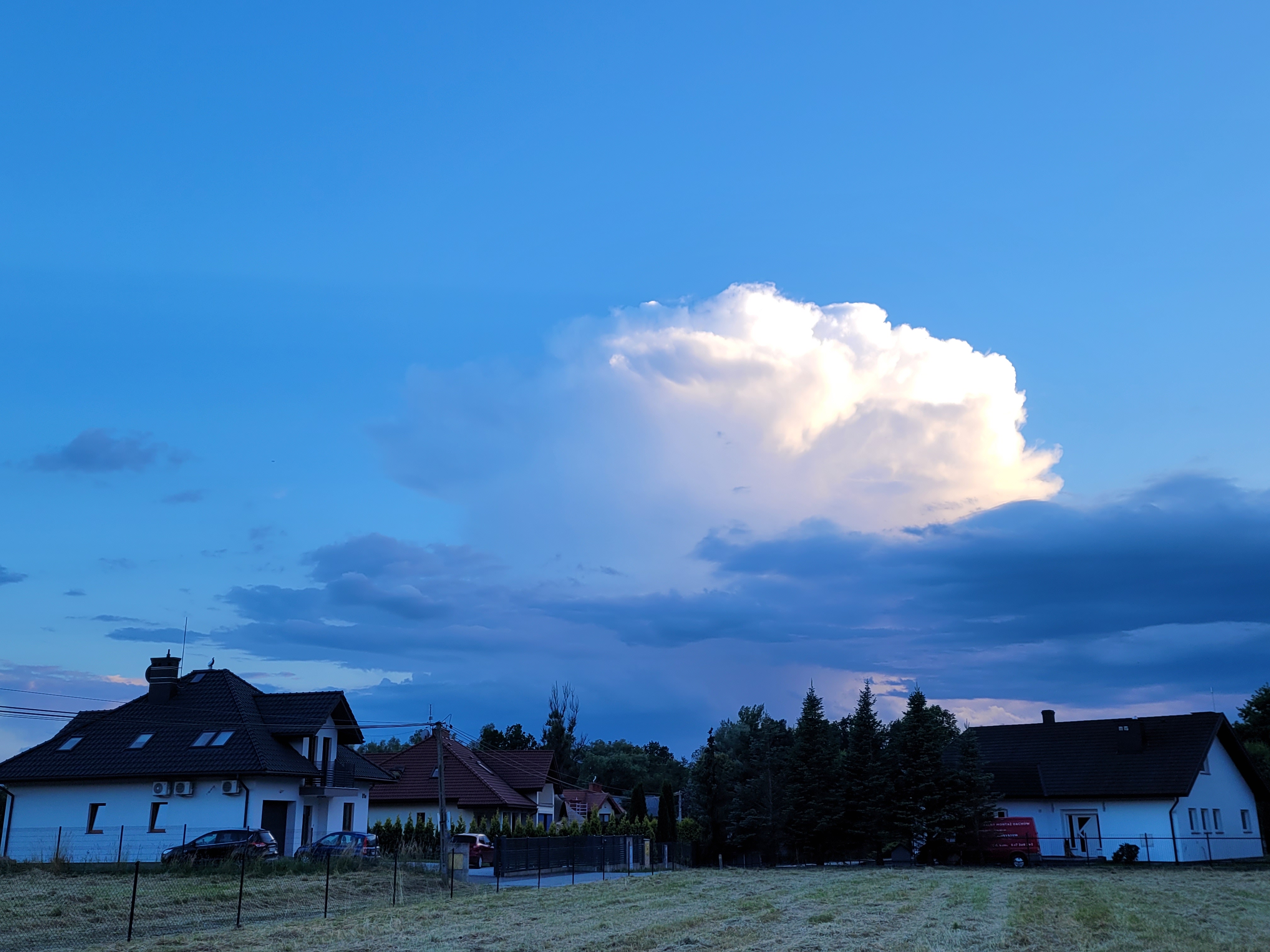 Na razie w krótkich słowach - po dość długim czasie oczekiwania, dziś wieczorem dostałem piękną, widowiskową burzę. Przyszła po upalnym dniu, który już od godzin popołudniowych pozwalał sądzić, że czekają mnie w nim dodatkowe atrakcje. Około 20:00 wypiętrzający się na południe ode mnie cumulonimbus wypuścił pierwsze wyładowania.