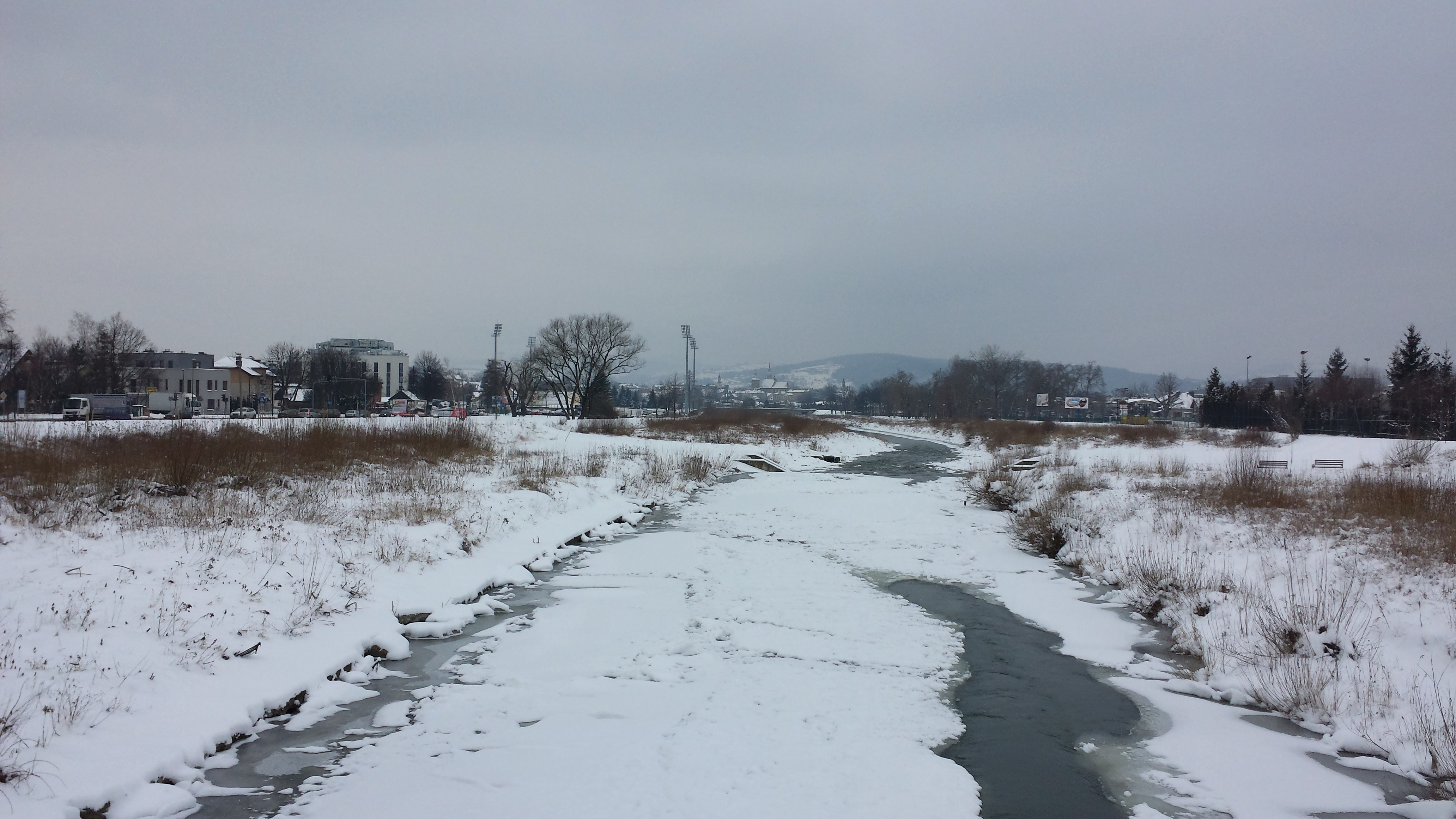 Po skończeniu swoich zajęć uznałem, że szybciej dotrę do domu, jeśli pójdę na nogach. Przy okazji mogłem przypatrzeć się częściowo zamarzniętej Kamienicy. Śnieg na chwilę przestał sypać.
