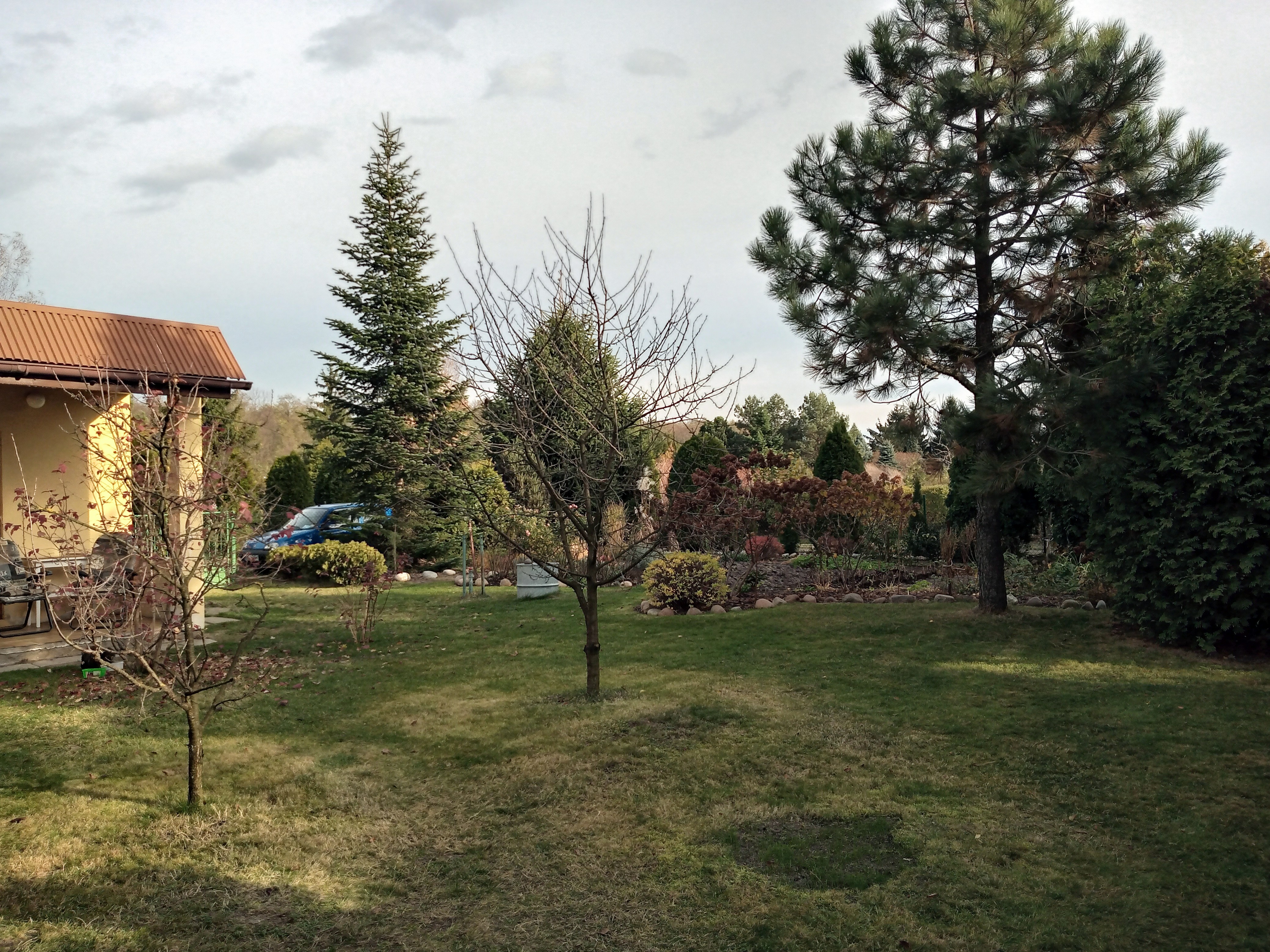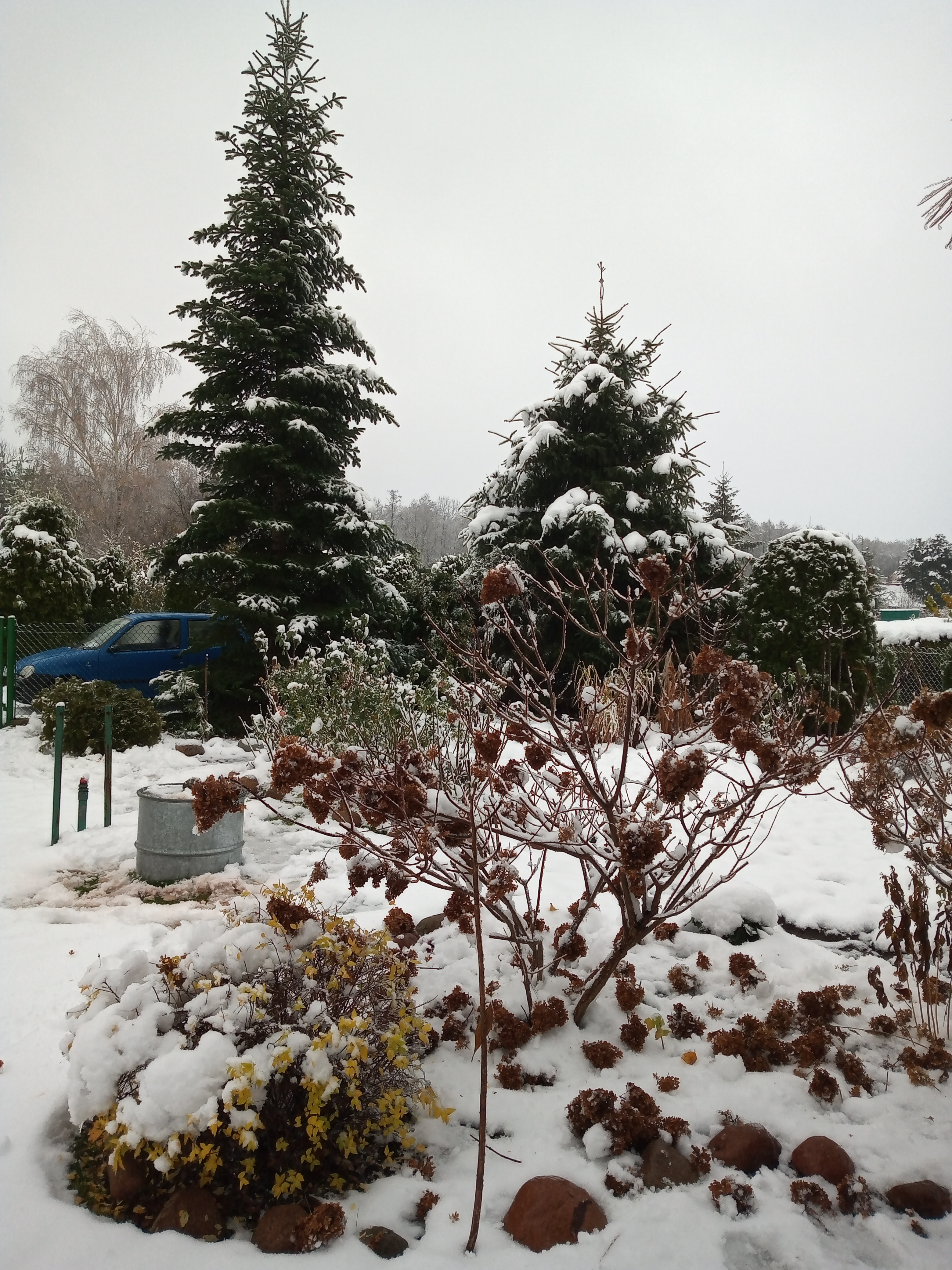 Zdjęcie zrobione dzisiaj w samo południe, no, może kilka minut po. Po powiększeniu (kliknij lewym przyciskiem myszy na fotkę) zobaczysz: Wiśnie całkiem gołe, na kalinie i pęcherznicy resztki liści, a pod nimi spadłe czerwone liście (potem je zgrabiłem). No i hortensje już bez liści, za to z zaschniętymi brązowymi kwiatostanami. Czy tak wyglądałoby to w zimowy "odwilżowy" dzień, a tym bardziej wiosną :?: Sporo pożółkłych liści jest jeszcze na widocznych w dalekim tle brzozach.