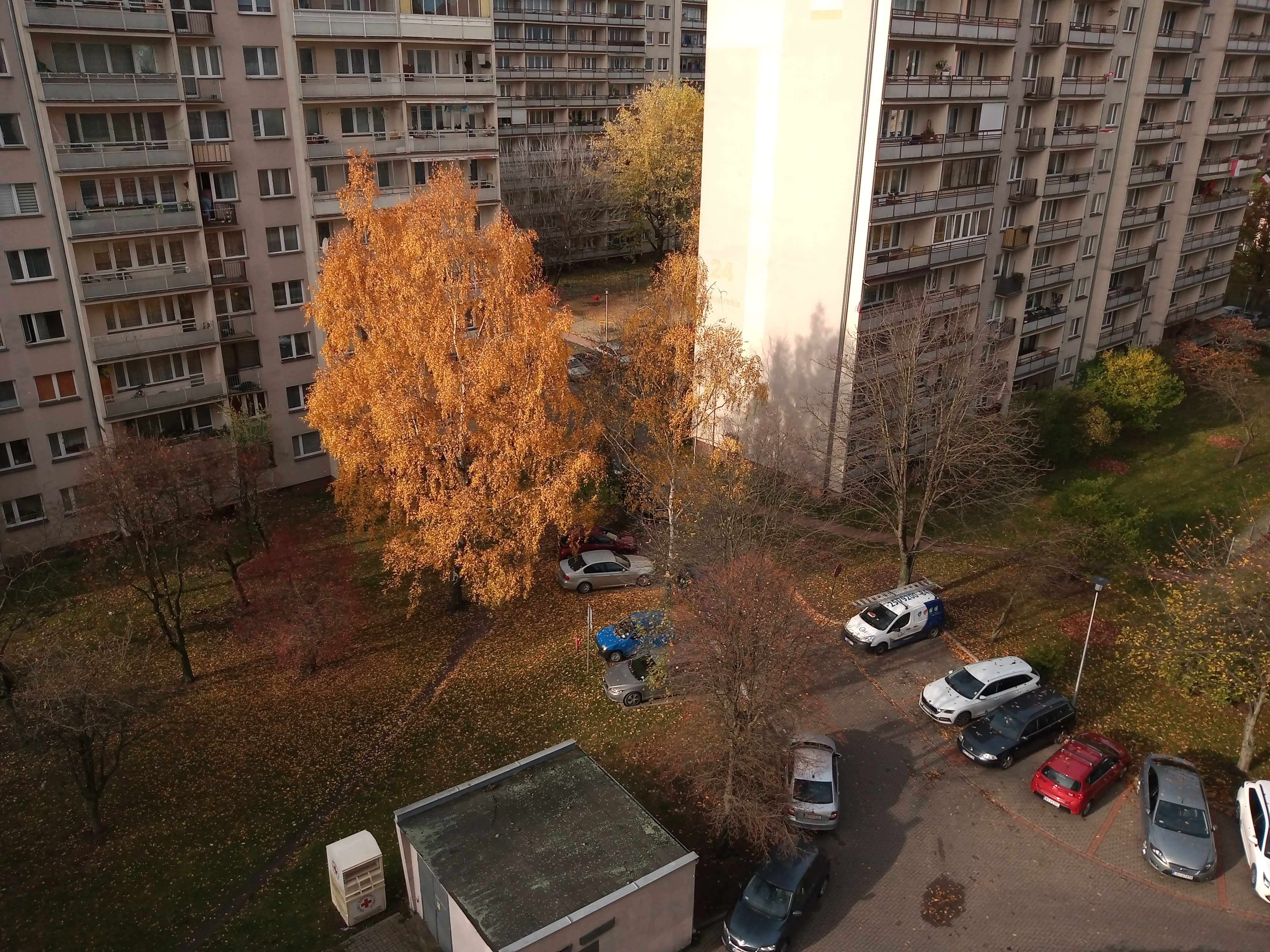 12 listopada 2023 r. na osiedlu. Prawie wszystkie drzewa gołe lub niemal gołe, w tym kasztanowiec przy bloku po prawej stronie. Tylko brzozy pysznią się uroczym żółtym ulistnieniem. A na trawniku pełno opadłych liści.