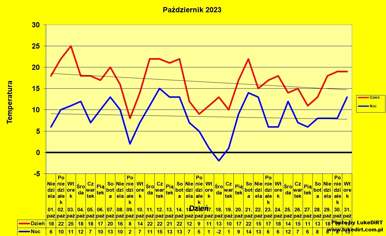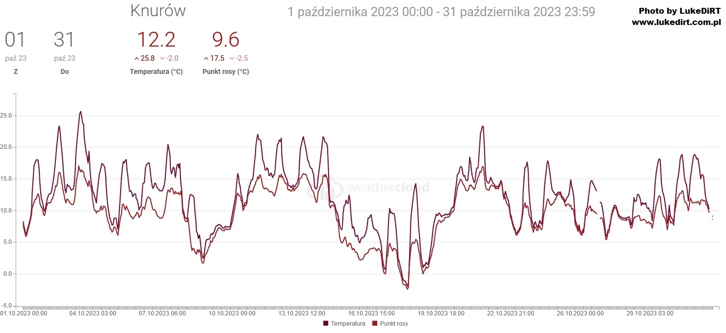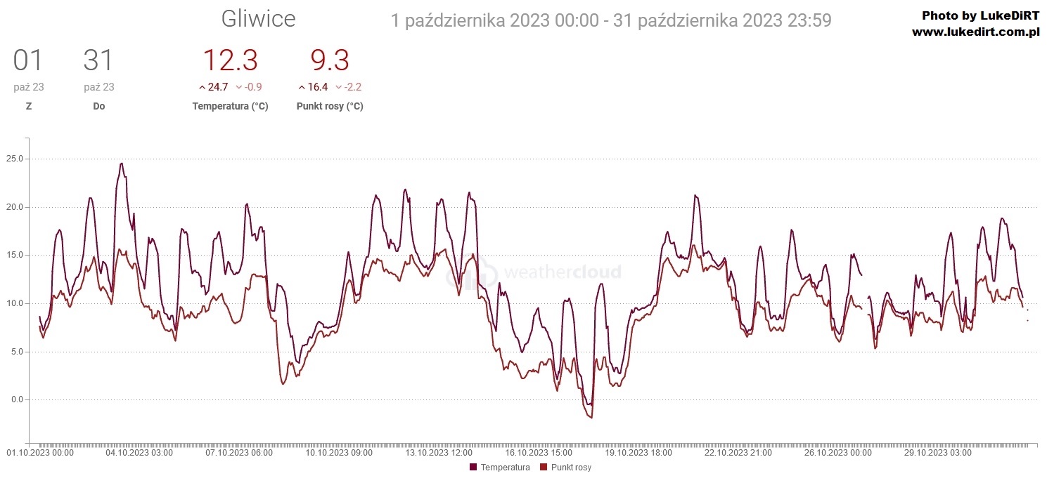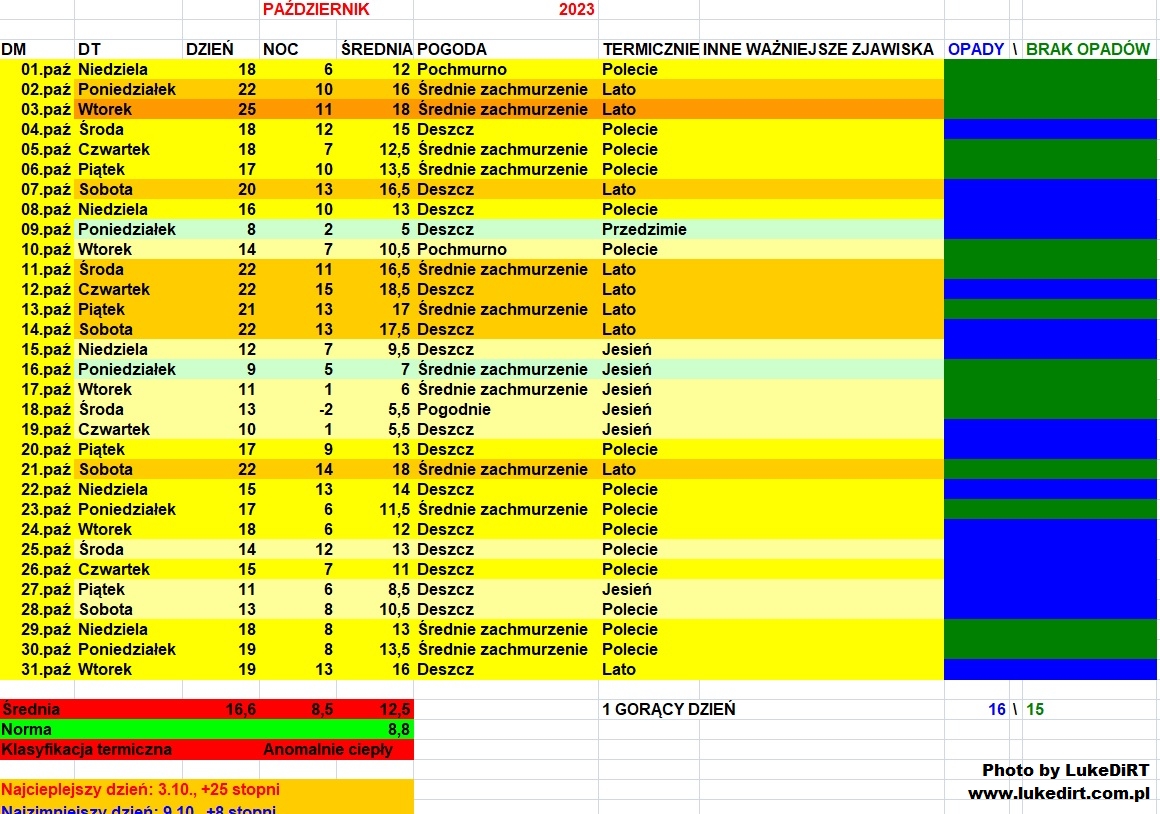 Co tu mogę napisać, miesiąc ciekawy, który odbieram pozytywnie. Pomijając tą okoliczność, że w ostatni dzień miesiąca na wskutek poślizgu na mokrej drodze zderzyłem się ze słupem i sobie stłukłem oprawkę w prawym szkle okularów oraz trochę poobijałem sobie kolano, to całkiem dobrze wspominam pogodę przeważnie w nim panującą. Najbardziej mnie ucieszyło ocieplenie koło 20.10. Ogólnie październiki jako miesiące nadziei są zawsze od kilku lat dla mnie najlepszym okresem w życiu...