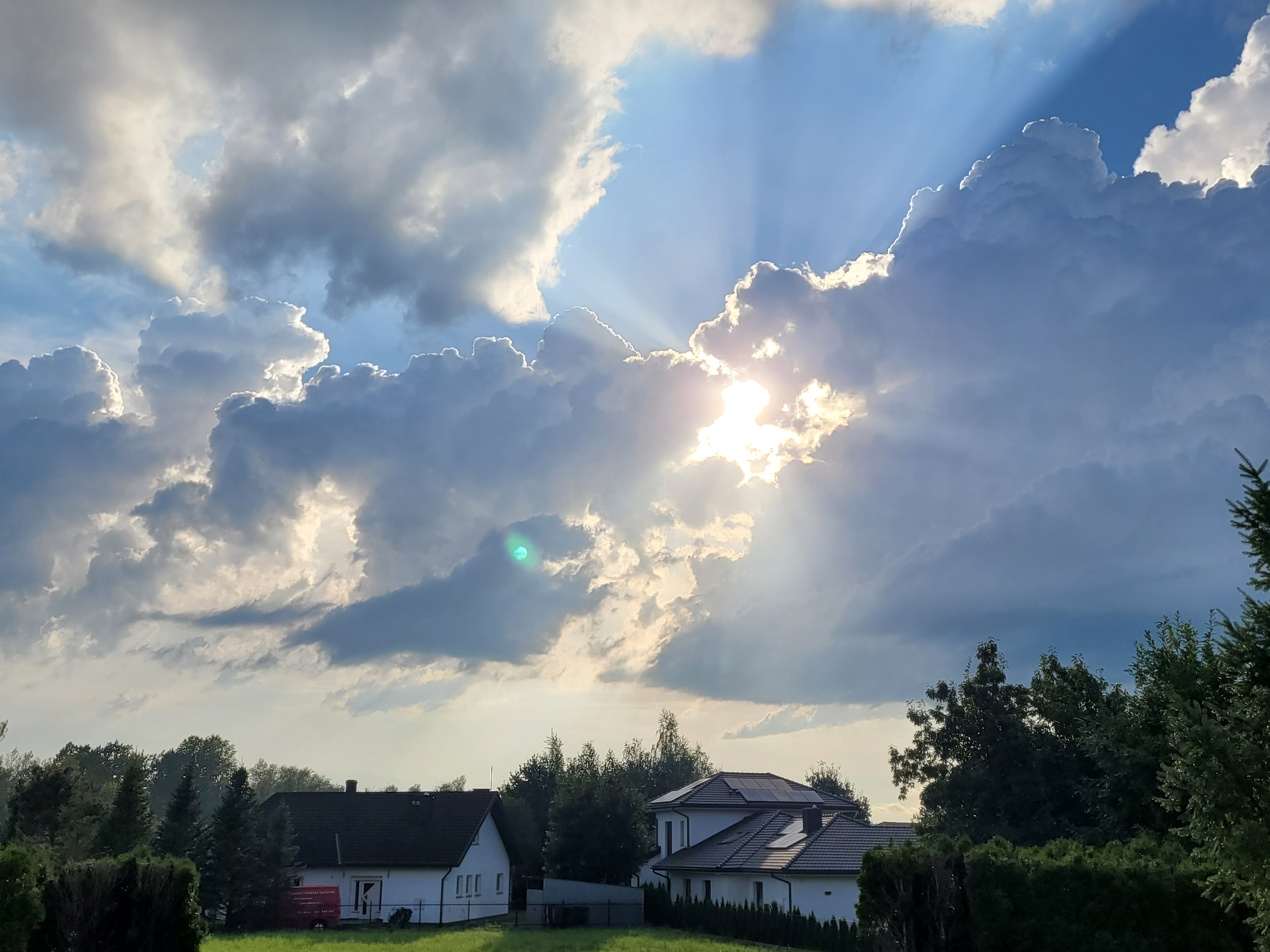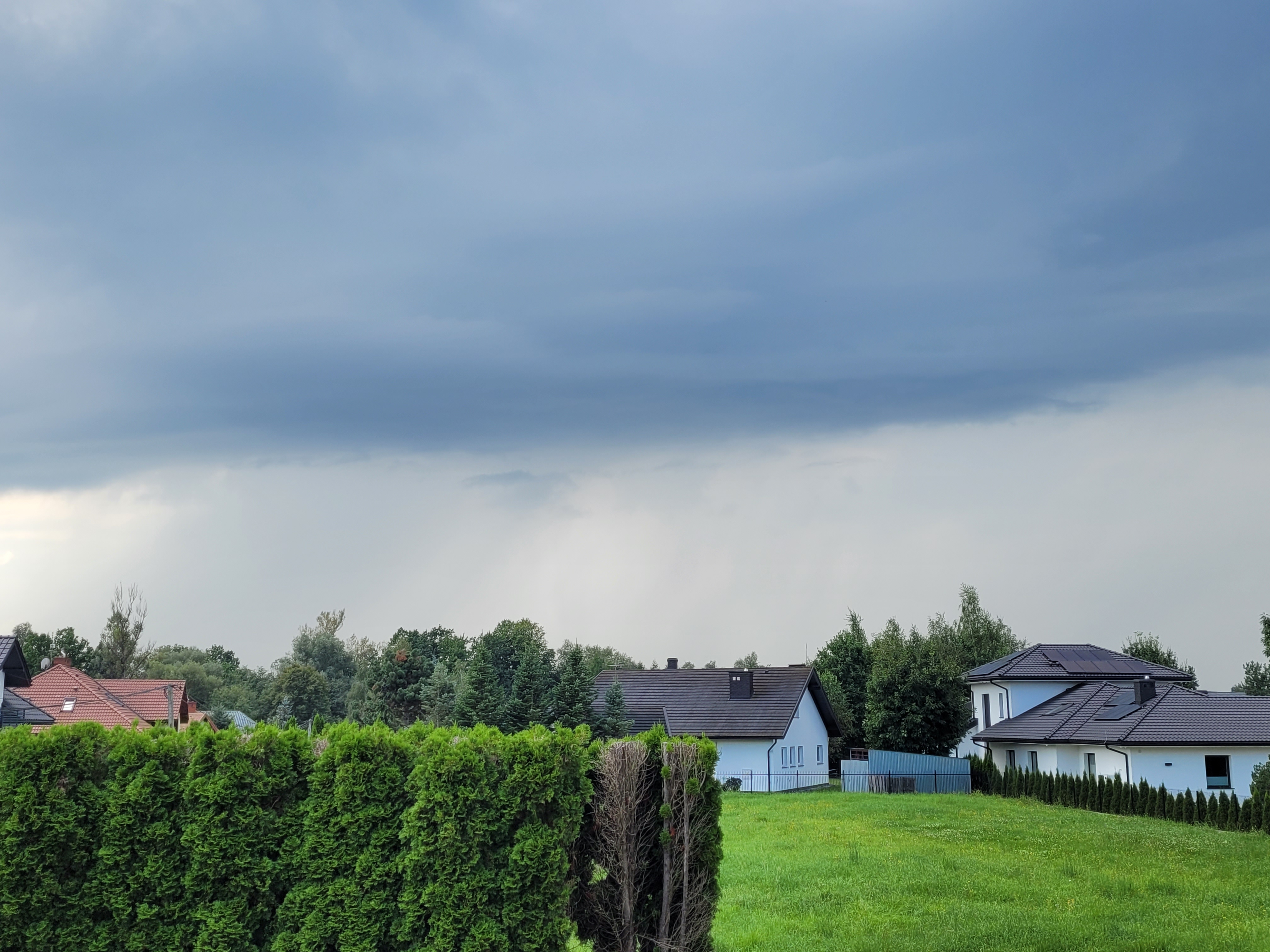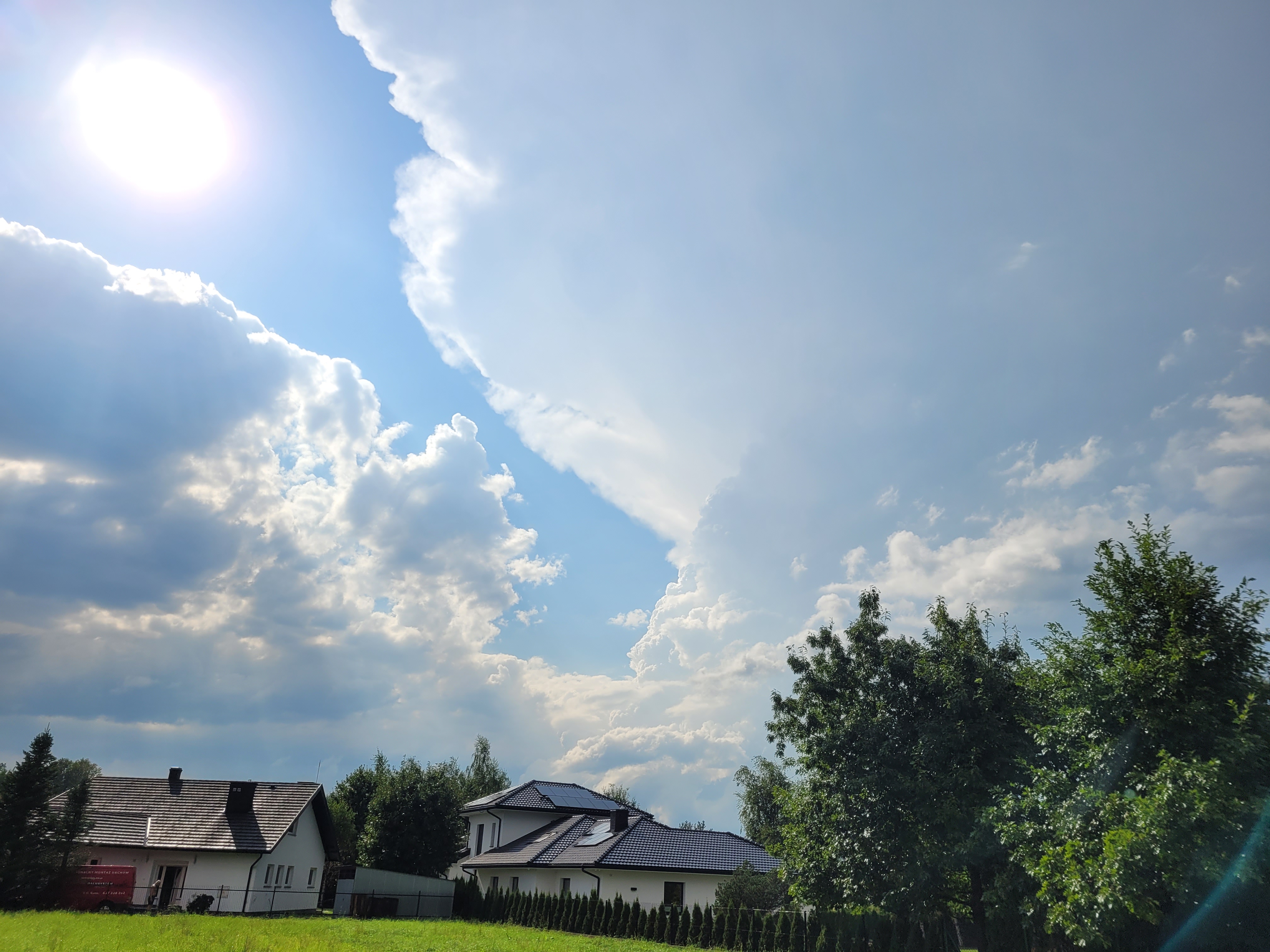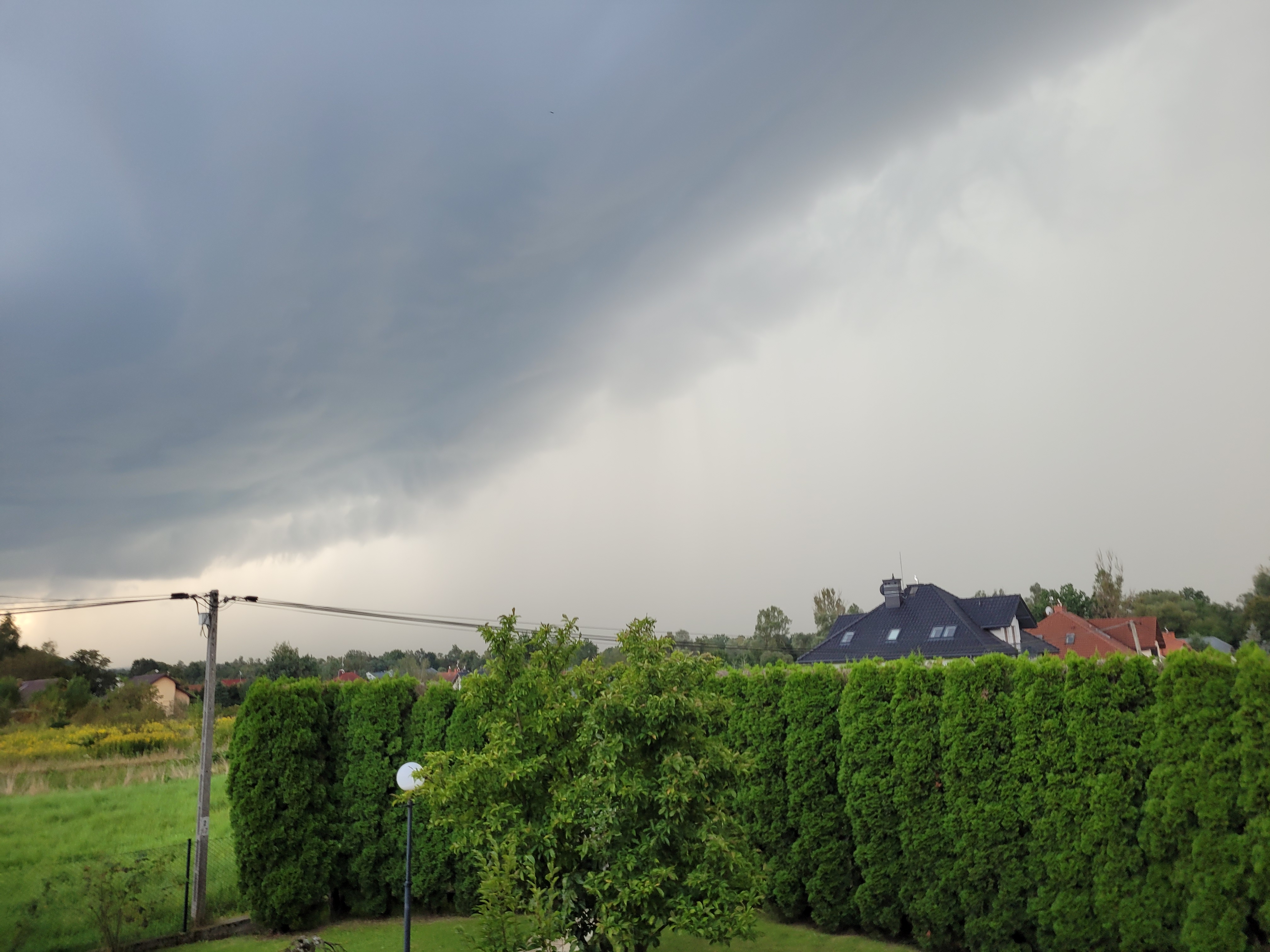 O 14:50, kiedy siedząc beztrosko na balkonie uczyłem się nieco archaicznej ustawy o prawie wekslowym i czekowym, nagle oblał mnie zimny pot. W jednej chwili zobaczyłem jak całe otoczenie zaświeciło się na biało - jasne światło oślepiająco odbiło się od dachów i okien sąsiednich domów. Po około pół sekundy usłyszałem rozdzierający eter, ogłuszający huk, a równolegle z nim dziwny dźwięk, jakby sprężonego od temperatury powietrza... Momentalnie zerwałem się na równe nogi i choć do środka domu miałem zaledwie kilka kroków, wręcz bałem się czy zdążę zanim spadnie kolejna bomba... Piorun musiał uderzyć gdzieś bardzo blisko po drugiej stronie. Podszedłem do okna, a tam... kolejna bomba - wielki, krzaczasty piorun, mógł uderzyć nieco dalej, ale nie więcej niż 300 metrów ode mnie. Tak wyglądały chmury zbliżającej się nawałnicy.
