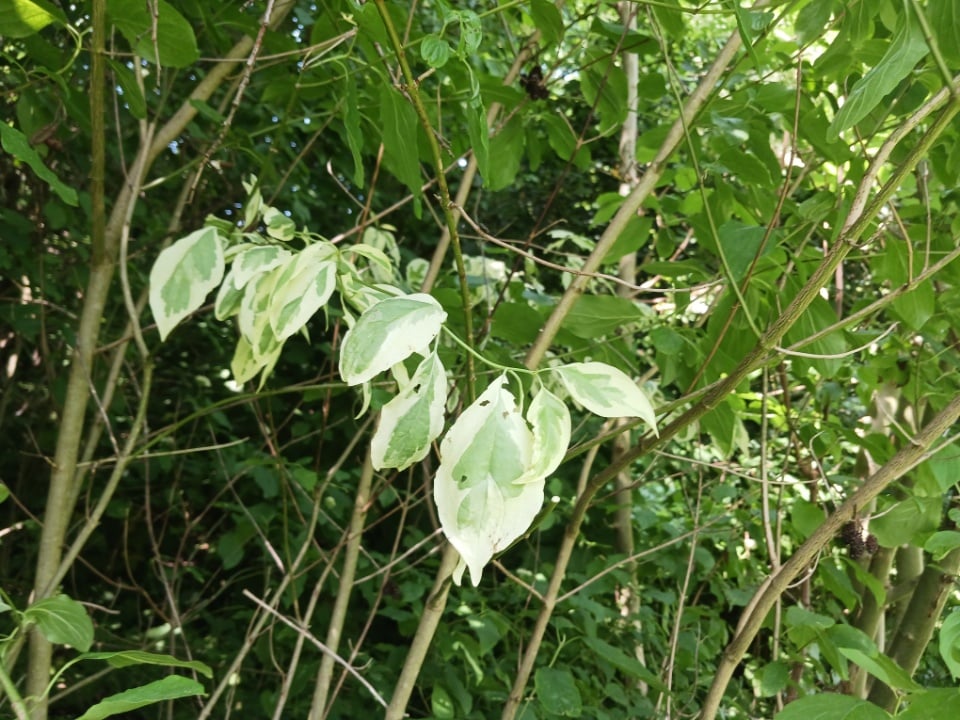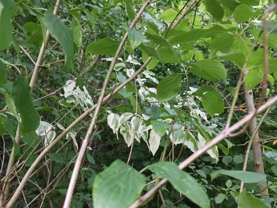 Pośród pędów derenia świdwy trafiłem na wyróżniający się odrost, którego liście są biało obrzeżone. Co ciekawe akurat u tego gatunku derenia nie ma takiej odmiany, więc w przyszłości być może ją opatentuje
