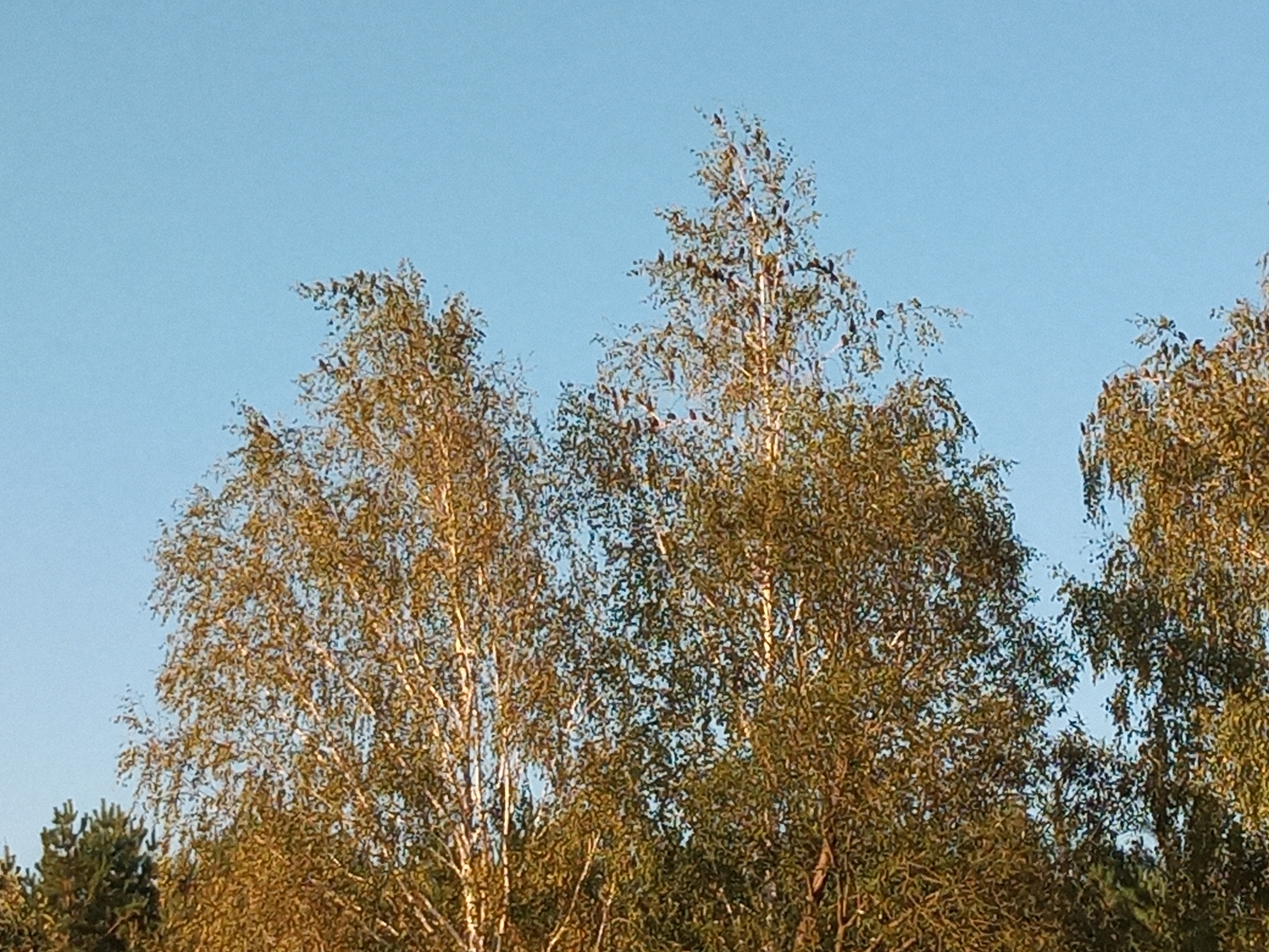 Na początek stado szpaków na brzozach. Wypatrują słodkich owoców. Na naszych działkach i w pobliskich wsiach wszystkie są już zebrane, więc ptaszki będą musiały "obejść się ze smakiem". Niedługo odlecą na południe Europy.