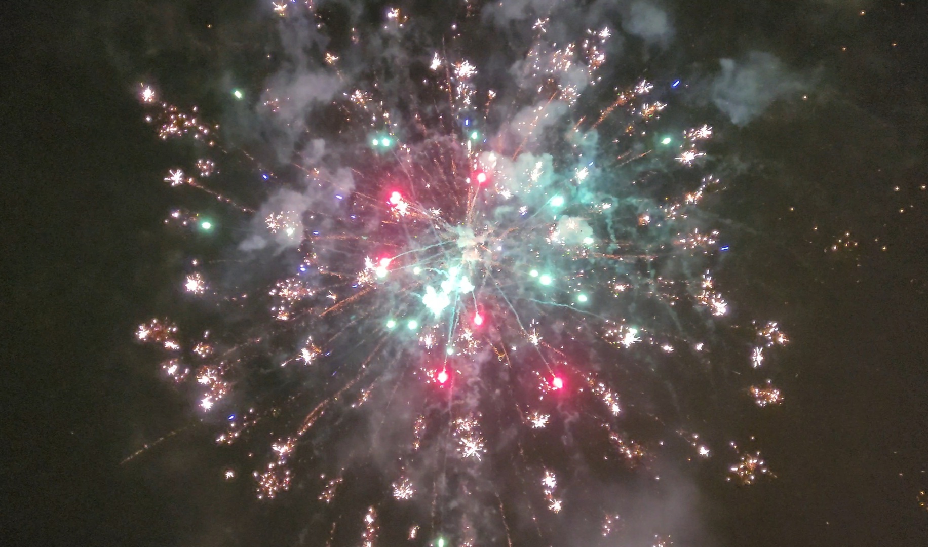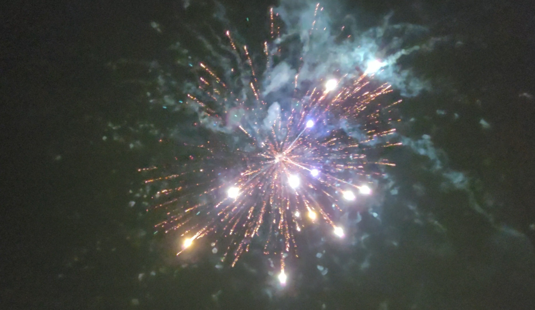 Bardzo ładnie :) Choć z perspektywy fotografującego niezbyt lubię wyrzutnie z efektem cracklingu. Na zdjęciach najczęściej wychodzi wtedy plama światła, a bardziej estetyczne są rozłożyste efekty palm i wierzb. Akurat prawie wszystkie kostki u sąsiadów miały crackling, więc - moim zdaniem - najlepiej wyszło mi to zdjęcie, na którym widać wybuch rakiety z efektem brokatu.
