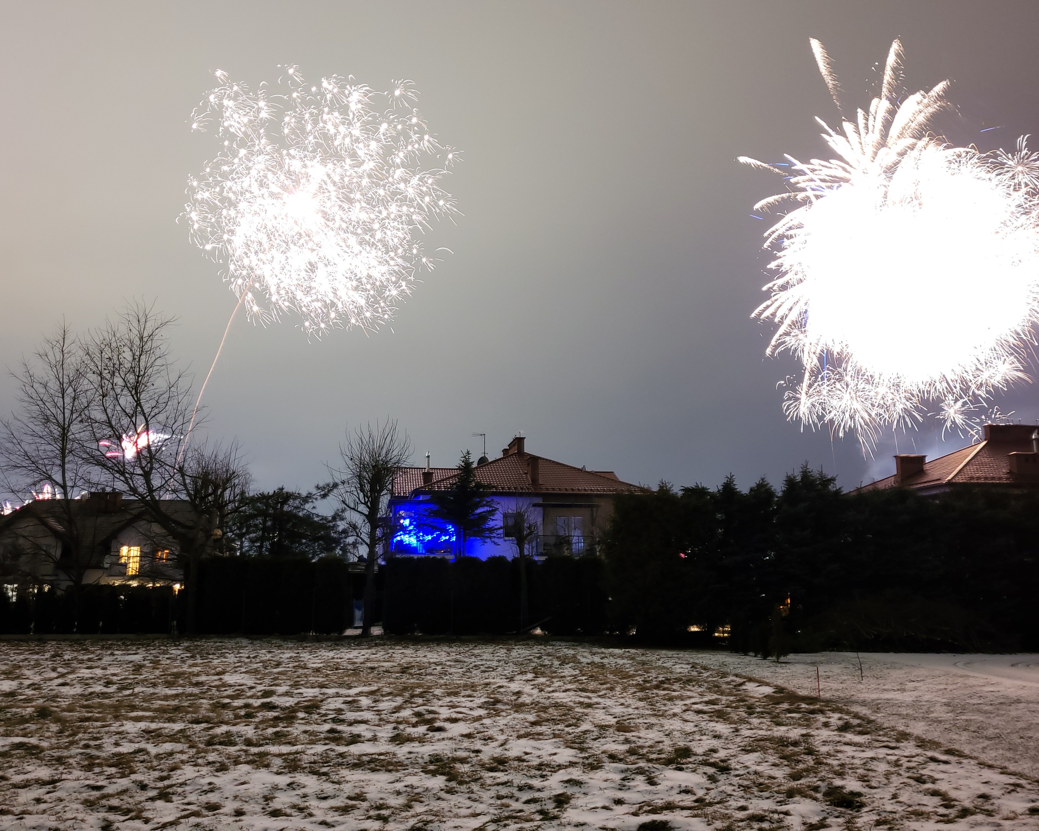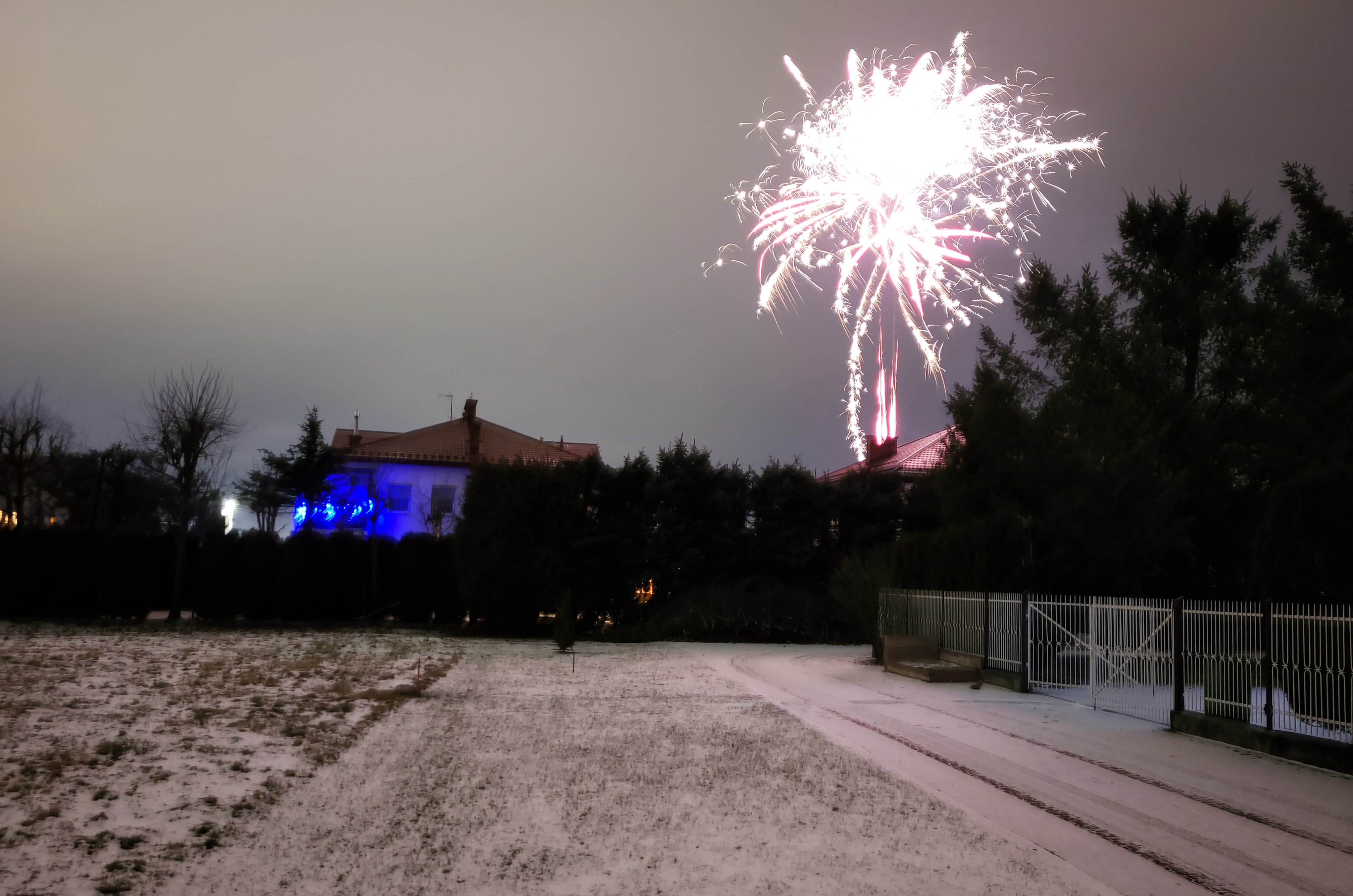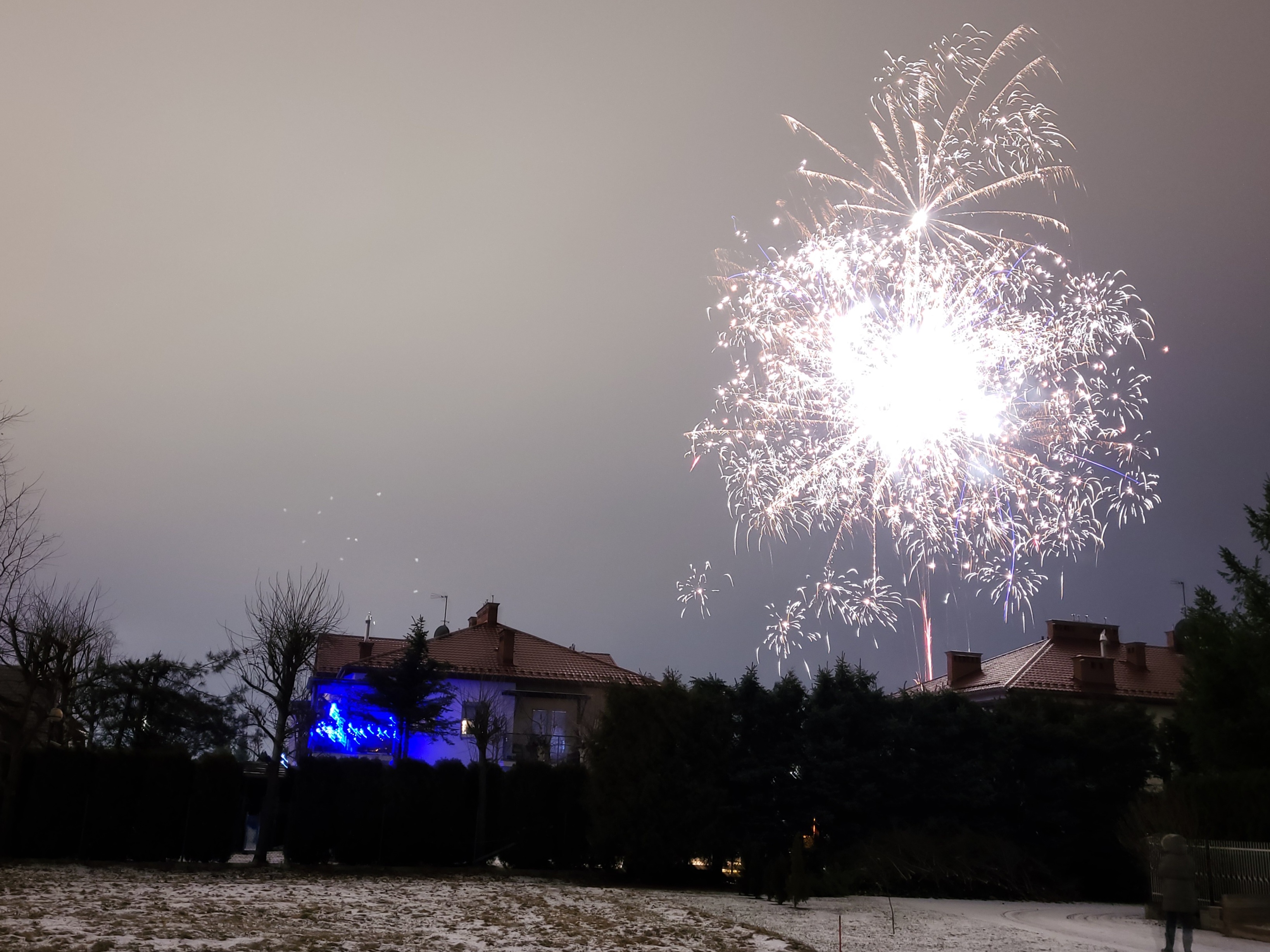 Pewnie uchwyciłbym więcej, gdybym robił zdjęcia dokładnie o północy, ale wtedy też sam chciałem strzelić. Dawniej na ogół było tak, że fajerwerki odpalałem tak o 23:45, a na samą godzinę 24 albo z pola albo z domu oglądałem jak strzelają inni.
