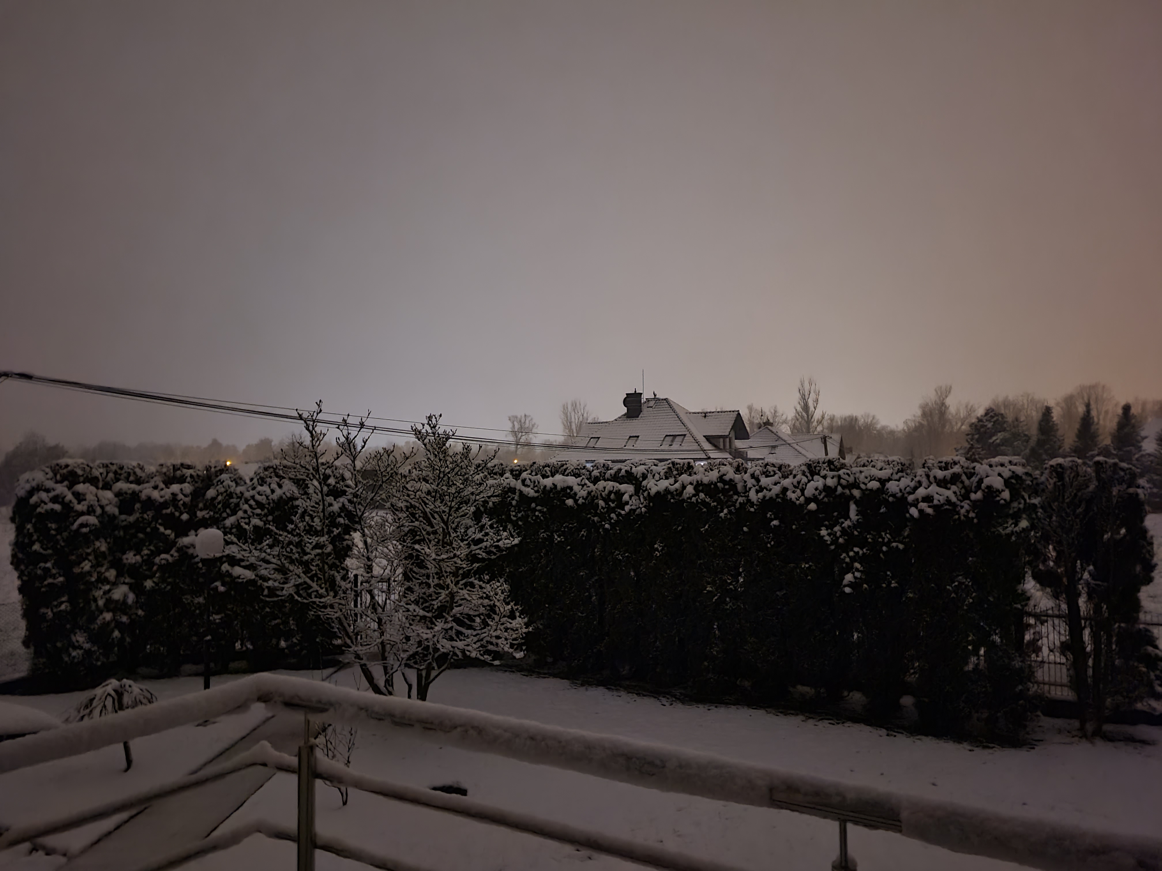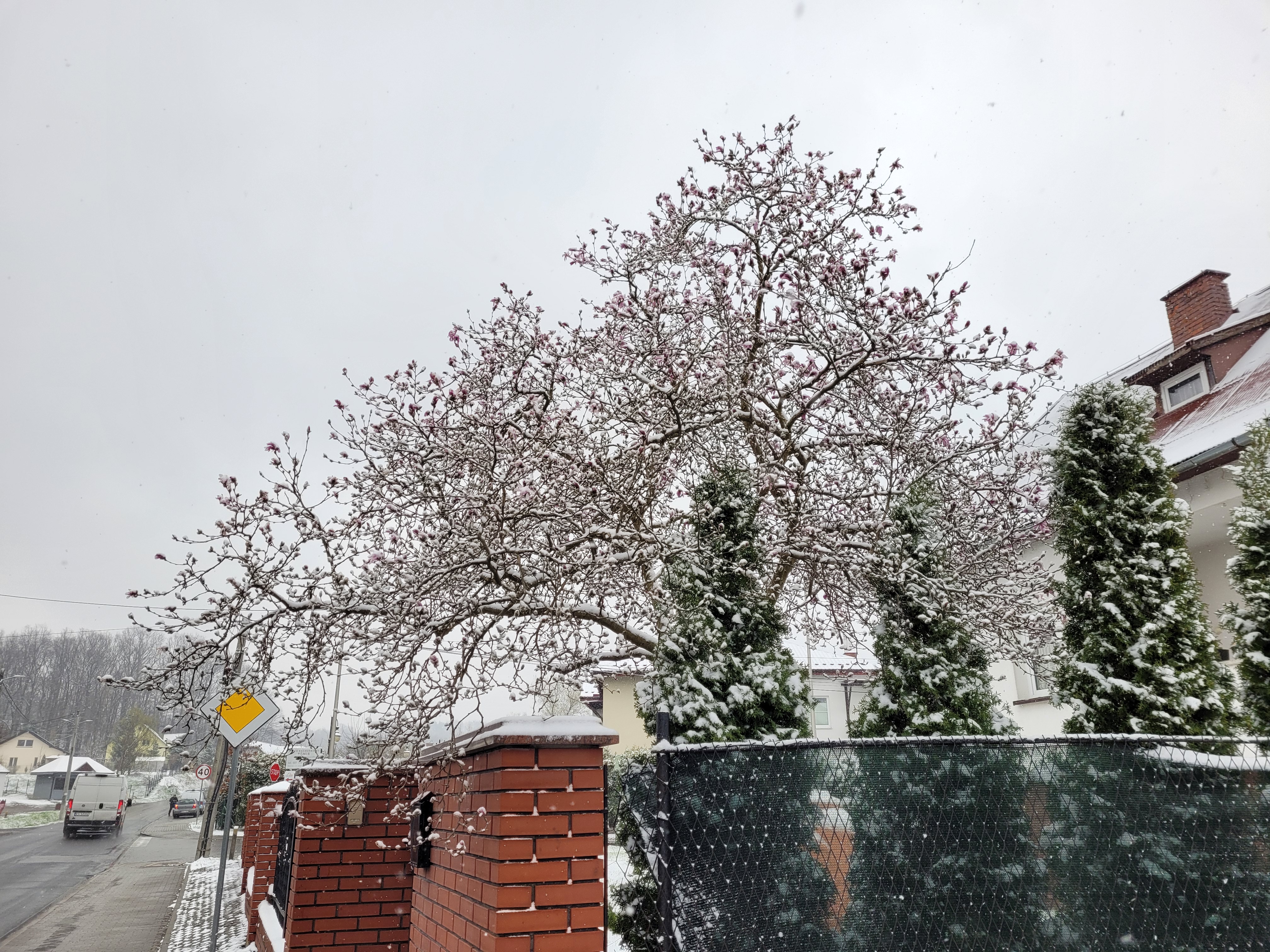 Tymczasem gęsty, drobny śnieg znowu zaczął sypać. Choć temperatura jest minimalnie dodatnia (przynajmniej nad Dunajcem jest +0,3, może tu mam chłodniej), zabiela chodniki, które opierały się śniegowi.