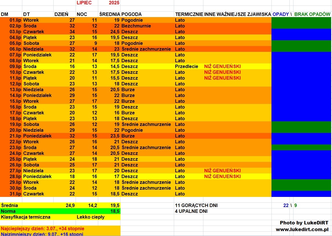 Patrząc na dane, to mam wrażenie, że przeżyłem nieco innego lipca, przynajmniej w kwestii temp. Opady jednak paradoksalnie występowały przez większość czasu w podobnych sumach, no i ogólna proporcja dni mokrych i suchych również się zgadza- ta druga grupa była bardzo skromna na tle pierwszej
