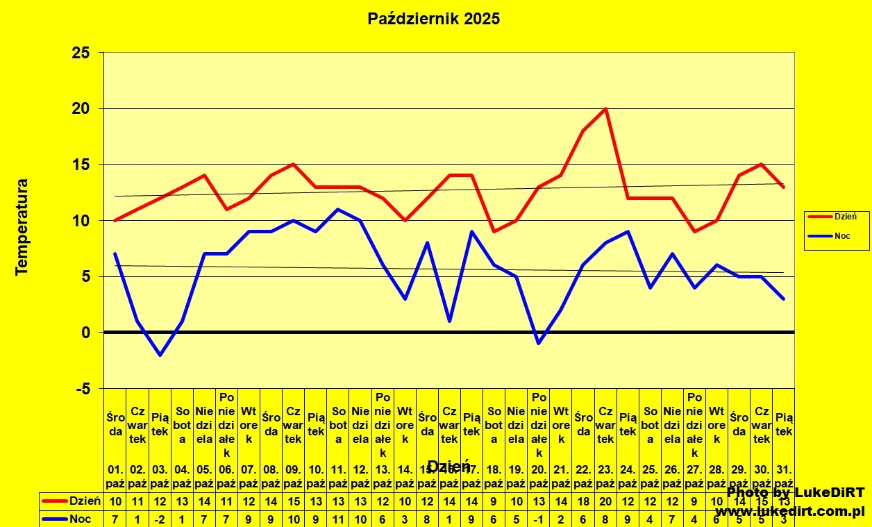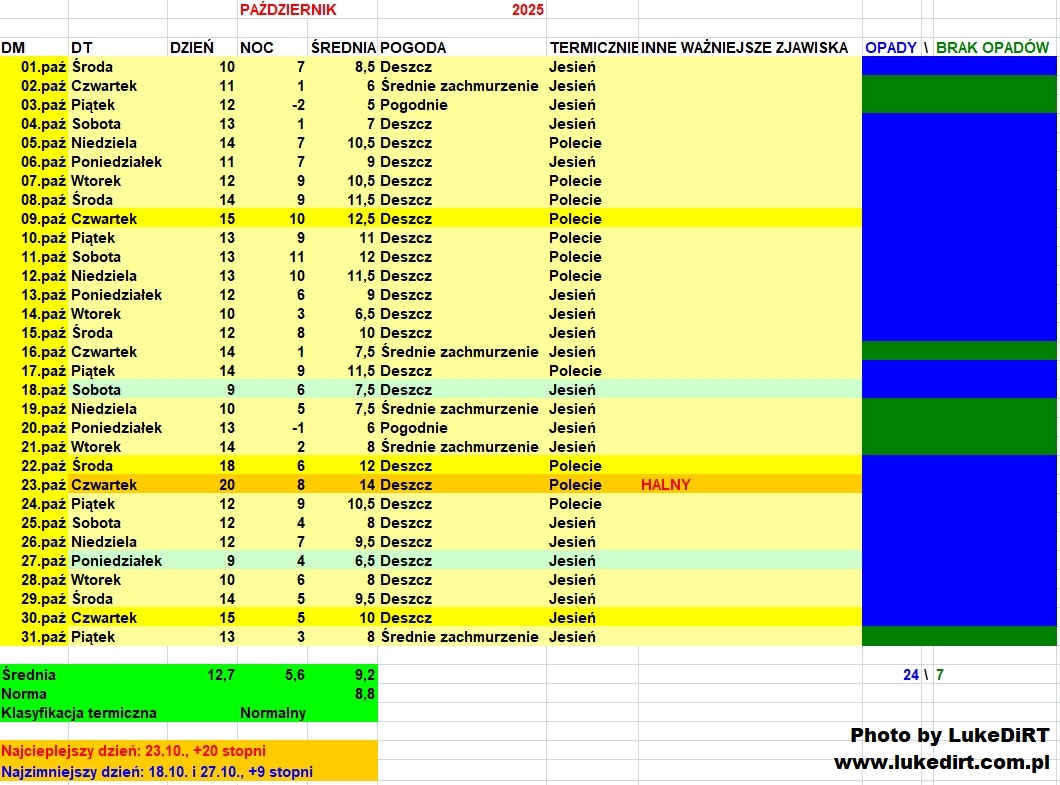 To u Ciebie październik prawie o 2 stopnie był cieplejszy niż u mnie . Jeszcze dokładnie nie wiem jak będzie bo teraz moja minimalna dzisiaj się dopiero obniża bo w nocy było ciepło. Ale pewnie wyjdzie 7,3*C do tego aż 26 dni z deszczem i opadem 110 mm.