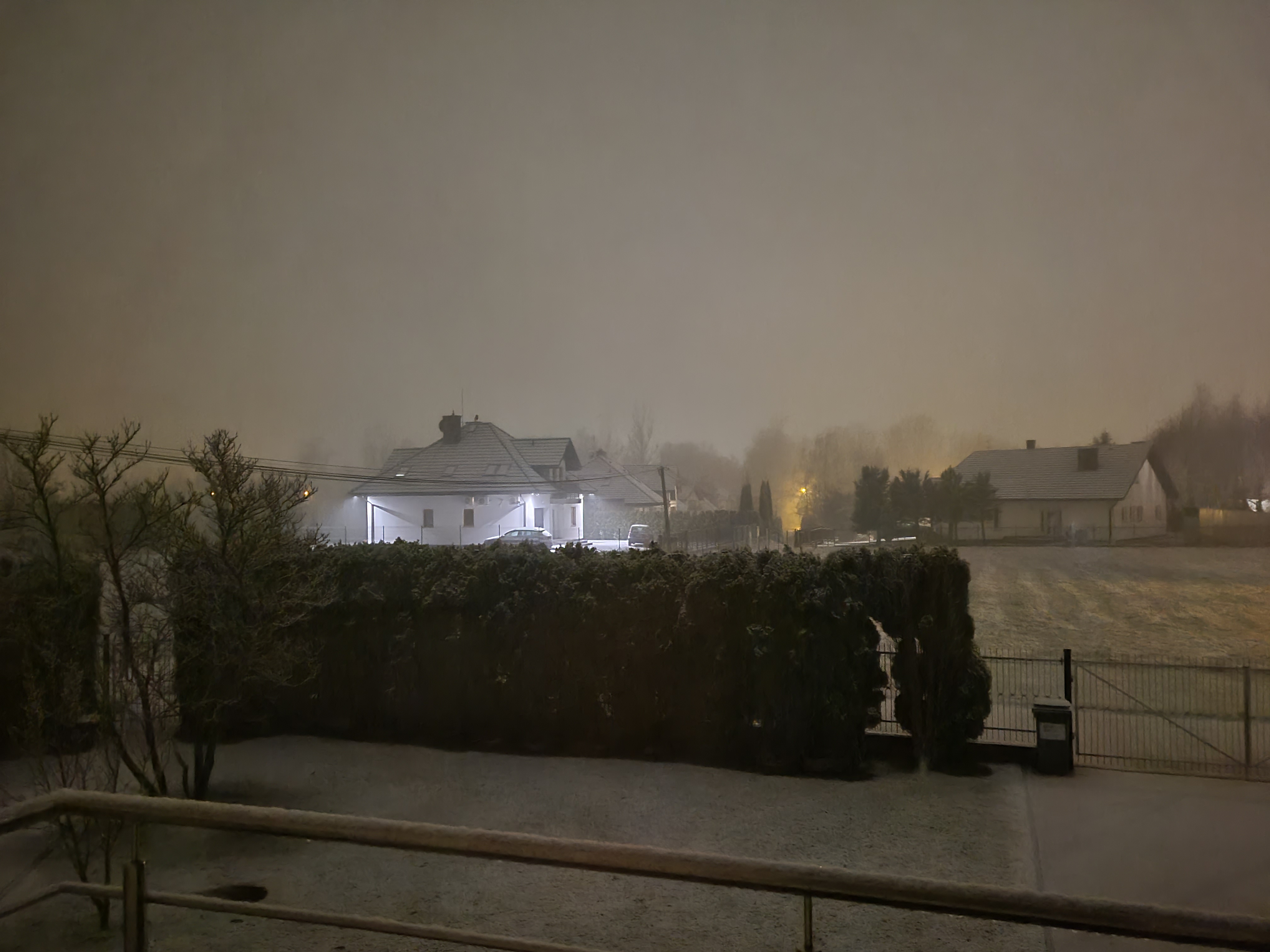 Zaczęło się zaledwie godzinę temu, jeszcze o 5:30 nie było niczego. Zima wkroczyła do akcji. Robi się biało, śniegu przybywa, a temperatura zaczyna odpowiednio współpracować