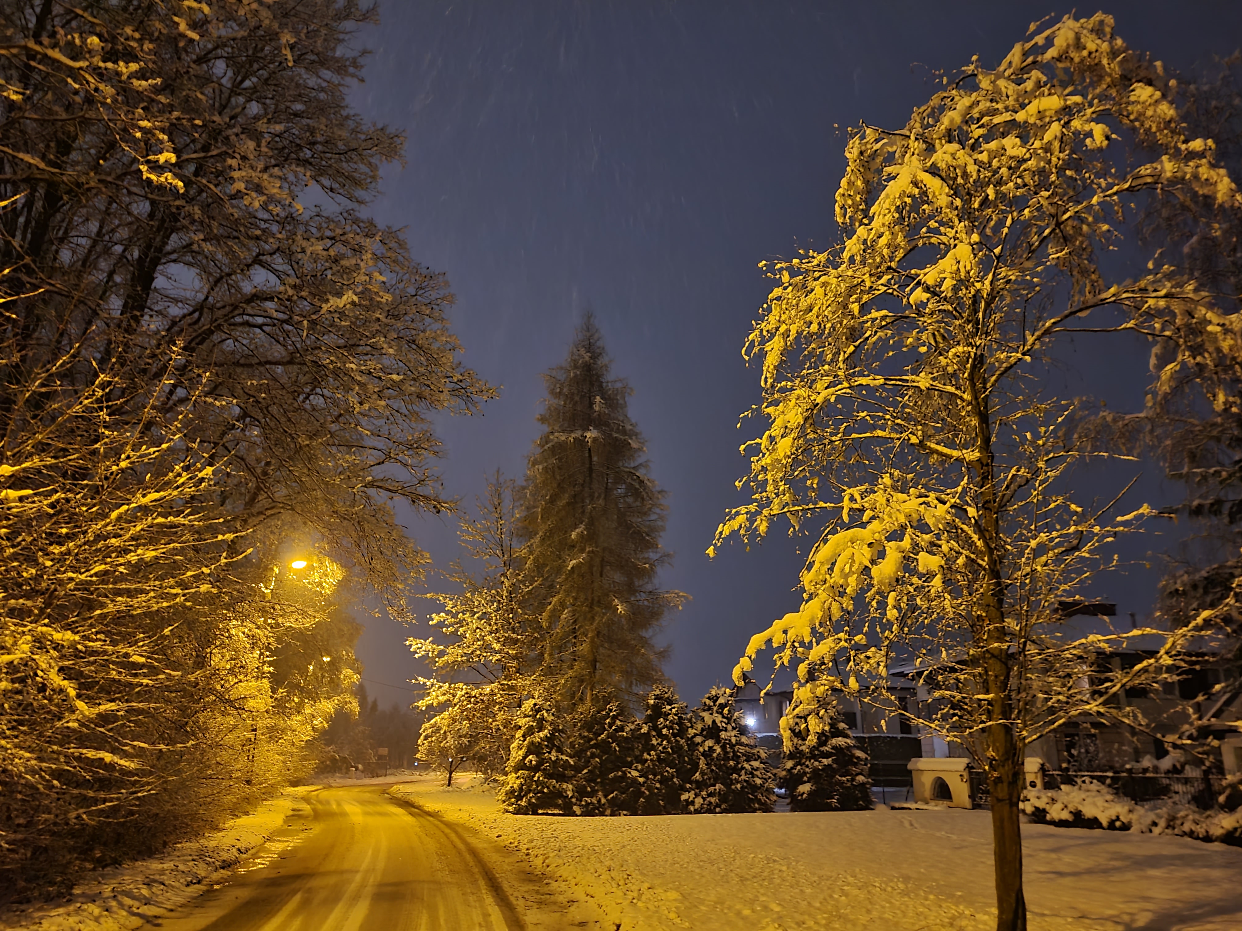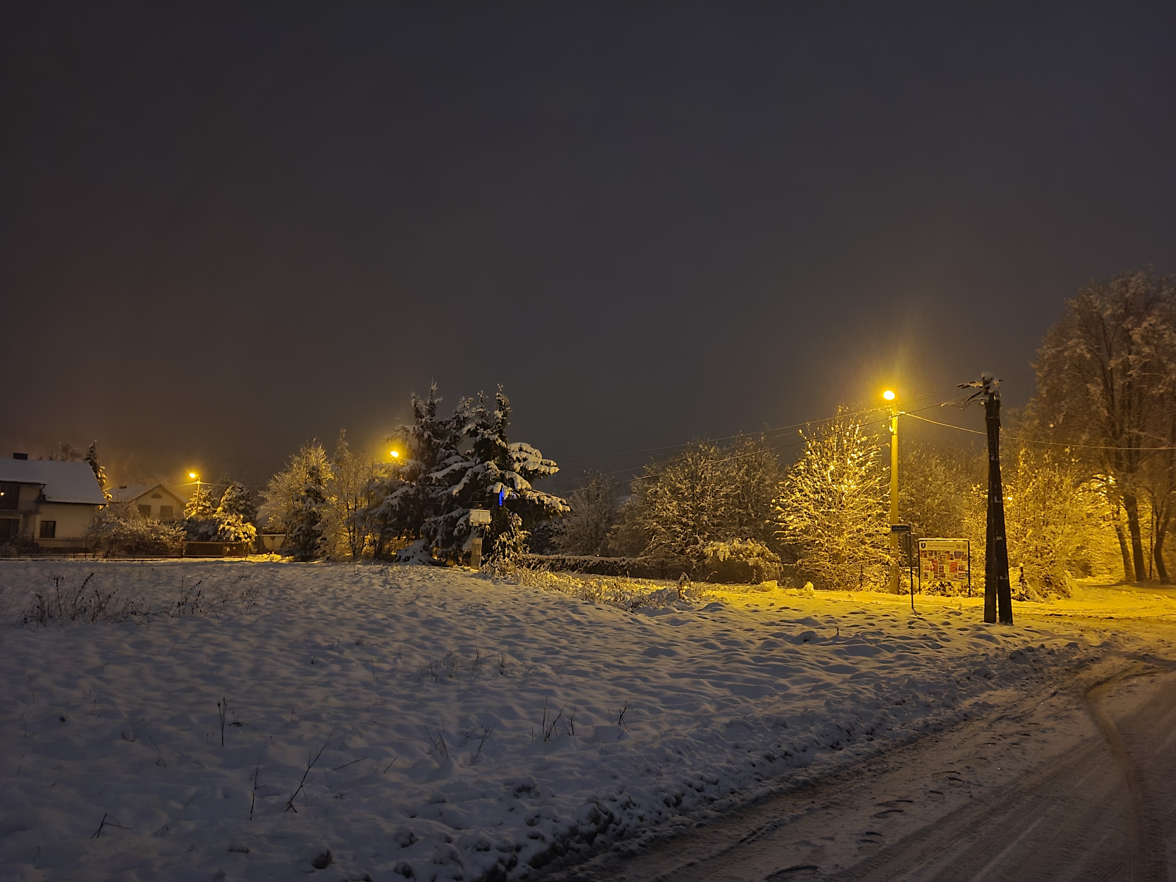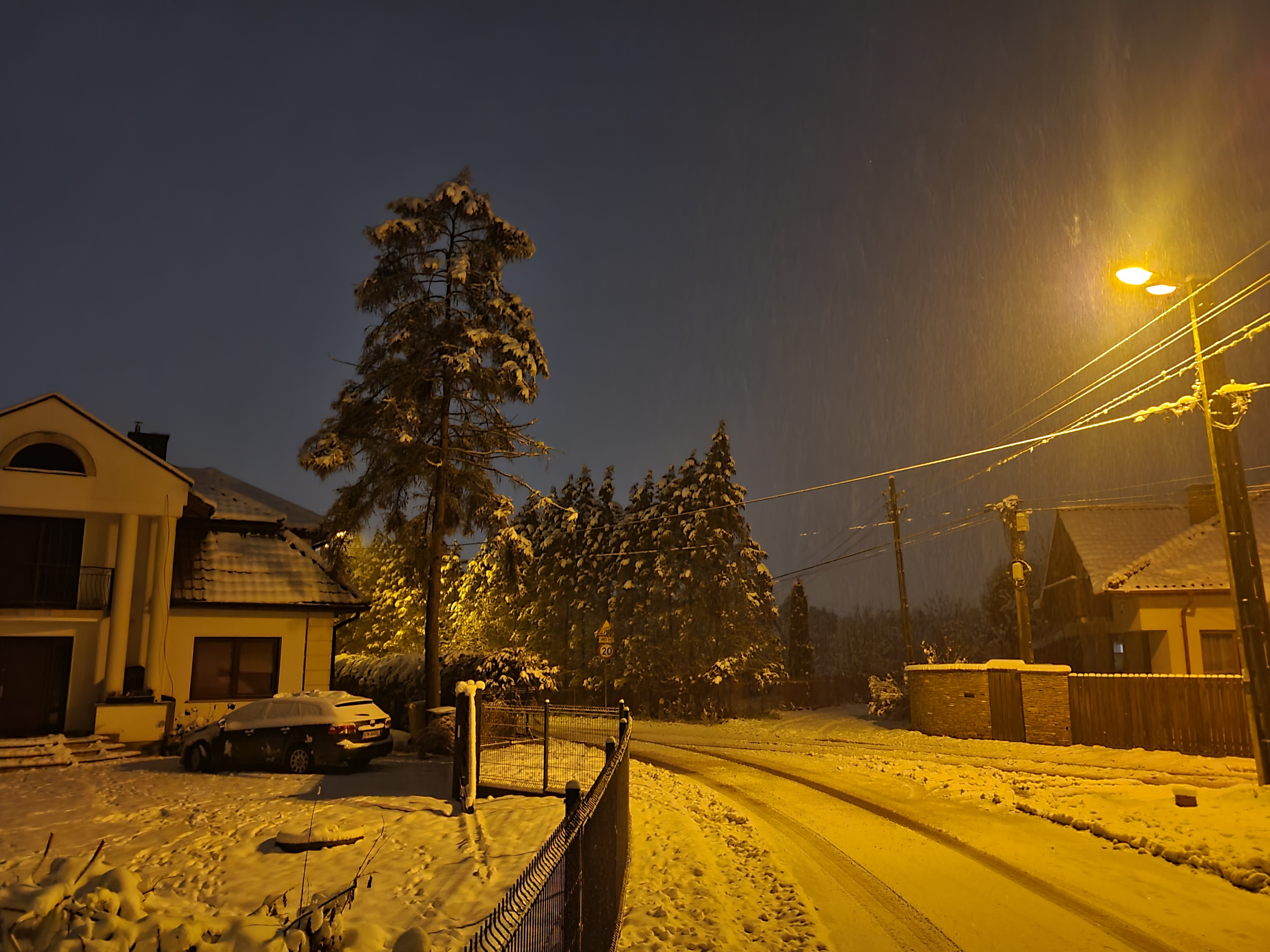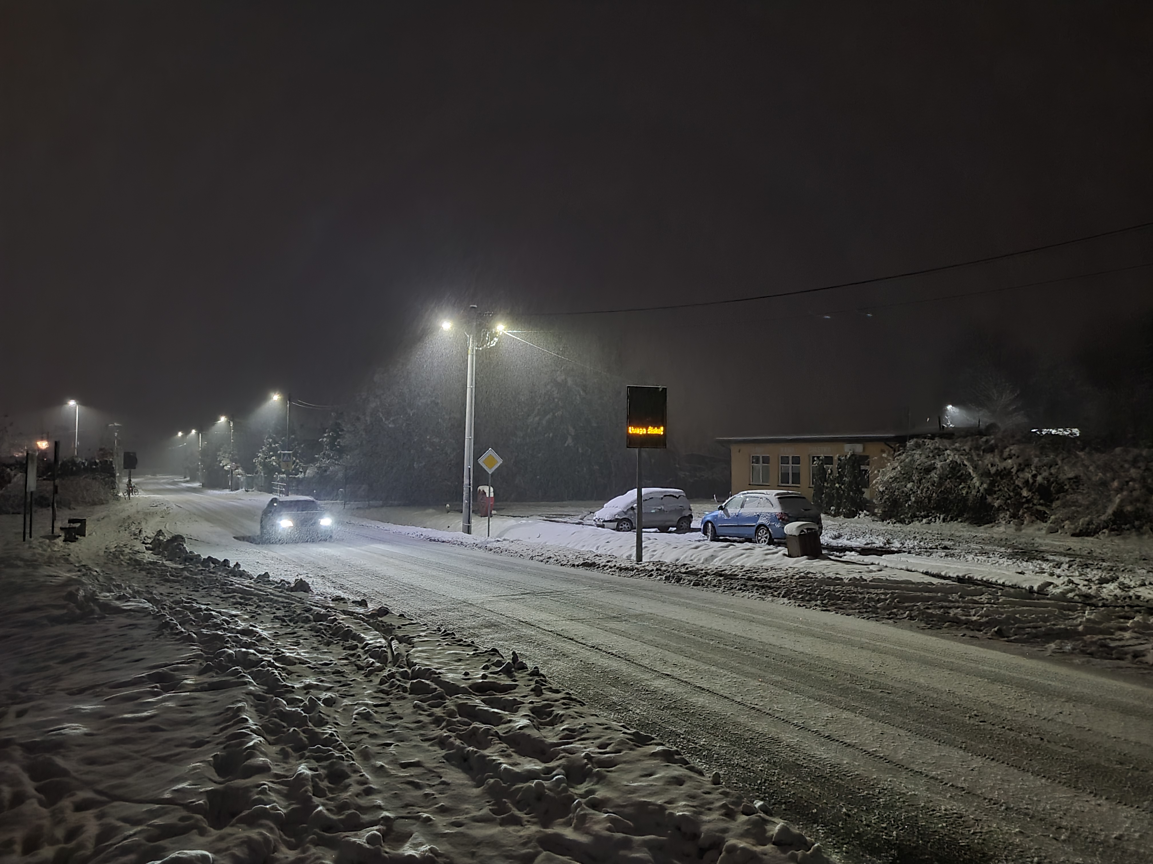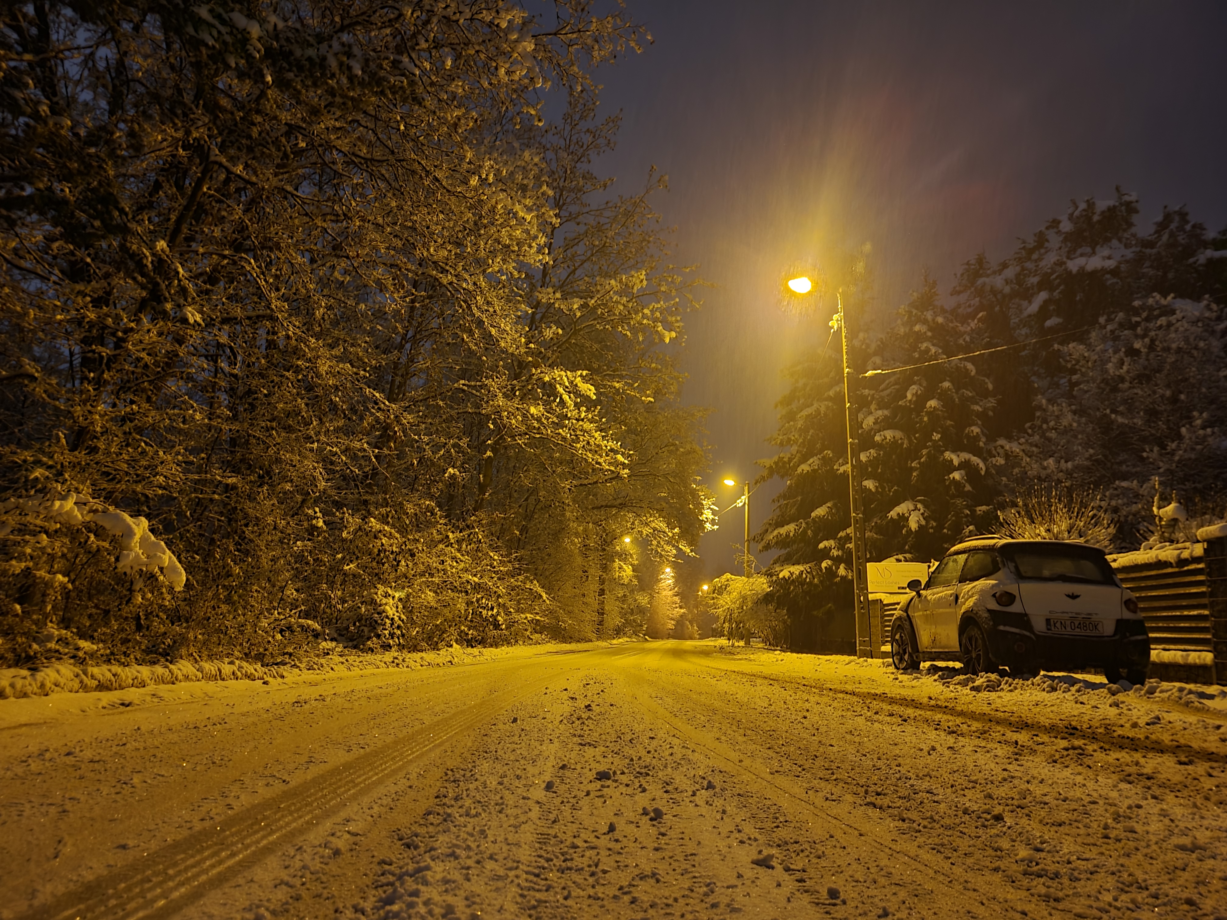 Najbardziej mi się podobają fotki przy białym (LEDowym) oświetleniu. Bo przy pomarańczowym oświetleniu sodowym kolor śniegu jest po prostu przekłamany. A z powodu jego wysokiego albedo mocno odbija on światło, więc chmury też są bardziej pomarańczowe niż zazwyczaj