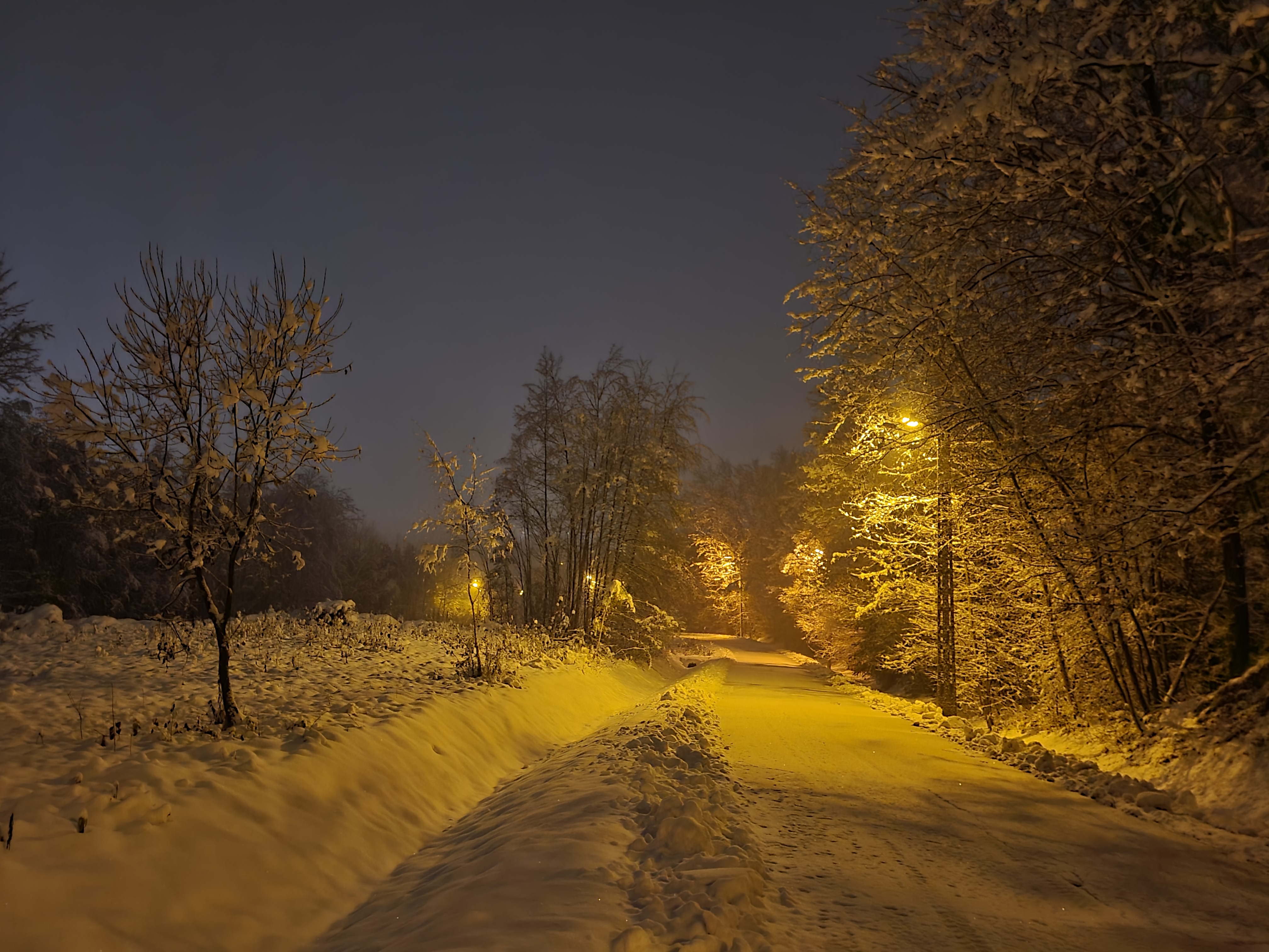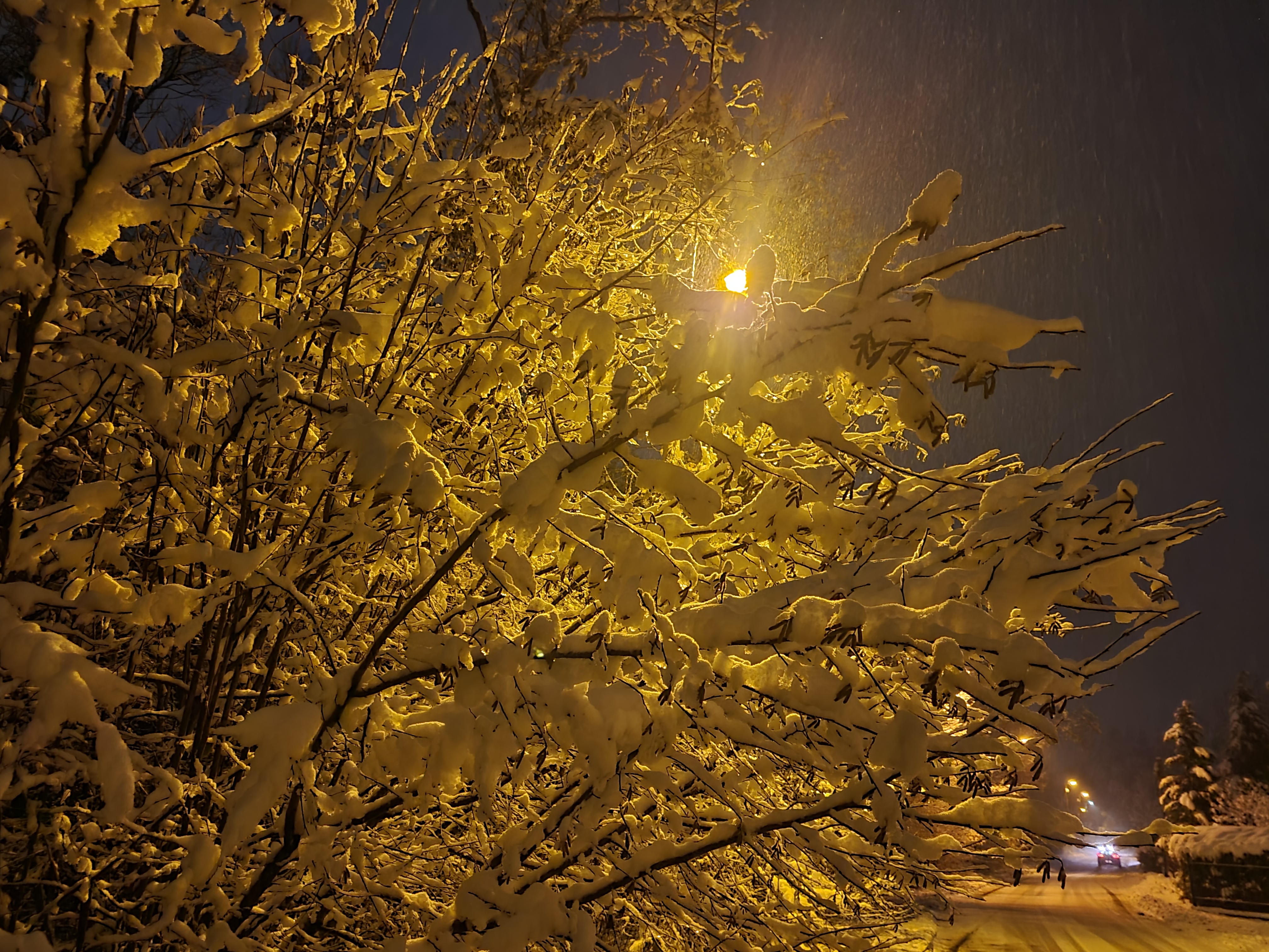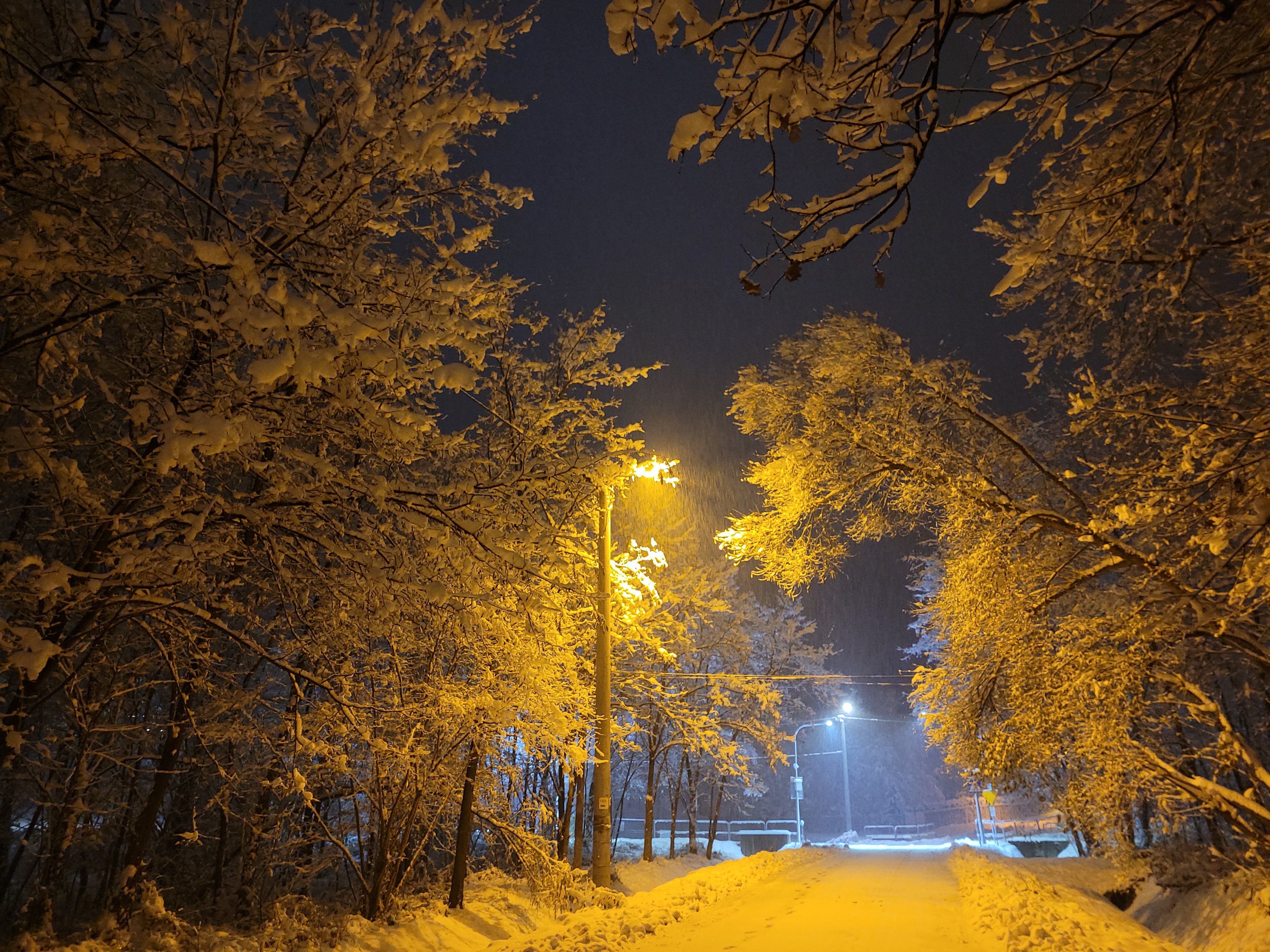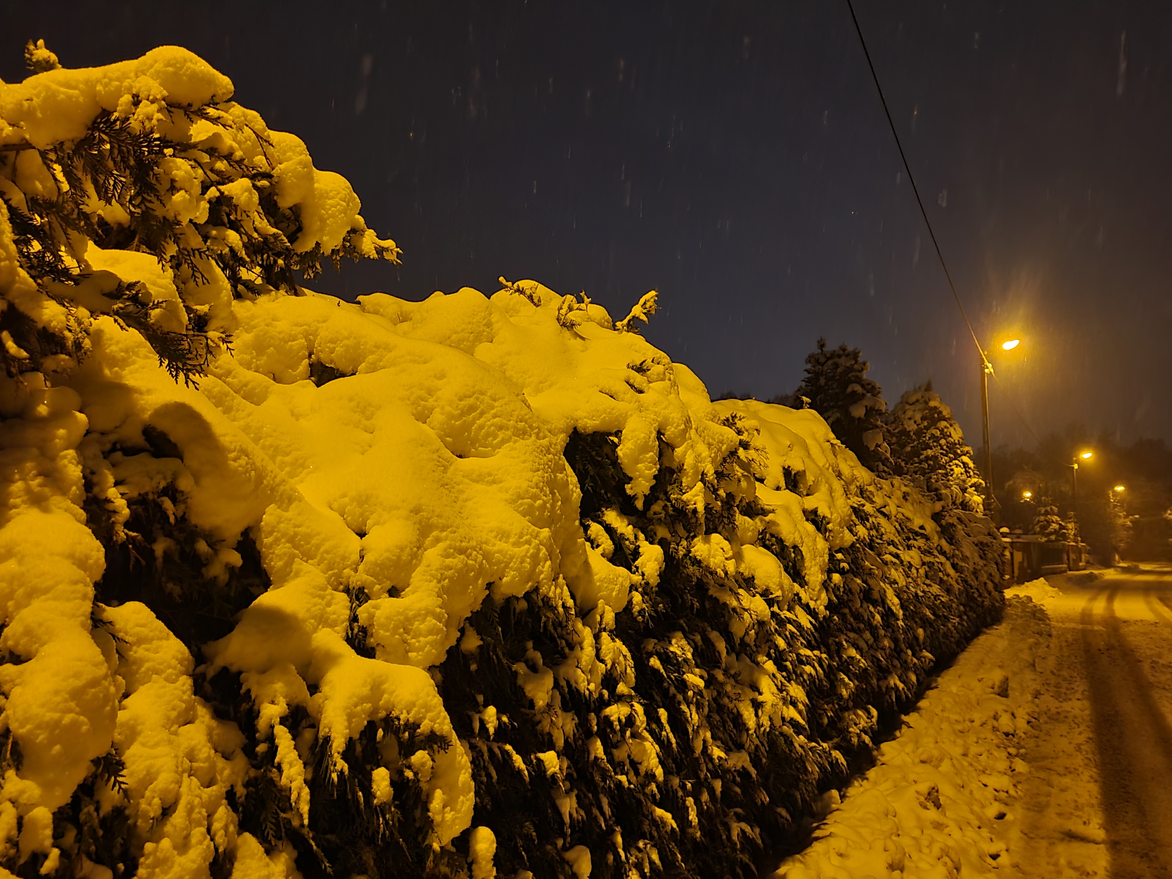 Najbardziej mi się podobają fotki przy białym (LEDowym) oświetleniu. Bo przy pomarańczowym oświetleniu sodowym kolor śniegu jest po prostu przekłamany. A z powodu jego wysokiego albedo mocno odbija on światło, więc chmury też są bardziej pomarańczowe niż zazwyczaj