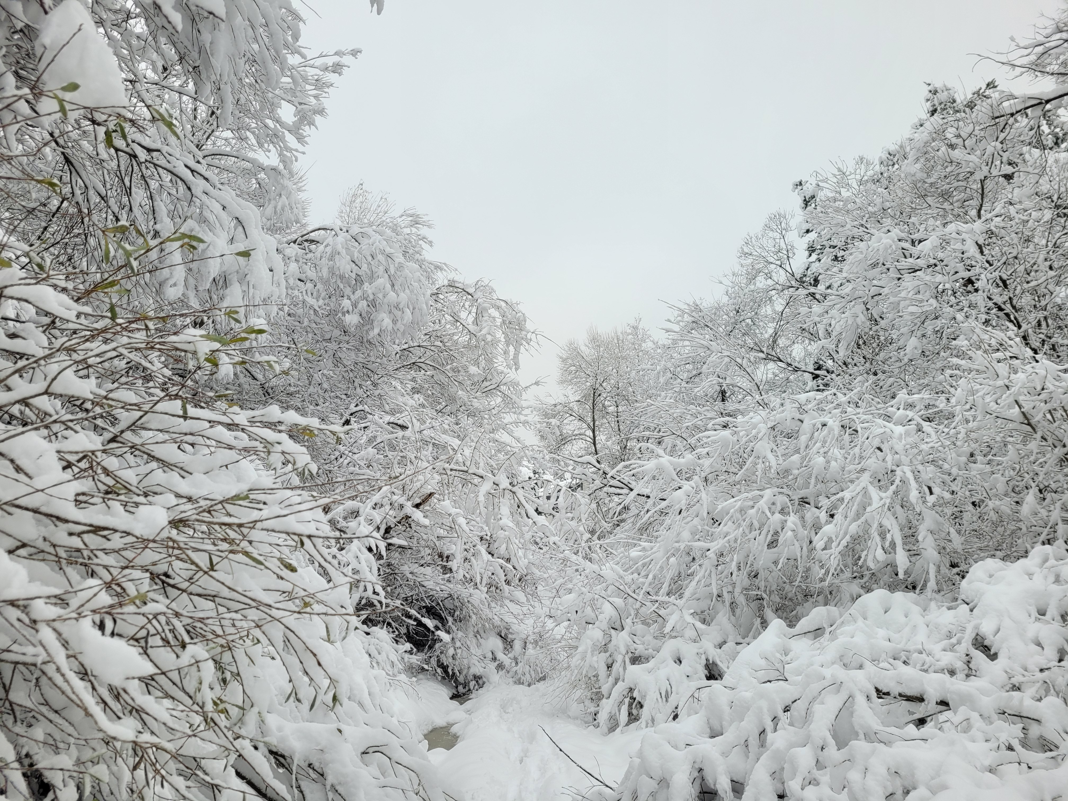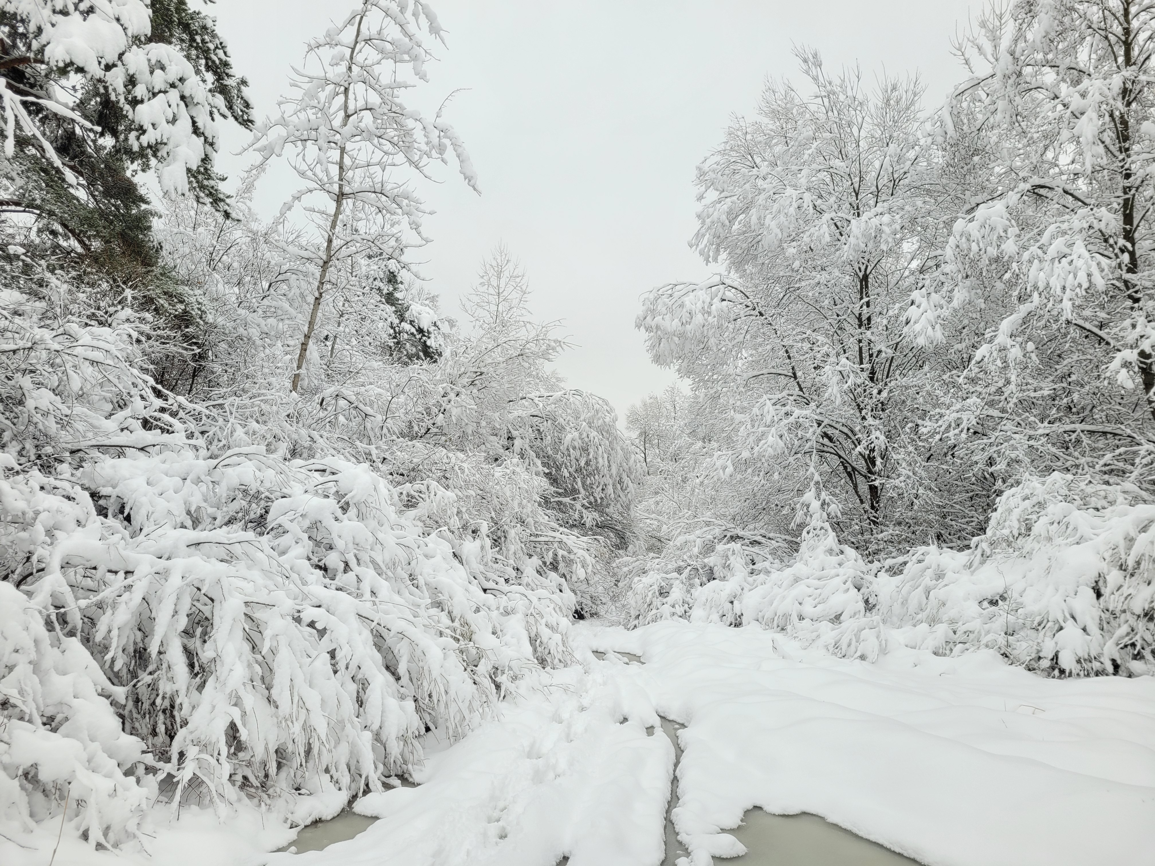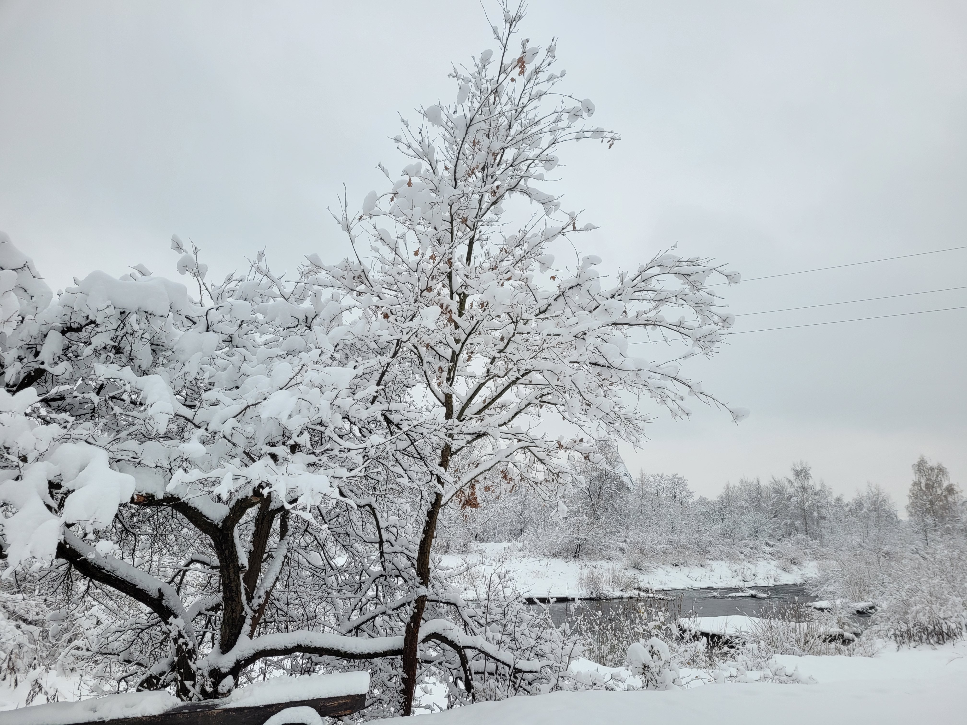 Dziękuję Zima dziś kompletnie mnie zaskoczyła swoją formą - nie przypuszczałem że będzie aż tak. Trzy ostatnie zdjęcia pokazują miejsce, w którym było kiedyś (czyli przedwczoraj) wygodne przejście z ulicy nad rzekę. Teraz wszystkie drzewa są oblepione i trzeba się przedzierać przez gałęzie. I to nadal nie koniec. Nie dalej niż za 12 godzin pokrywa śnieżna będzie u mnie najwyższą dla listopada w tym wieku.