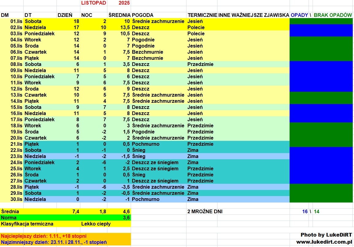 Listopad do bólu generyczny i niezbyt ciekawy, choć też nietragiczny- doceniam za wysokie sumy opadów i udany jak na listopad incydent zimowy w ostatniej dekadzie. W pierwszej połowie było nawet sporo dość przyjemnych dni, nie kojarzących się z takim typowym kiblem kilopadowym, więc ogólnie daje takie 6/10