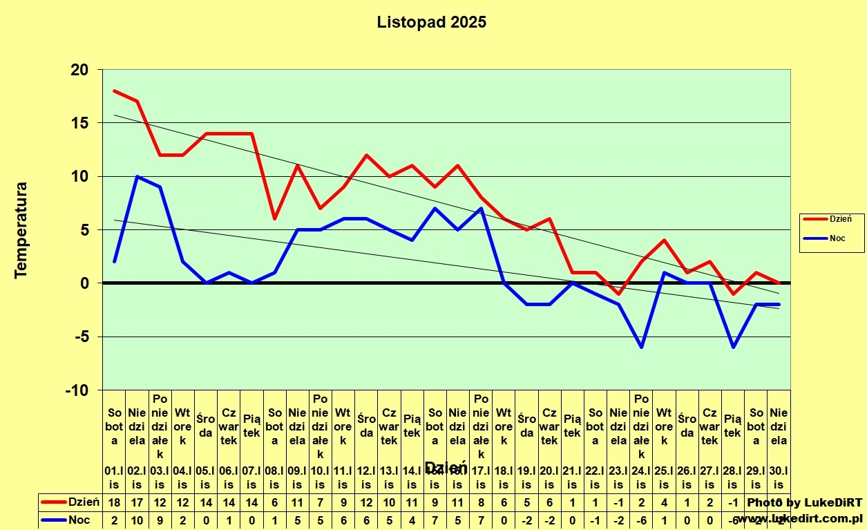 Co można jeszcze powiedzieć o tym miesiącu, że naprawdę dobrze wykorzystywał swoje możliwości w niezsyłaniu typowo astrefowej pogody... Jak prognozy zapowiadały ładny dzień, tak rzeczywiście na ogół przebiegał (grafik tym razem mam taki, że no o tej 8:00 rano wstać muszę, więc niekiedy lampa potrafiła naprawdę podejrzanie długo towarzyszyć- dni suche tym samym przeważnie bywały również ładne) , a jak szykowały się obfite opady (nie tylko deszczu), tak również i one występowały Dopiero teraz uaktywnia się swego rodzaju martwica w pogodzie, ale też jak dla mnie to poziom tego, co się działo w dużej części ubiegłorocznego listopada- chmur warstwowych na niebie pełno, natomiast za dnia widzialność na ogół w granicach przyzwoitości (zasłona dymna ulokowana gdzieniegdzie na poziomie niewiele powyżej ludzkiej dorosłej głowy [więc człowieka mierzącego bliżej 2 niż 1 m, o ile nie boryka się z liliputyzmem] głównie w niektóre noce się pojawiała)