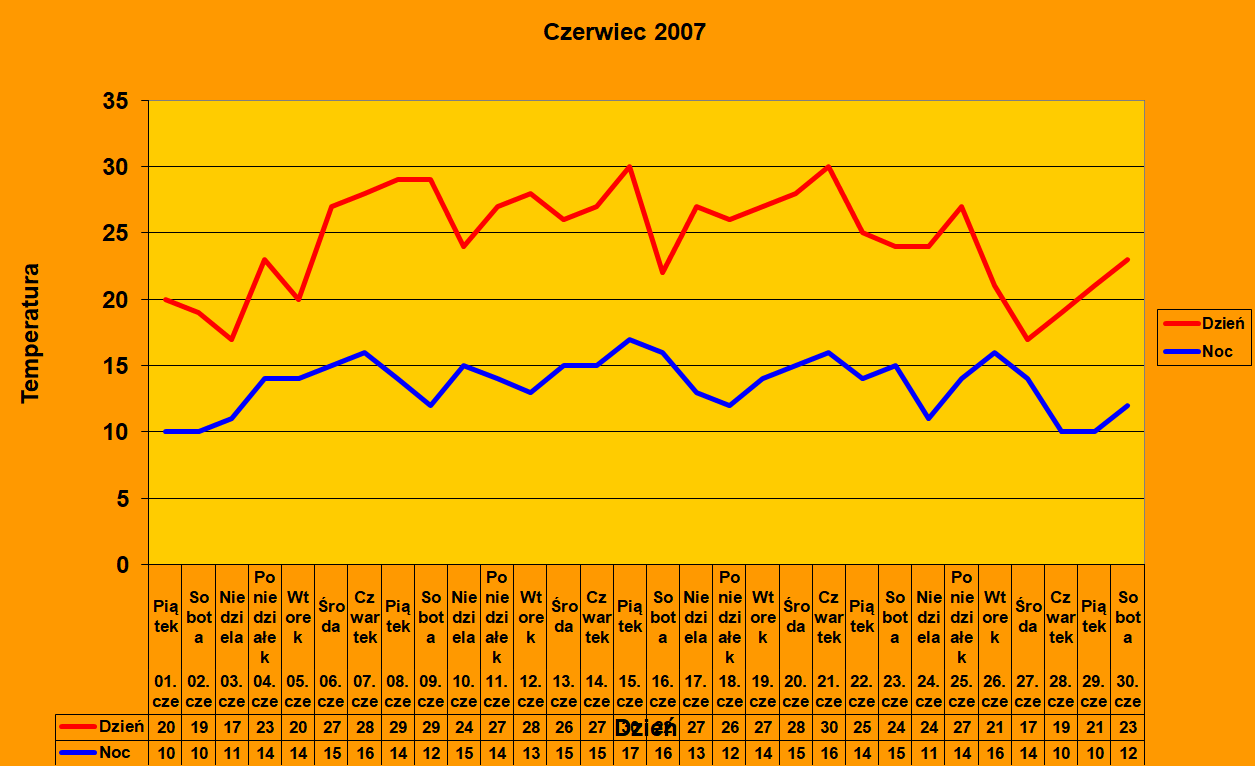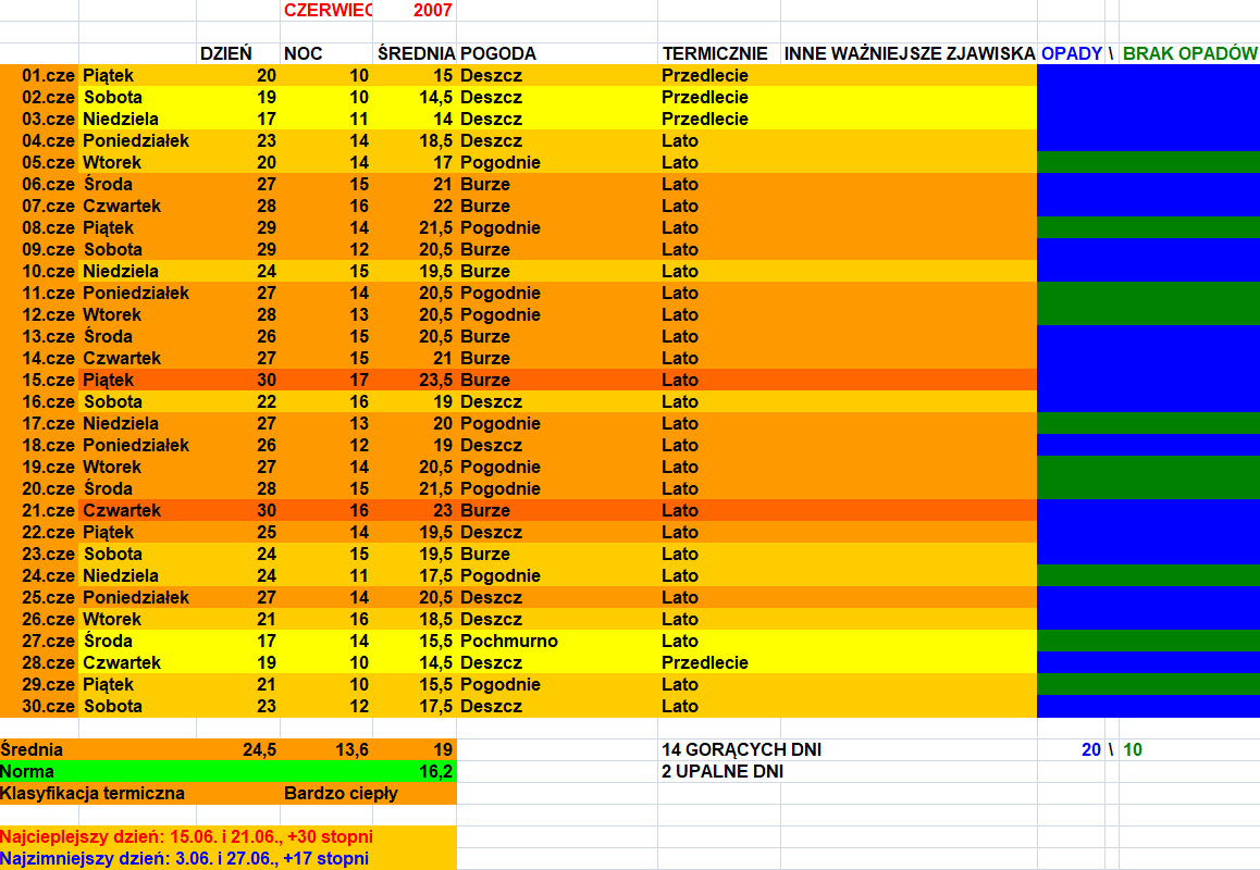 Poza nieudaną pierwszą pentadą, oceniam ten miesiąc bardzo pozytywnie, głównie za sprawą burz :) Było ich naprawdę dużo, co nie przeszkadzało wysokiemu usłonecznieniu i wielu pięknym dniom z prawdziwie wakacyjną pogodą w moim rozumieniu, choć najlepiej zapamiętany przeze mnie dzień zakończenia roku szkolnego był akurat taki sobie :) Upałów w czerwcu 2007 roku było niewiele - tylko dwa dni, z czego jeden z nich przyniósł również burzę. Opady wyszły tylko minimalnie poniżej normy, czyli naprawdę dobry wynik jak na bardzo ciepły i pogodny początek jednego z najbardziej "letnich" lat w moim mieście :D