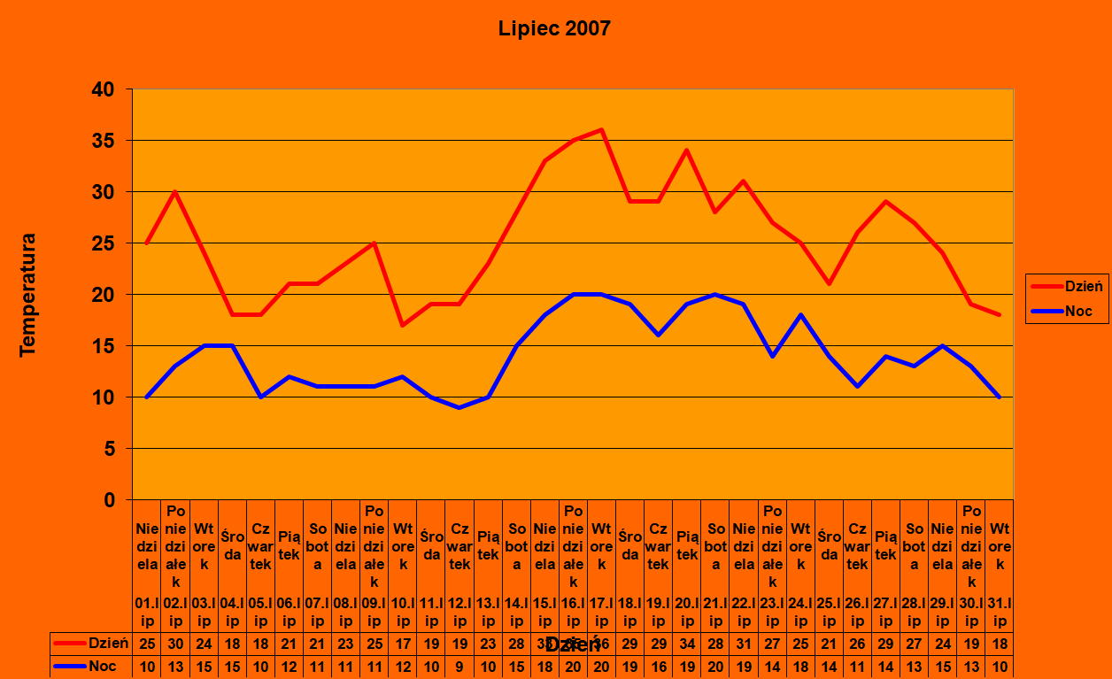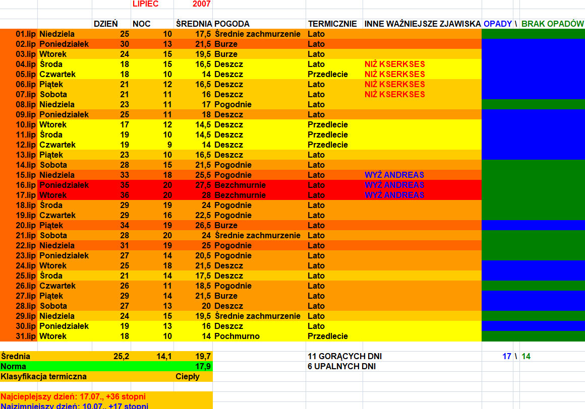 Najgorętszy pod względem średniej dobowej dzień lipca 2006 zająłby w lipcu 2007 dopiero piąte miejsce :/ Strasznie niewydarzony miesiąc. To była pierwsza fala upałów, podczas której naprawdę czułem że jest o wiele za ciepło. Pamiętam też jedną dość gwałtowną burzę z upalnego dnia, ale nie mam pewności co do daty (na pewno w tygodniu, a nie w weekend). W każdym razie pioruny biły mocno i wystąpiła ulewa, lecz raczej krótka.