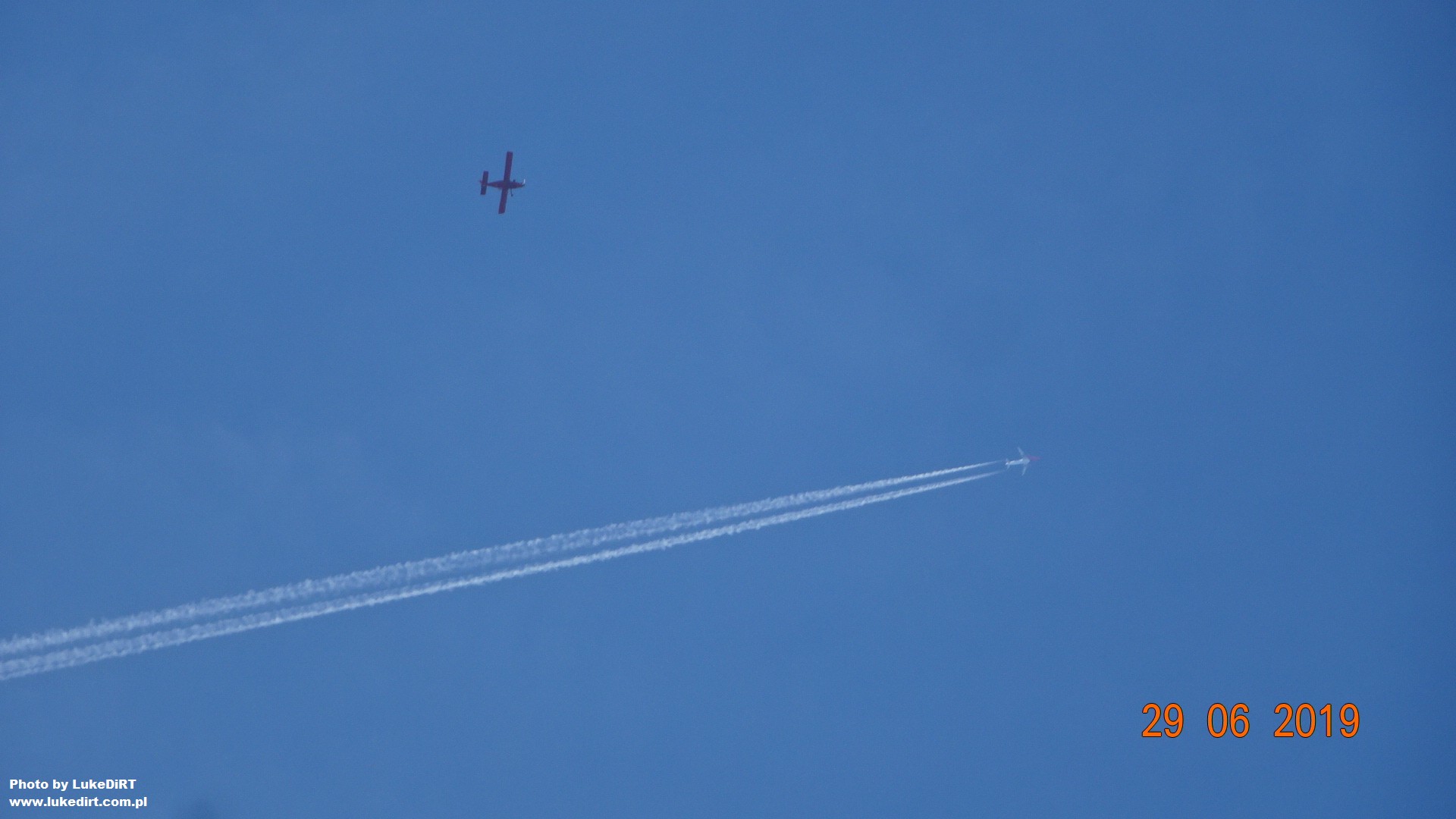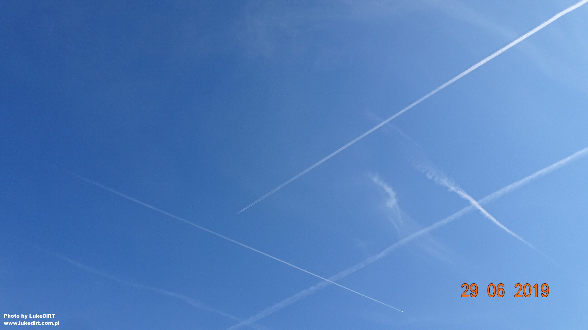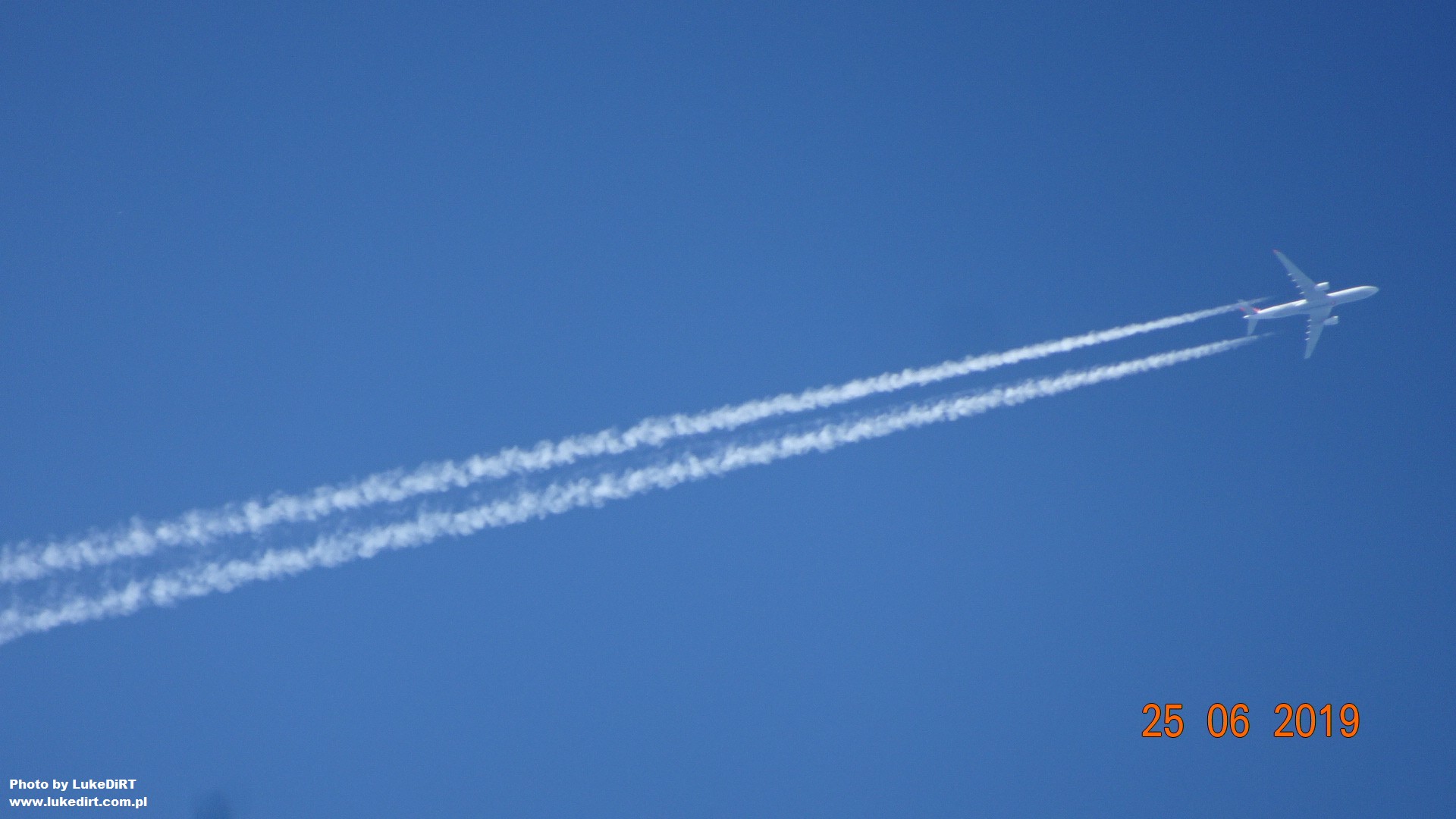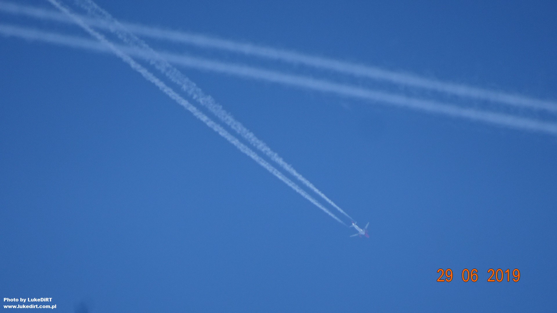 Dziś (29 czerwca) ruch lotniczy znów jest potężny, a korzystne warunki atnosferyczne sprawiają, że samoloty zostawiają po sobie mnóstwo smug kondensacyjnych. Poniższe zdjęcie zrobiłem dosłownie chwilę temu, widać na nim prawdziwe "skrzyżowanie" powietrznych korytarzy nad Nowym Sączem. Najgrubsza smuga pochodzi od Airbusa A380 Emirates lecącego z San Francisco do Dubaju (jedna z najdłuższych tras na świecie, 16 godzin lotu), samolot dolatujący do prawego dolnego rogu zdjęcia to Airbus A330-200 Turkish Airlines z Berlina do Stambułu (taki jak ten uwieczniony przez Ciebie), zaś trzecią smugę spowodował najmniejszy z tej trójki Boeing 737-800 skandynawskich linii lotniczych SAS przelatujący z greckiej Kavali na lotnisko Arlanda w Sztokholmie.