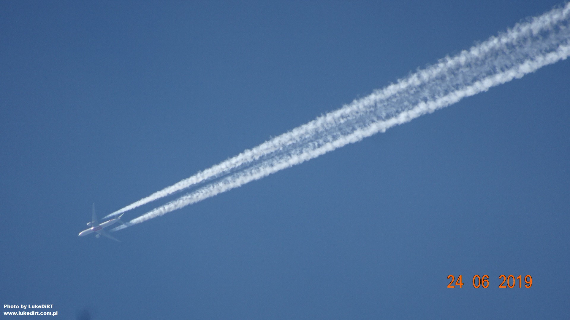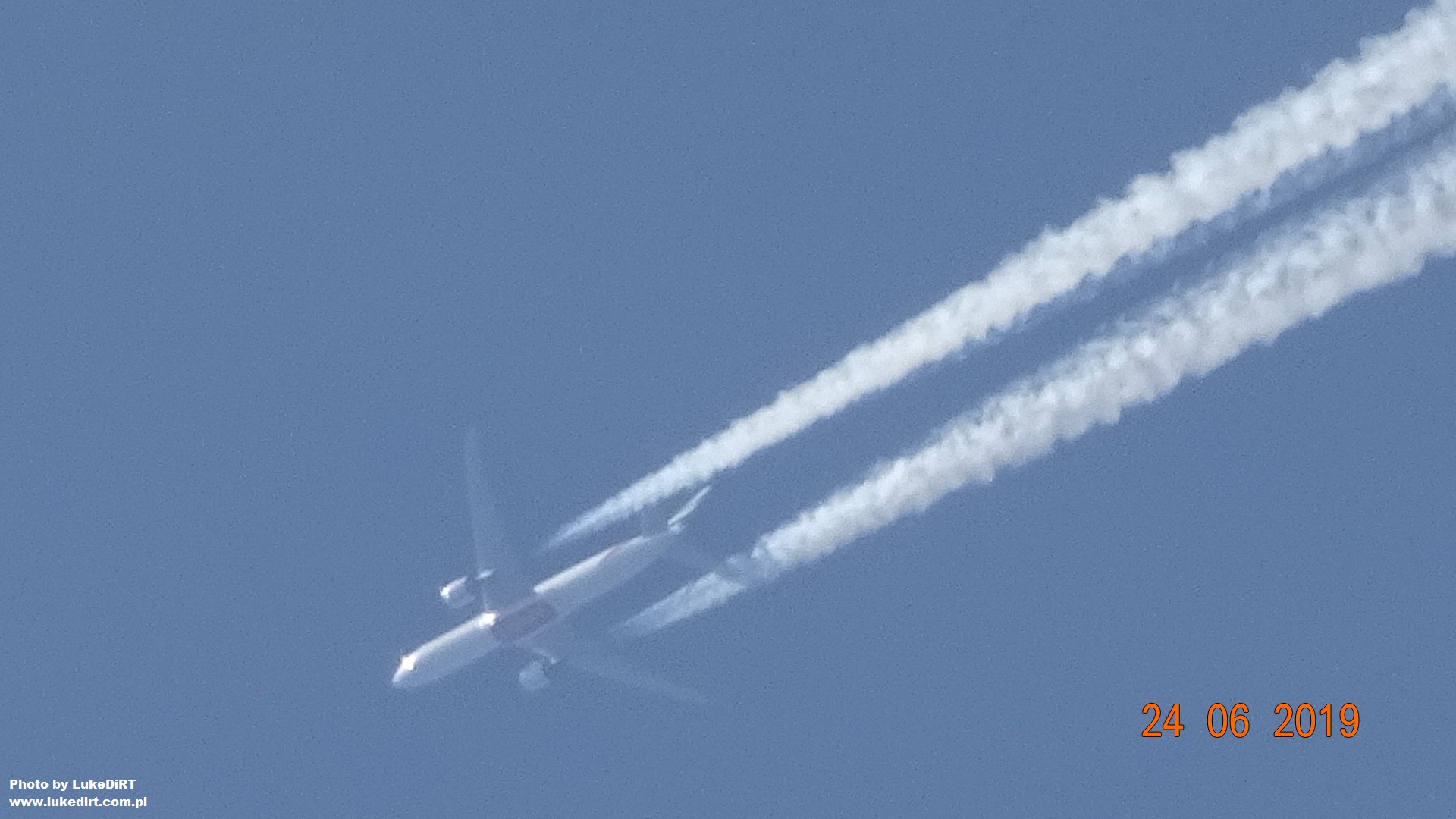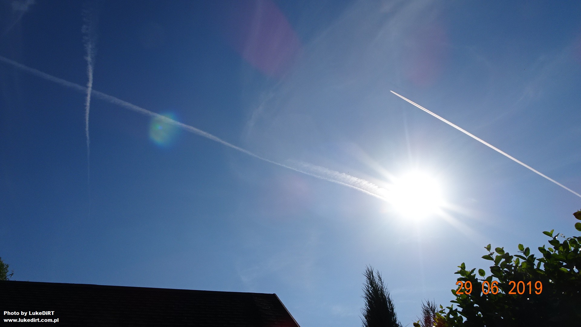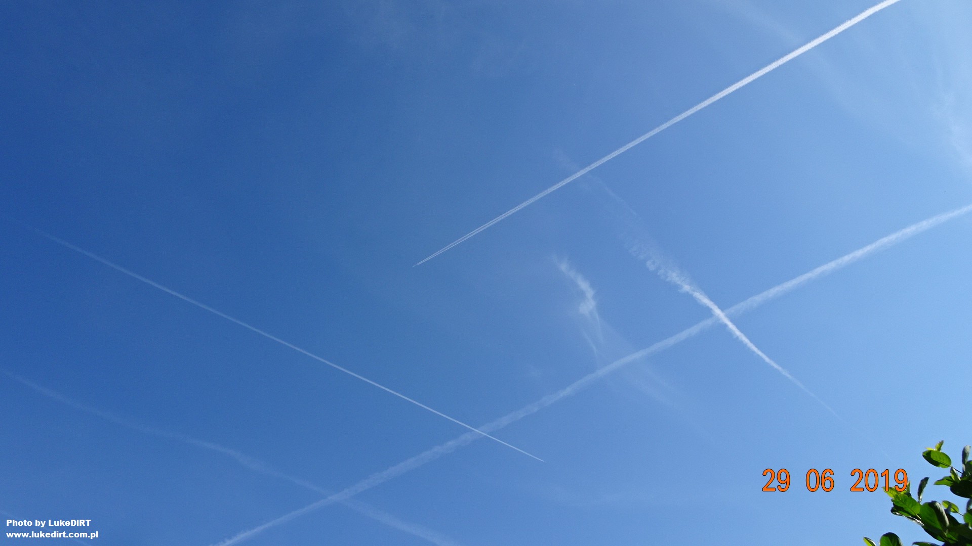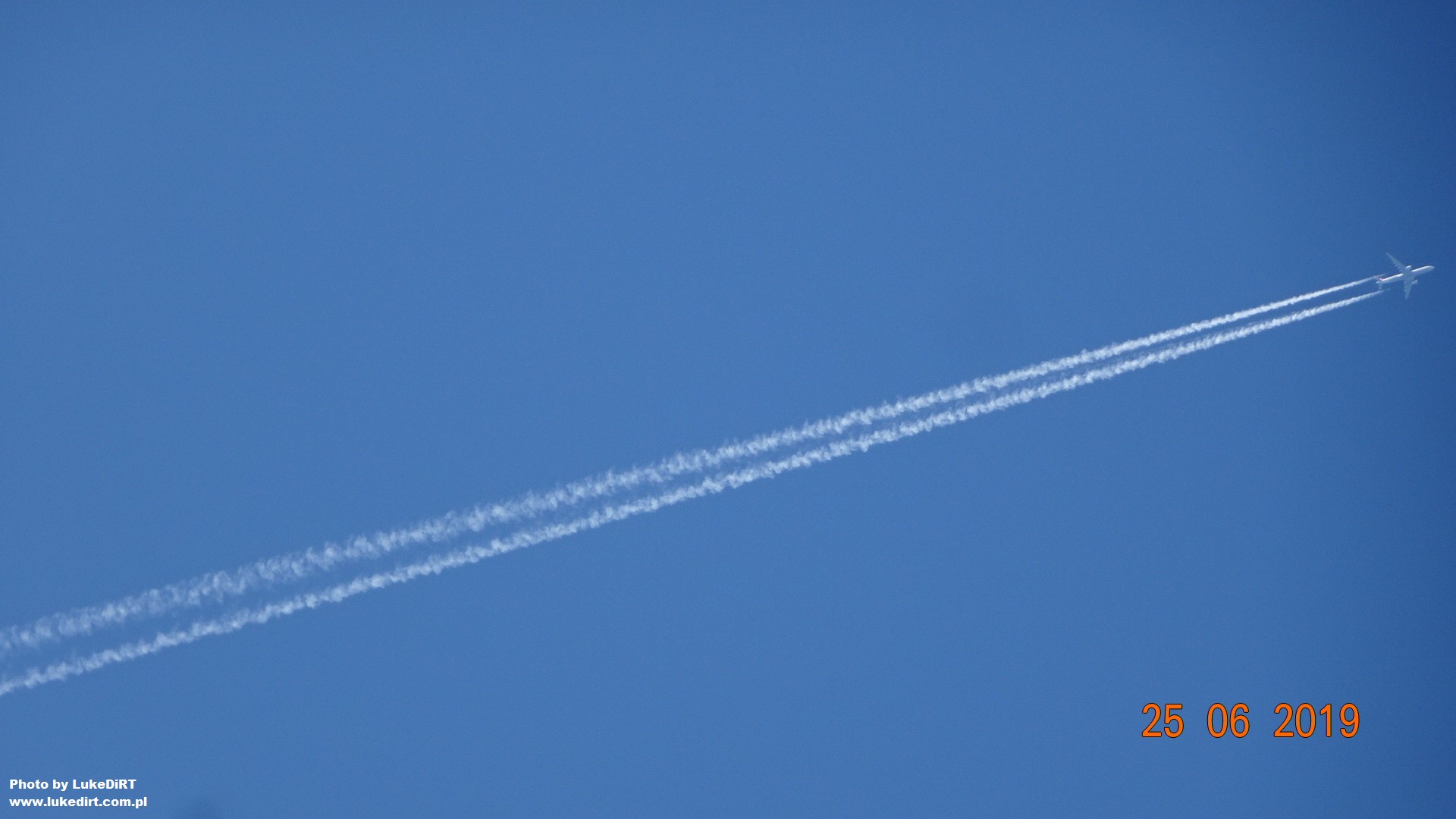 Dziś (29 czerwca) ruch lotniczy znów jest potężny, a korzystne warunki atnosferyczne sprawiają, że samoloty zostawiają po sobie mnóstwo smug kondensacyjnych. Poniższe zdjęcie zrobiłem dosłownie chwilę temu, widać na nim prawdziwe "skrzyżowanie" powietrznych korytarzy nad Nowym Sączem. Najgrubsza smuga pochodzi od Airbusa A380 Emirates lecącego z San Francisco do Dubaju (jedna z najdłuższych tras na świecie, 16 godzin lotu), samolot dolatujący do prawego dolnego rogu zdjęcia to Airbus A330-200 Turkish Airlines z Berlina do Stambułu (taki jak ten uwieczniony przez Ciebie), zaś trzecią smugę spowodował najmniejszy z tej trójki Boeing 737-800 skandynawskich linii lotniczych SAS przelatujący z greckiej Kavali na lotnisko Arlanda w Sztokholmie.