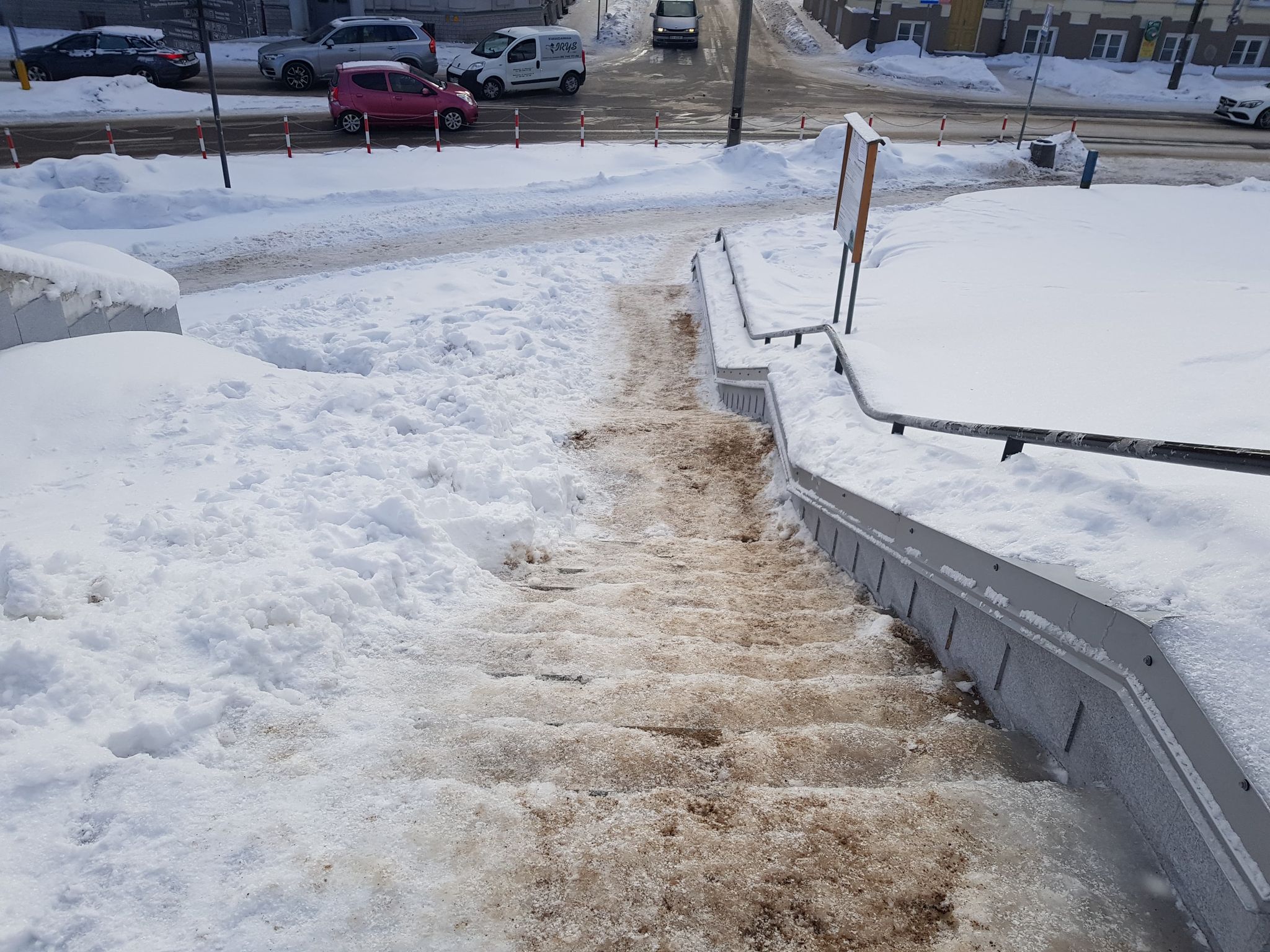 Odśnieżanie dróg, chodników i ścieżek WZOROWE, nawet schodki zabezpieczone piaskiem.