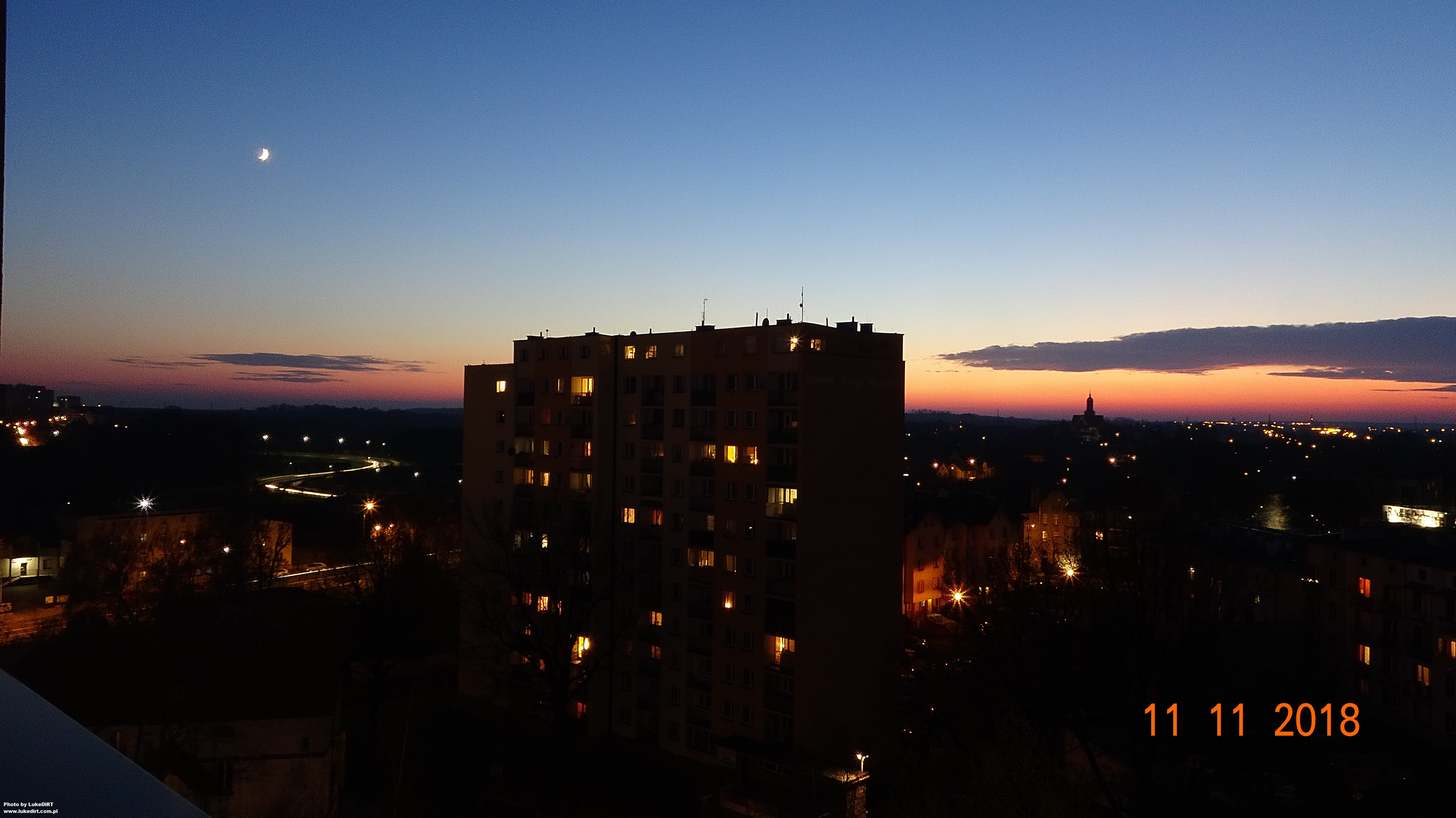 To był piękny dzień, ukoronowanie wspaniałej, jedynej w swoim rodzaju rocznicy. U mnie ten dzień był wręcz lampowy, idealny do aktywności na zewnątrz, z aurą przypominającą bardziej październik. Piękne zdjęcia, po światłach samochodów widzę dłuższy czas naświetlania. U mnie niebo może nie było tak bezchmurne, ale wiecxorem zostało bardzo fajnie przyozdobione przez małe chmurki. Poniższe zdjęcie wykonałem właśnie tego wieczora.