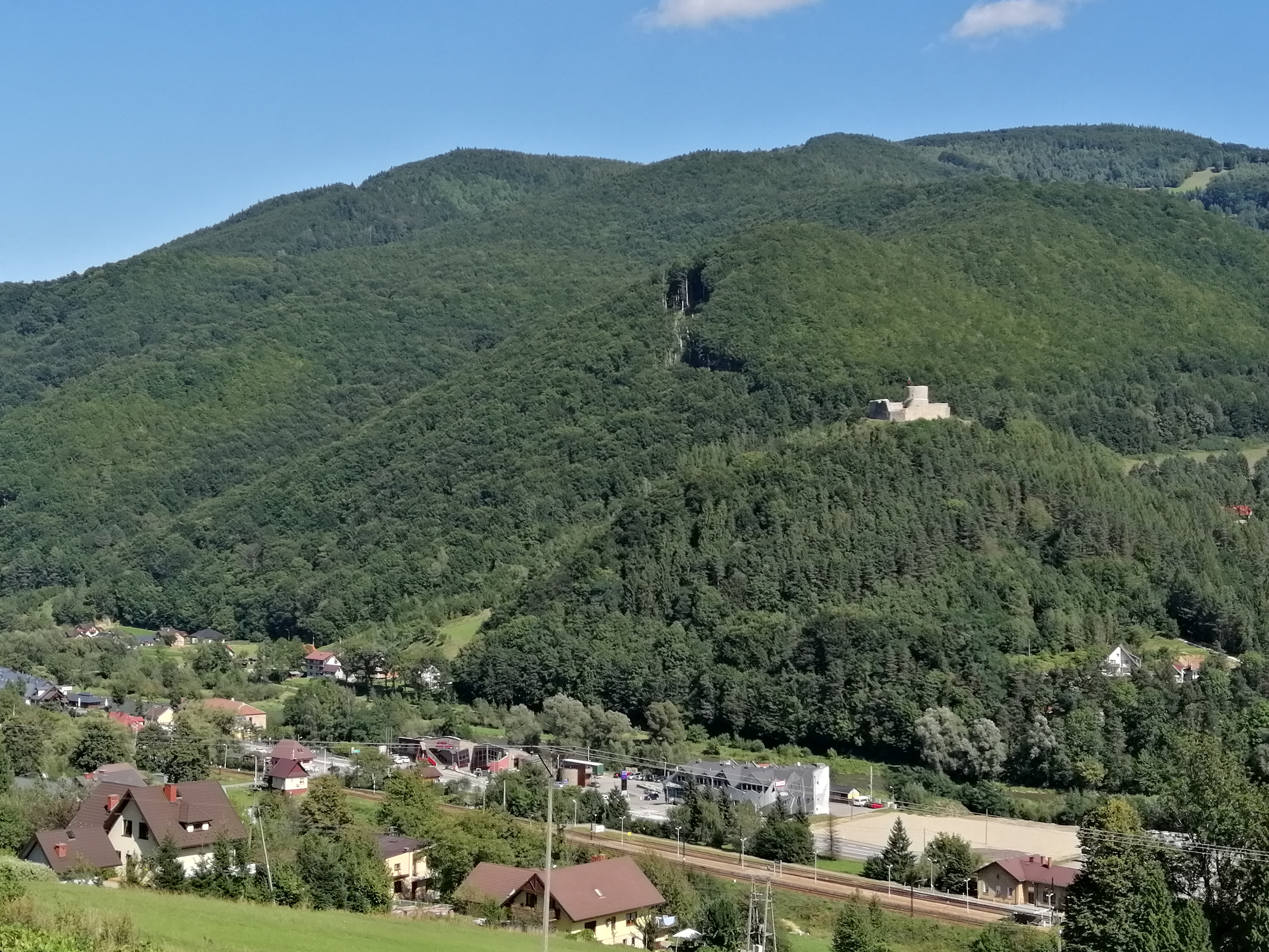 Na drugim zdjęciu na przeciwległym wzgórzu widać ruiny średniowiecznego (datowanego na początek XIV wieku) zamku rycerskiego.